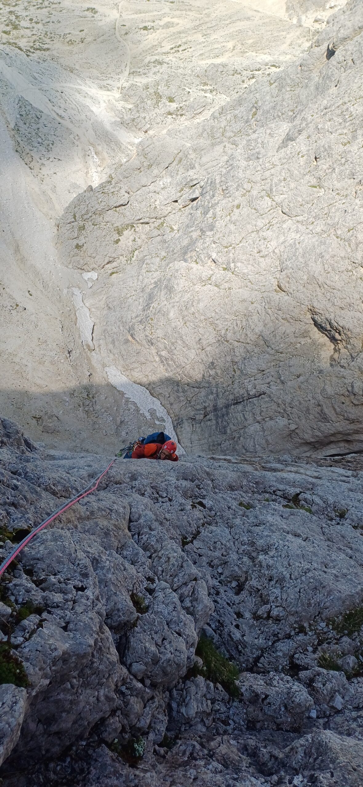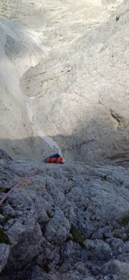 - L6= 40m; salire direttamente la rampa/diedro fino al suo termine; quando questa si stringe e diventa fessura. Larga cengia, sosta da attrezzare su spuntone. IV+