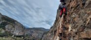 - L4: Seguire la fessura che diventa via via più larga e svasa, a seguire breve corda fissa. Sosta su comodo terrazzo. 20 m 6b (6a A0)