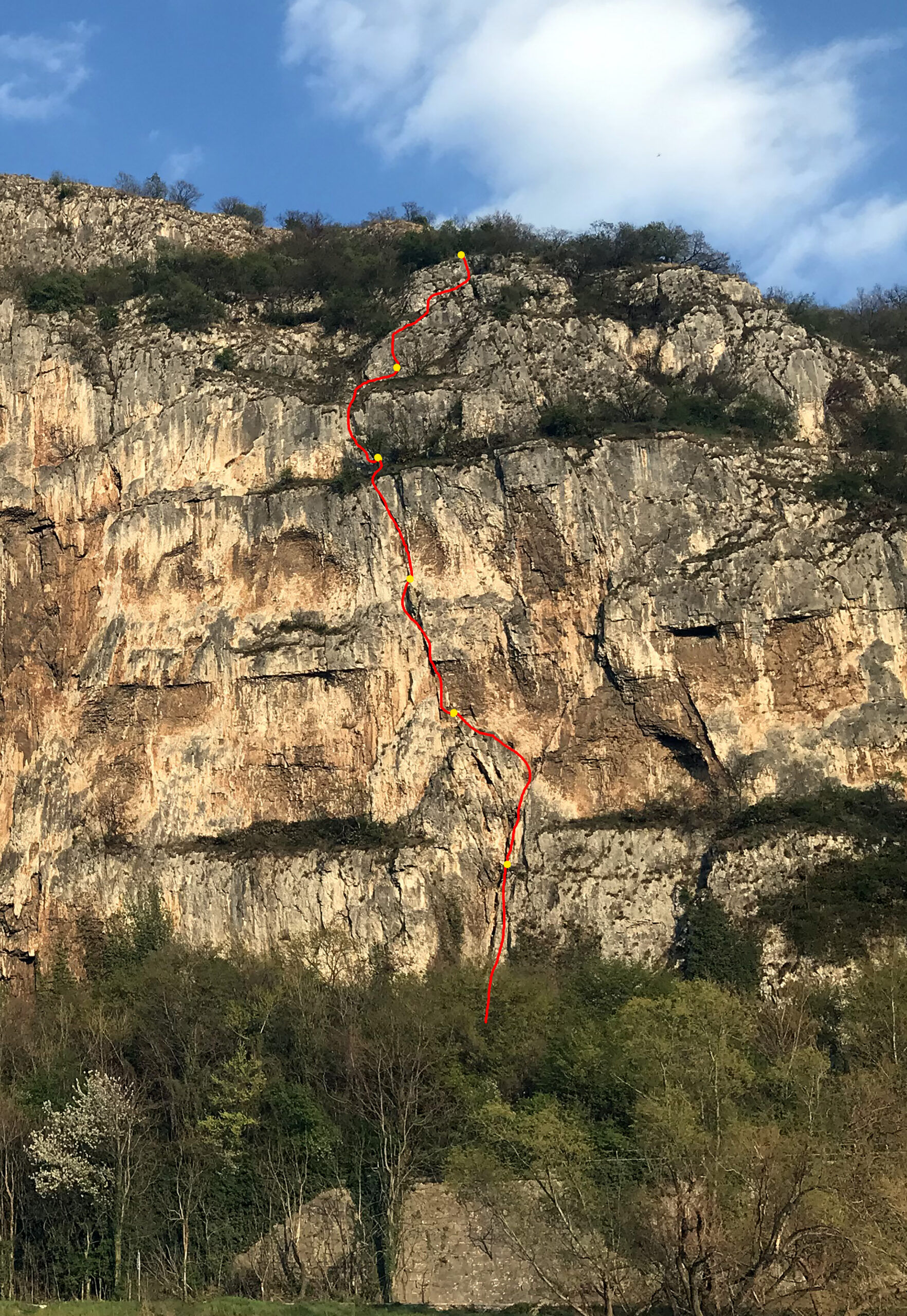 - L2: Verticalmente su fessura poi placca tecnica, un cambio di pendenza verso sinistra permette di accedere ad una cornice che conduce in sosta su comodo terrazzo, sosta con anello per calata. Tiro delicato. 20 m V+