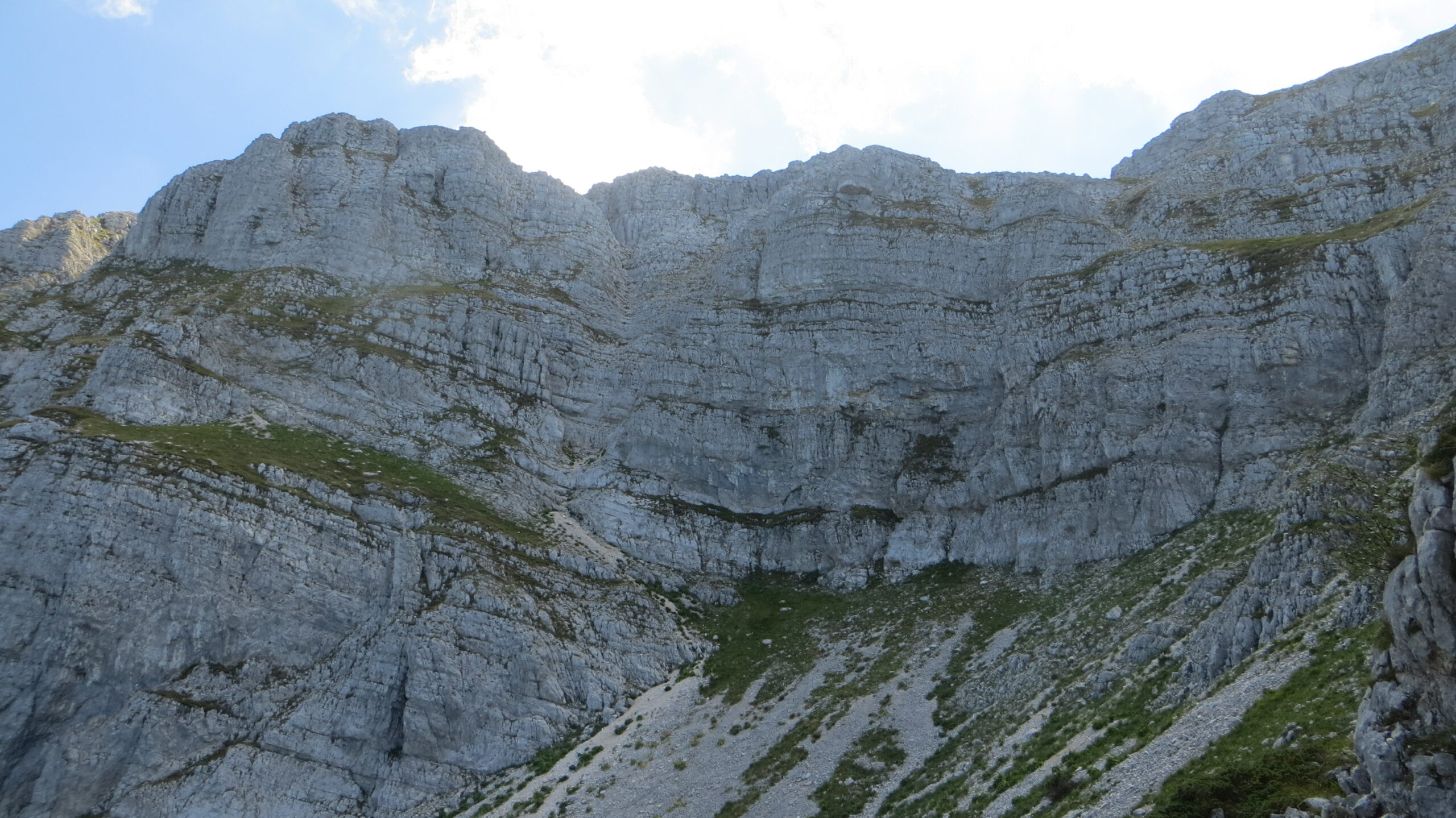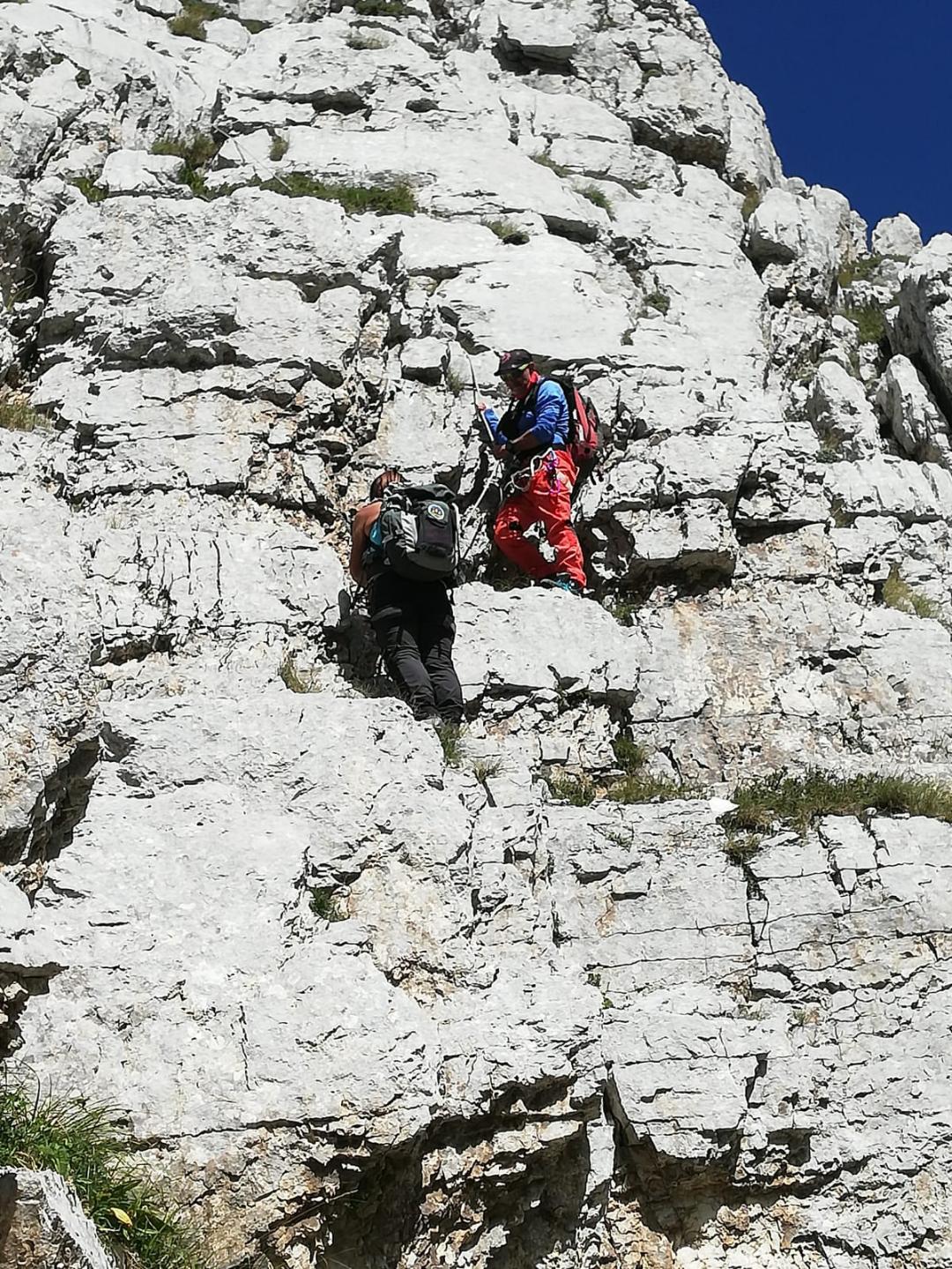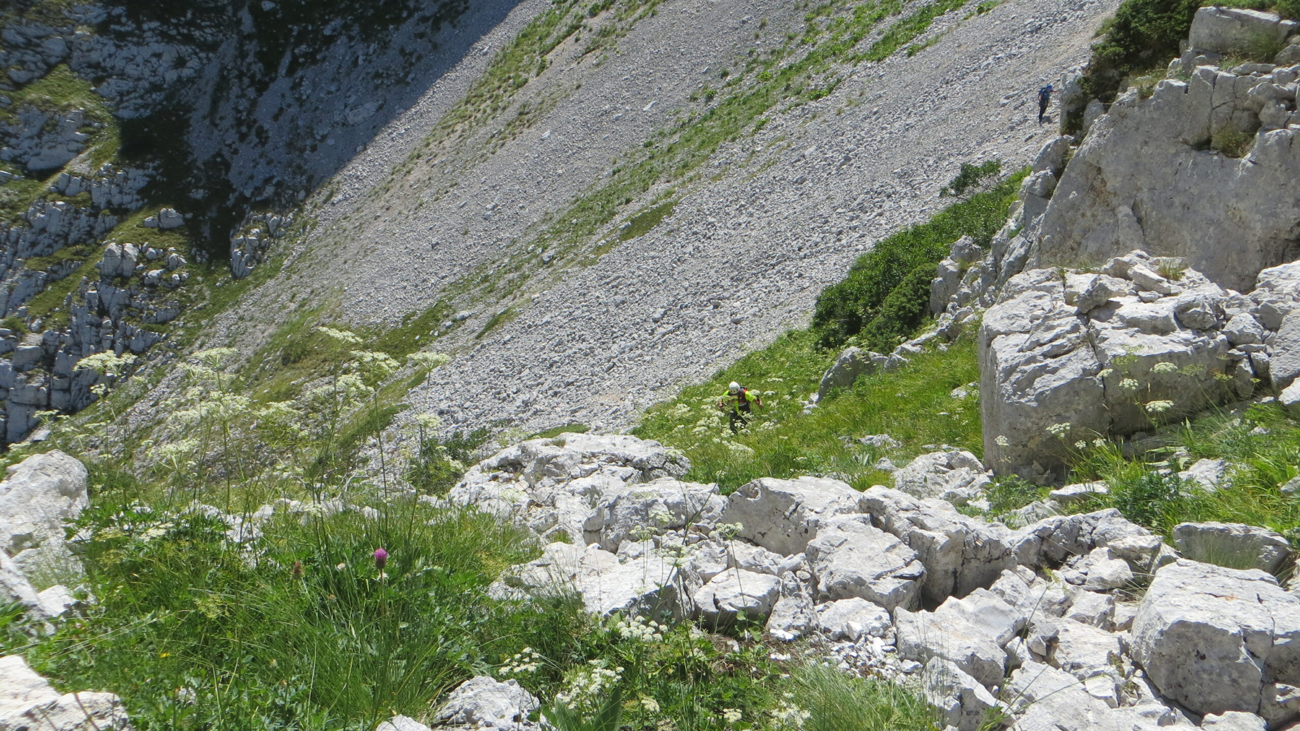 Comunque si sia giunti alla larga Sella del Tempio di quota 2252m, affacciandosi nel vallone sottostante, direzione Nord, si nota chiaramente il difficile anfiteatro da riscendere e l’evidente torrione, meta dell’itinerario (il Tempio). Appena imboccata la valletta si inizia la discesa a serpentina seguendo gli omini di pietra, destreggiandosi tra canalini da discendere, cenge erbose da percorrere, costoni da superare ecc. Si scende infine un lungo canalino a destra fino alla base Sud-Est del torrione; si risale a sx e si raggiunge una selletta alla base della parete Sud del Tempio a quota 2060 m circa (50 minuti – discesa 200 metri ).