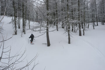 Salita sotto una debole nevicata, ma che tira giù quel che basta per sciare nella polvere! Ripello di 300m finale perché alcune conche erano davvero troppo belle. Bosco finale con poca neve, sopravvivenza pura.