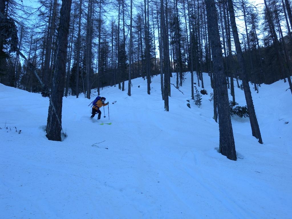 Breve discesa fantastica sulla sud e poi di nuovo mille metri di farina nella foresta..La ripidissima spalla finale (BS+) è aggirabile a sx. come descritto nella relazione originale.Oggi sempre con mark in via di recupero…