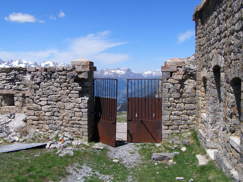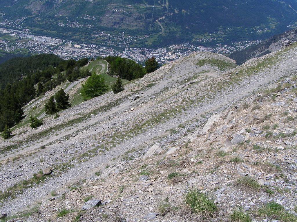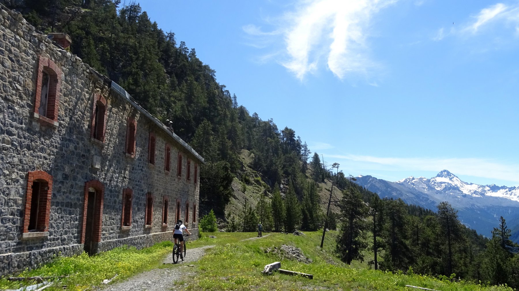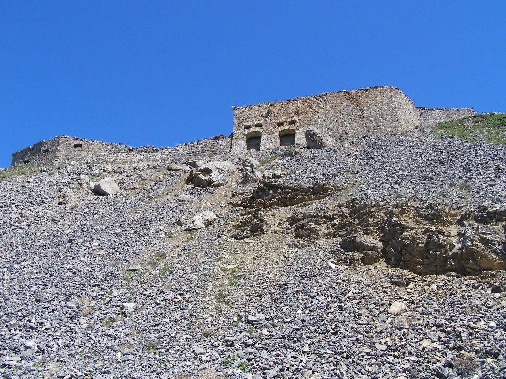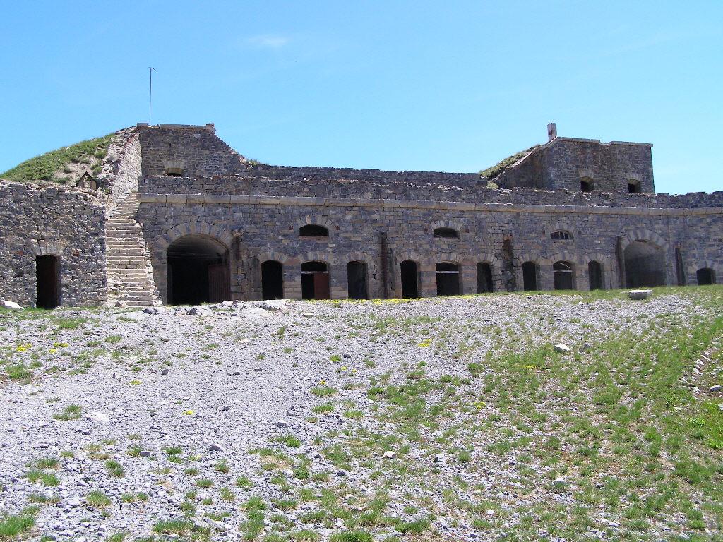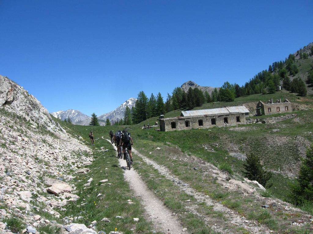 Qui è facile sbagliare, si deve proseguire in leggera salita verso il Fort Dauphin, a sinistra. Si entra nel bosco con un tratto pianeggiante fino a portarsi sopra il fossato del forte. Ora si deve seguire una stradina inizialmente un po’ sassosa in salita (non proseguire lungo quella che scende), poi dopo pochi metri il fondo migliora. Un tratto un po’ impegnativo precede lo sbocco sulla vera strada che sale nel Bois de l’Infernet, d’ora in avanti non ci si può più sbagliare. Si sale con pendenza regolare mai troppo difficile nel bosco, con una serie di tornanti infinita. Sbucati in una radura nei pressi di le Clot de l’Infernet, inizia una lunga tagliata proprio sotto la cima, che aggira tutta la montagna portandosi sul versante sud, a la Seyte, dove sorgono tantissime caserme militari, alcune delle quali diroccate. Si continua a salire, per un tratto si dovrà portare la bici a mano perchè la strada è franata, ma ben presto ci si può riportare in sella, anche se alcuni tratti sono ormai ridotti a sentiero (pedalabilissimo). Dopo altri tornanti si perviene al bivio che seguendo in salita a sinistra conduce alla sommità del Fort de l’Infernet m.2377, si arriva in sella (salvo alcuni brevi tratti) fino al cancello d’ingresso. Qualche cautela nel passare sul ponte in cattive condizioni e finalmente si è dentro il forte, diviso su più ripiani, alcuni edifici sono in ottimo stato.
