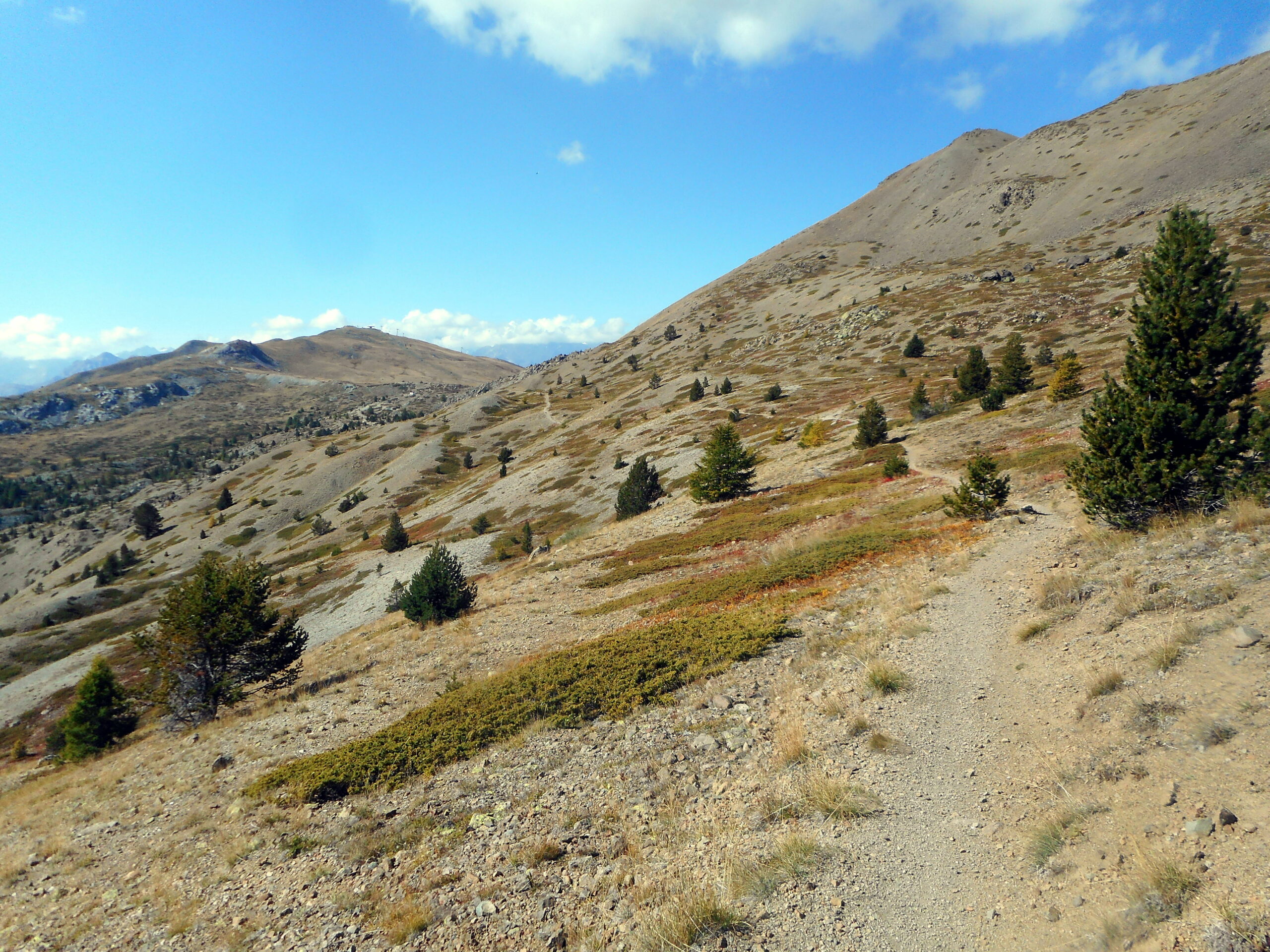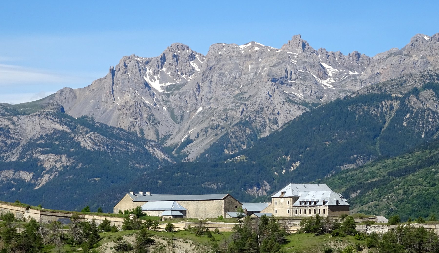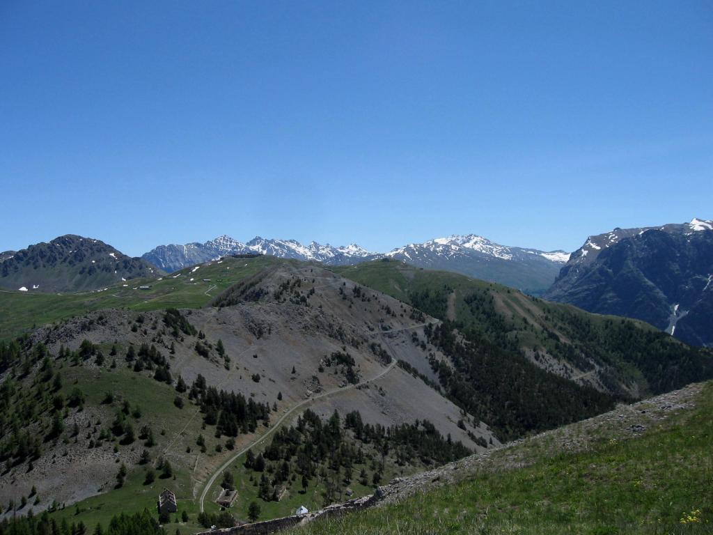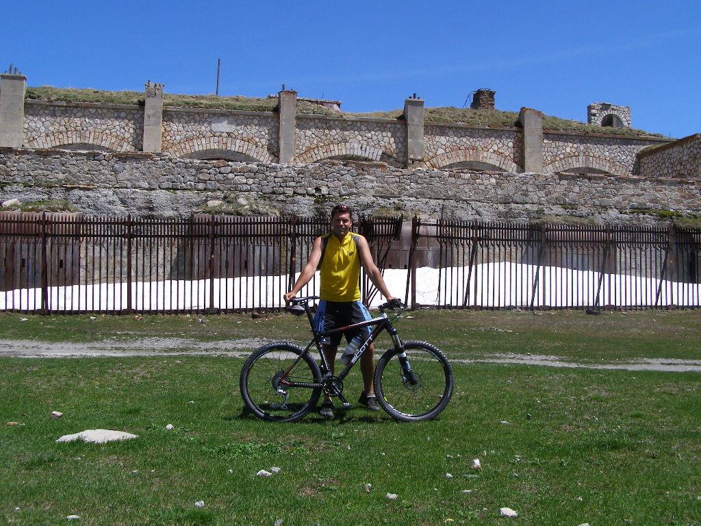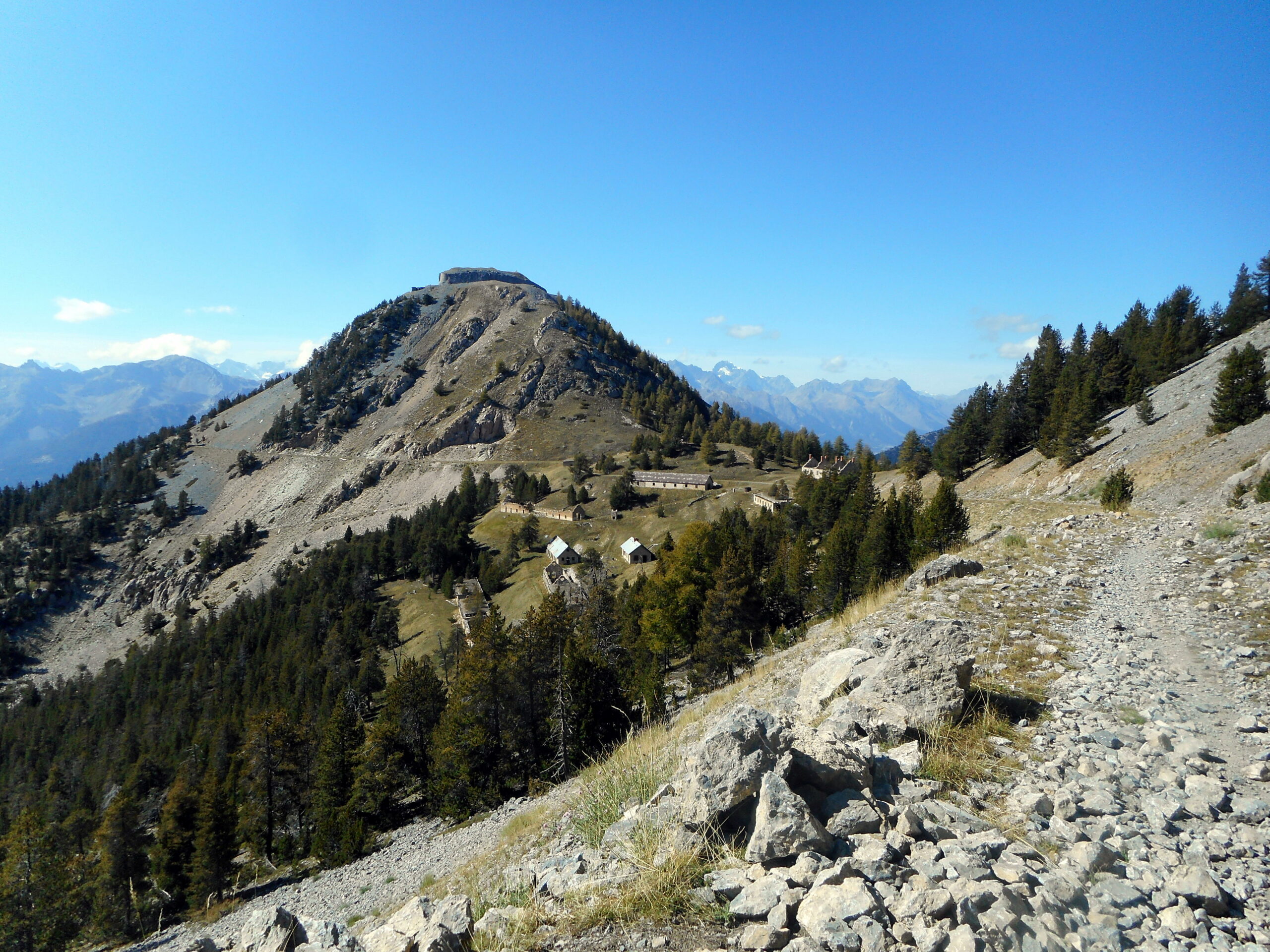 Qui è facile sbagliare, si deve proseguire in leggera salita verso il Fort Dauphin, a sinistra. Si entra nel bosco con un tratto pianeggiante fino a portarsi sopra il fossato del forte. Ora si deve seguire una stradina inizialmente un po’ sassosa in salita (non proseguire lungo quella che scende), poi dopo pochi metri il fondo migliora. Un tratto un po’ impegnativo precede lo sbocco sulla vera strada che sale nel Bois de l’Infernet, d’ora in avanti non ci si può più sbagliare. Si sale con pendenza regolare mai troppo difficile nel bosco, con una serie di tornanti infinita. Sbucati in una radura nei pressi di le Clot de l’Infernet, inizia una lunga tagliata proprio sotto la cima, che aggira tutta la montagna portandosi sul versante sud, a la Seyte, dove sorgono tantissime caserme militari, alcune delle quali diroccate. Si continua a salire, per un tratto si dovrà portare la bici a mano perchè la strada è franata, ma ben presto ci si può riportare in sella, anche se alcuni tratti sono ormai ridotti a sentiero (pedalabilissimo). Dopo altri tornanti si perviene al bivio che seguendo in salita a sinistra conduce alla sommità del Fort de l’Infernet m.2377, si arriva in sella (salvo alcuni brevi tratti) fino al cancello d’ingresso. Qualche cautela nel passare sul ponte in cattive condizioni e finalmente si è dentro il forte, diviso su più ripiani, alcuni edifici sono in ottimo stato.