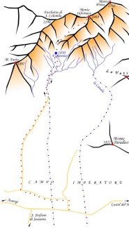 Seguire il sentiero a mezza costa che prima costeggia e poi scende verso il fosso, lo attraversa e poi risale, seguendo la pista verso l’acquedotto (alberello isolato) in direzione dell’evidente canale centrale.