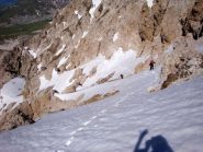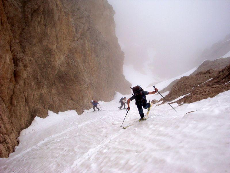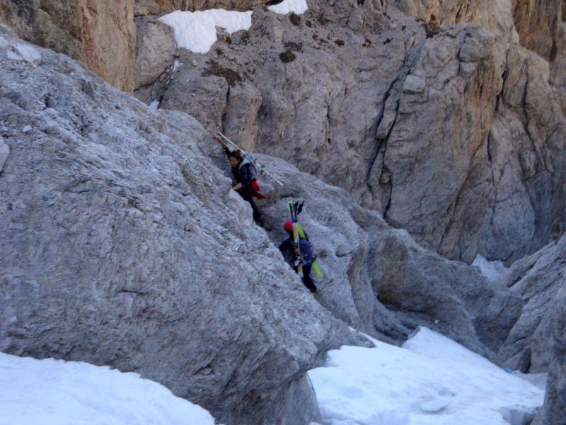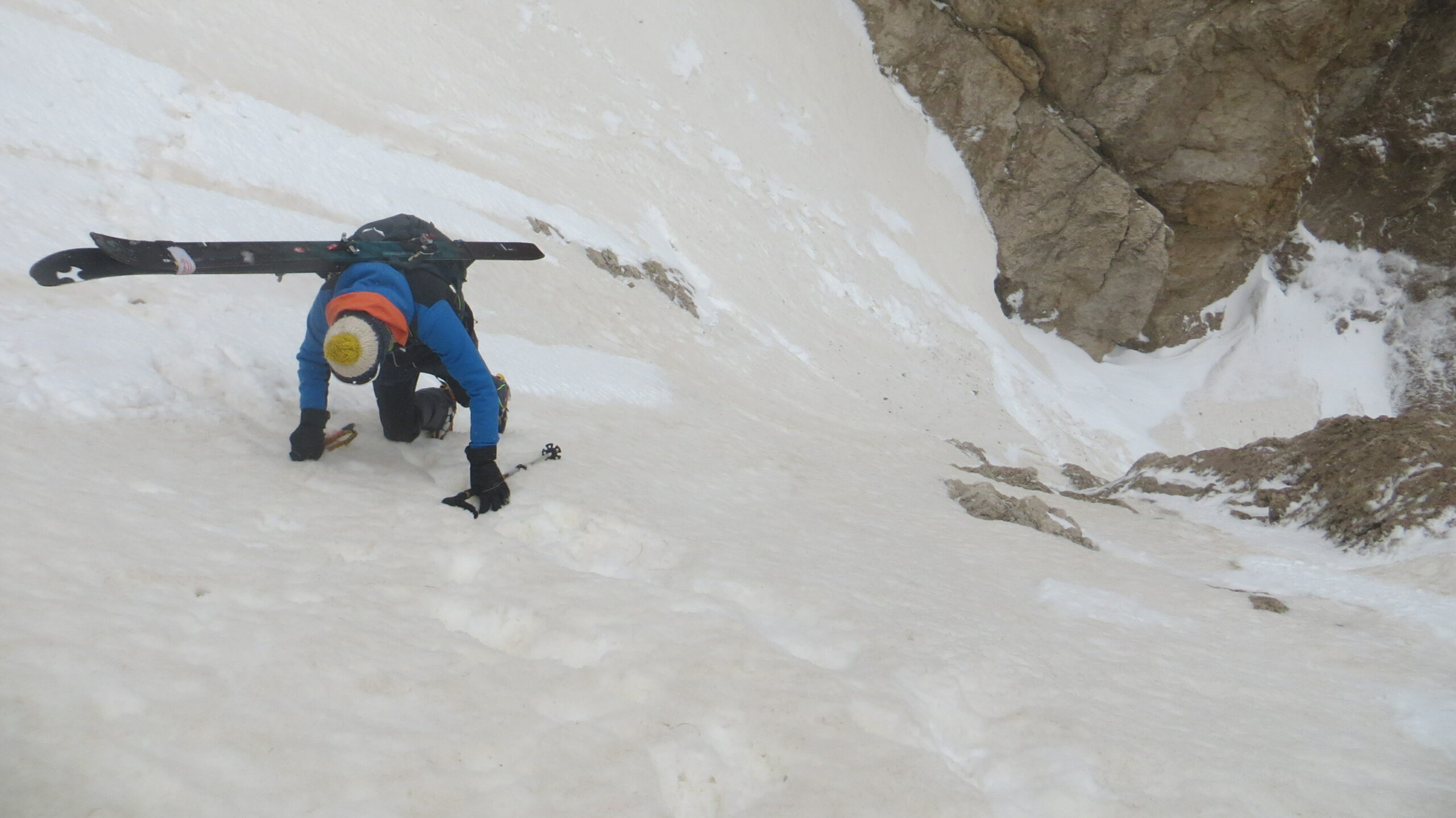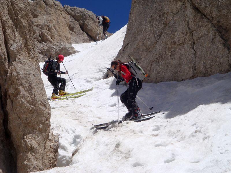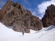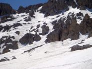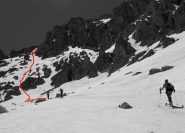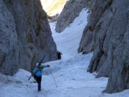 A fine primavera il canale principale (sx orografica)può presentare larghi crepacci ed è interrotto in corrispondenza delle due nette strettoie più ripide.