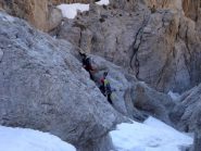 Ad una prima biforcazione evitare il ramo di destra e continuare nel canalone fino ad arrivare ad uno slargo con cascatella a 2100 m. circa che si può superare a sx circa 20 m. prima o a dx (II°).Proseguire fino ad una seconda biforcazione a quota 2200 m. circa.A sx 8ramo dx orografico della Y)si arriva in cresta dove passa il sentiero del Centenario.