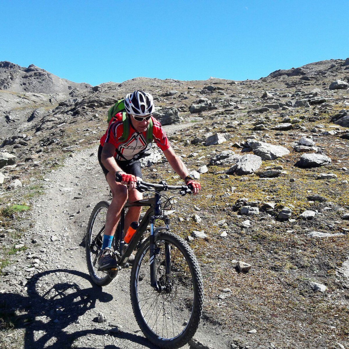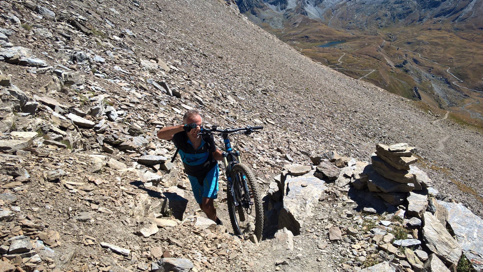 Discesa memorabile, per 2/3 su single track fantastico, a tratti ripido e veloce, poi una parte con gradoni rocciosi alternati a sentieri ben pedalabili, ultima risalita di 60mt e discesa senza problemi fino a Gimillan, poi per asfalto all’auto, insomma 1500mt di goduria.