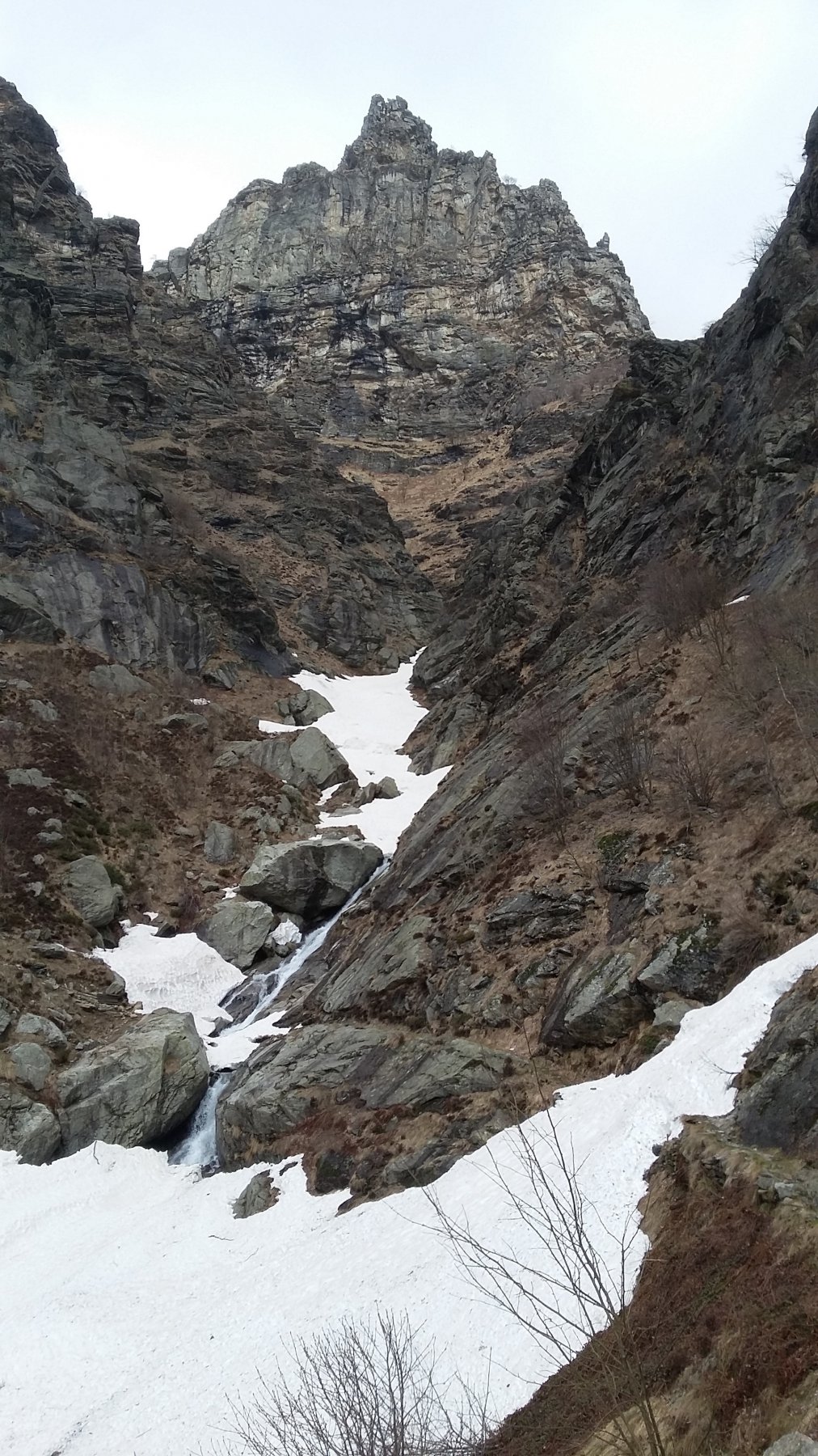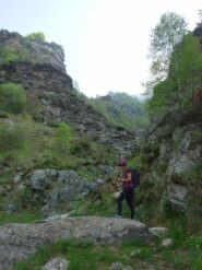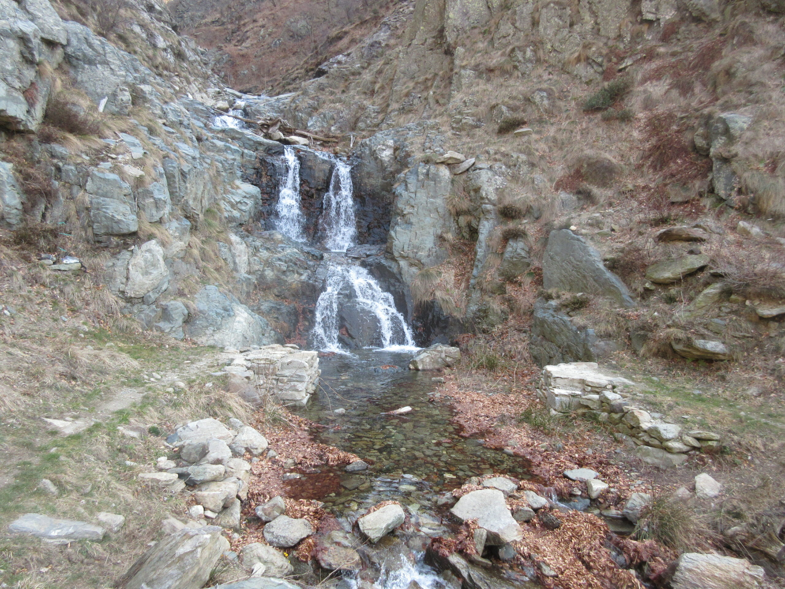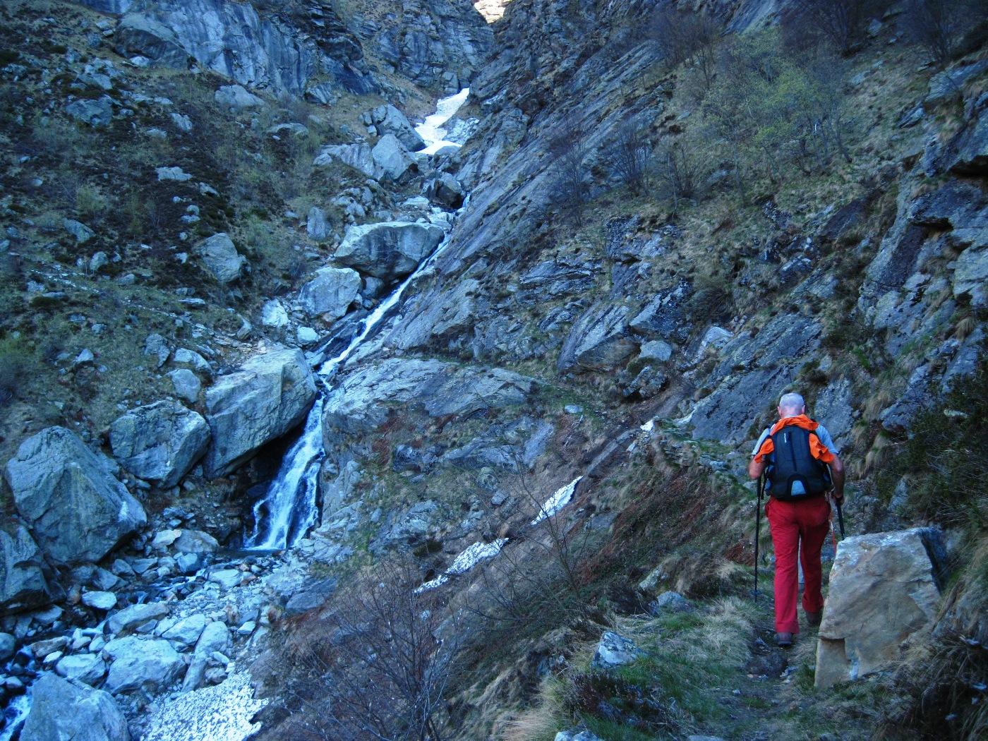 Ci si inoltra nel valloncello per superare un rio che forma sopra una bella cascata (ponte in legno attualmente smontato, forse per l’inverno- 16/4/2014). Si risale sull’opposta sponda dove la traccia si alza ripida. Con numerosi tornanti si perviene a un promontorio roccioso, passando sotto una ripida parete e attraversando un suggestivo passaggio tra due rocce con scritta l’altitudine (1440 m). Si oltrepassa una zona franata a cui segue nuovamente un lungo traverso ascendente che supera una comba (sorgente) che porta ad un ultimo promontorio roccioso. Un breve tratto in piano nella faggeta e l’attraversamento di una pietraia precedono di poco l’alpeggio di Barma d’Aut 1508 m.