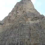 - L3: puntare alla cima dell’avancorpo, superando il diedro giallo a spuntoni sopra la sosta. Una volta raggiunta la cima dell’avancorpo (caratterizzata da un mugo secco), spostarsi verso dx di circa 5 metri, fino ad individuare un cordone posto sulla placca abbattuta. salire in verticale le placche per circa 10 metri, fino a sostare su un clessidra con cordone. -V 40 metri, 1 cordone