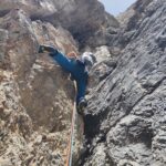 - L2: proseguire lungo la fessura, vincendo un altro strapiombino (cordone), poi dove la fessura si perde, proseguire obliquando leggermente verso dx, fino alla sosta su 3 chiodi. V+, 30 metri, 1 cordone