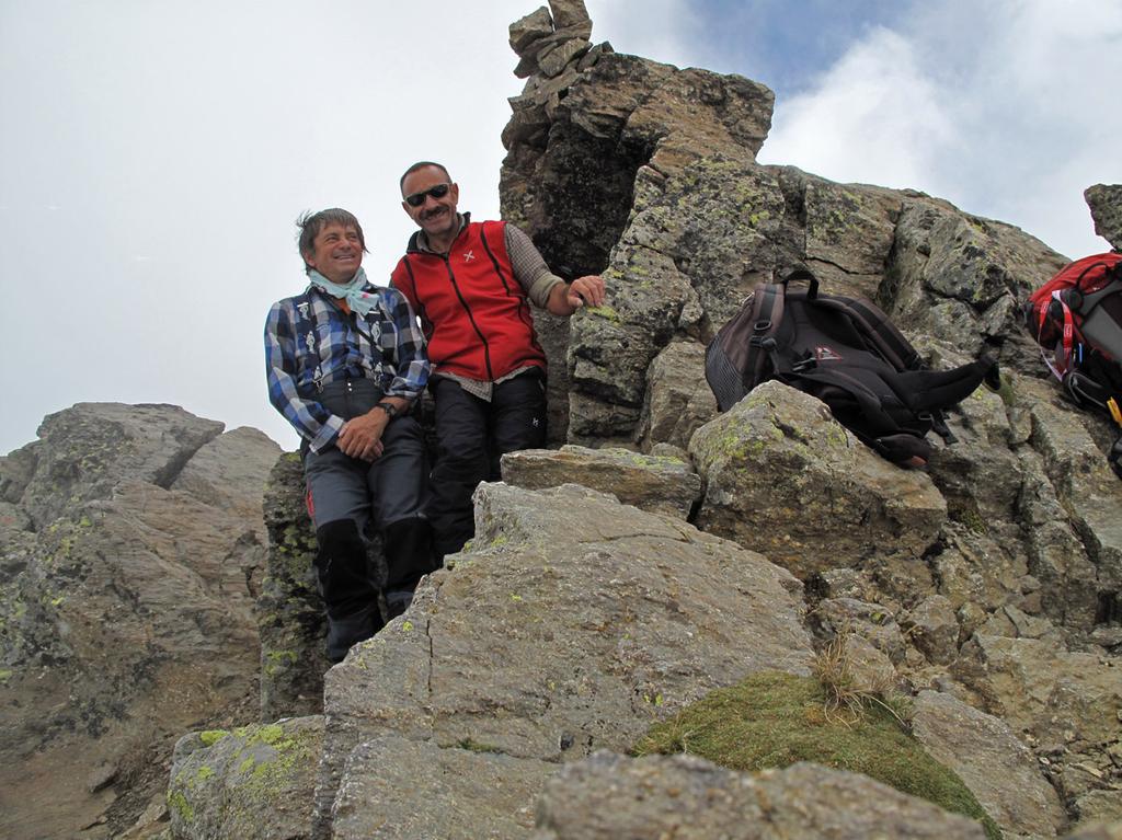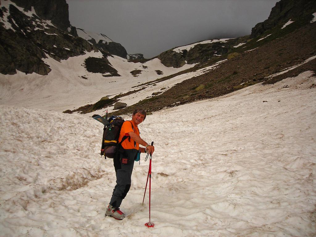 Anche oggi nessun rigelo, la neve è molle, ma non si sfonda, ed è ben sciabile. Si calzano gli sci a 2100m sopra il Lago Inferiore e si devono togliere per 10m per scendere nella conca del Lago Superiore. Dal Passo d’Ischiator alla cima si sale a piedi sulle roccette.