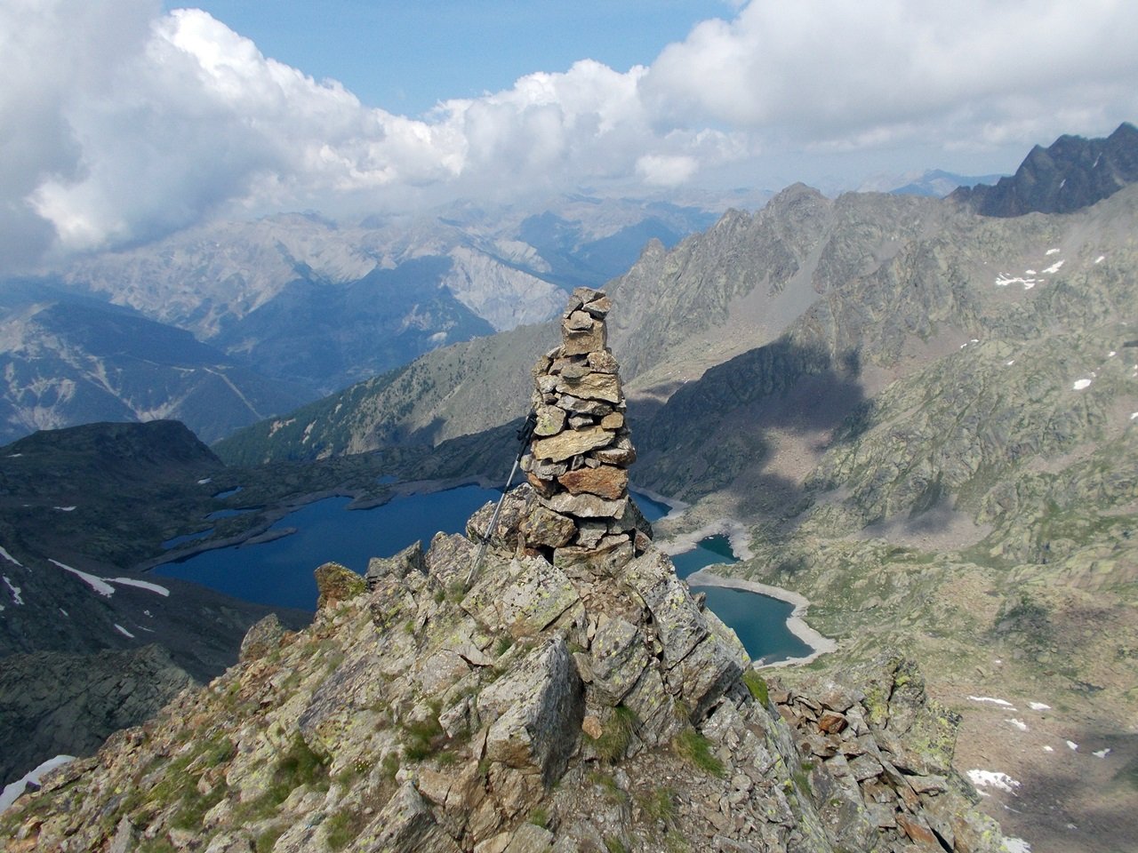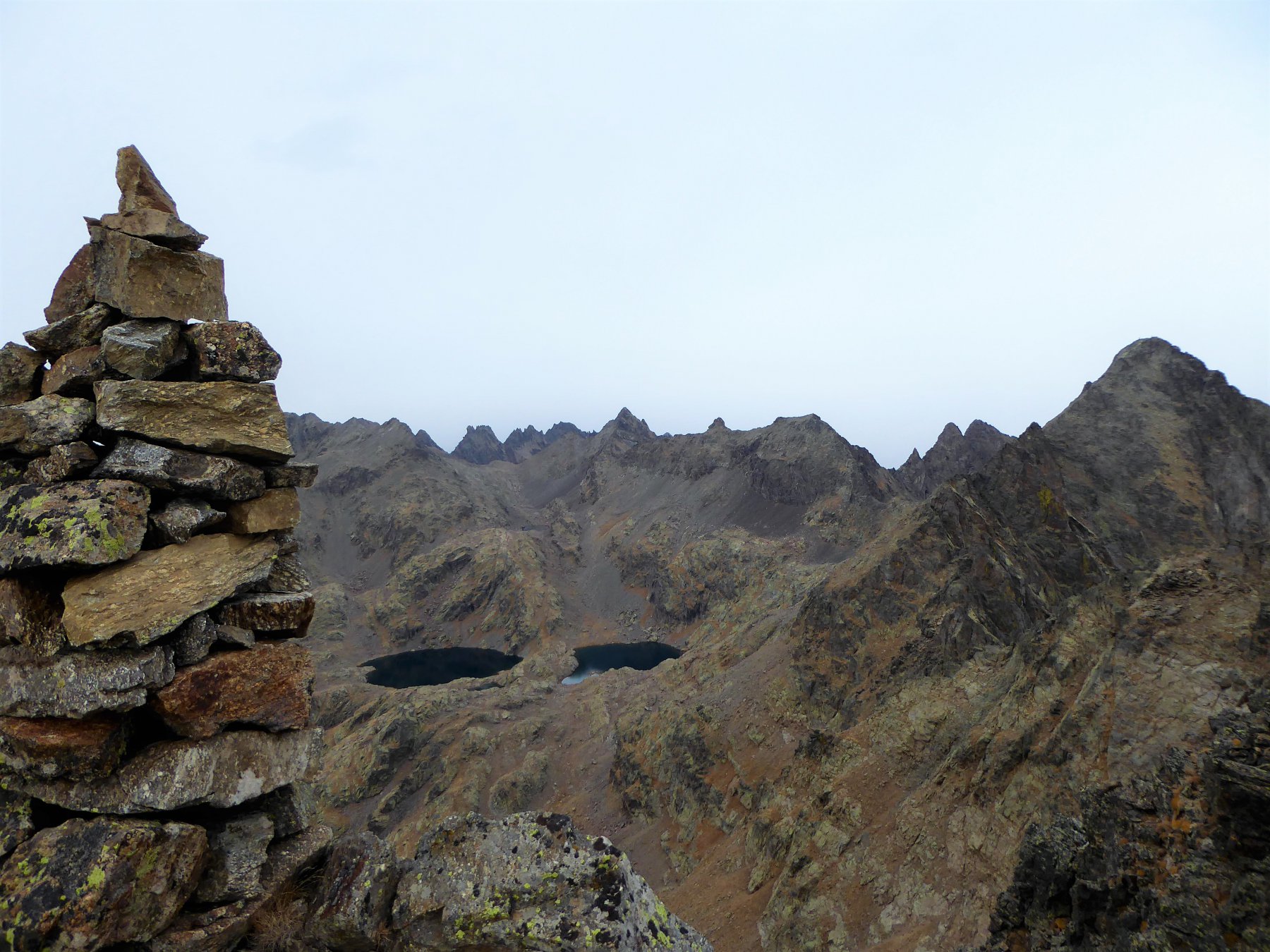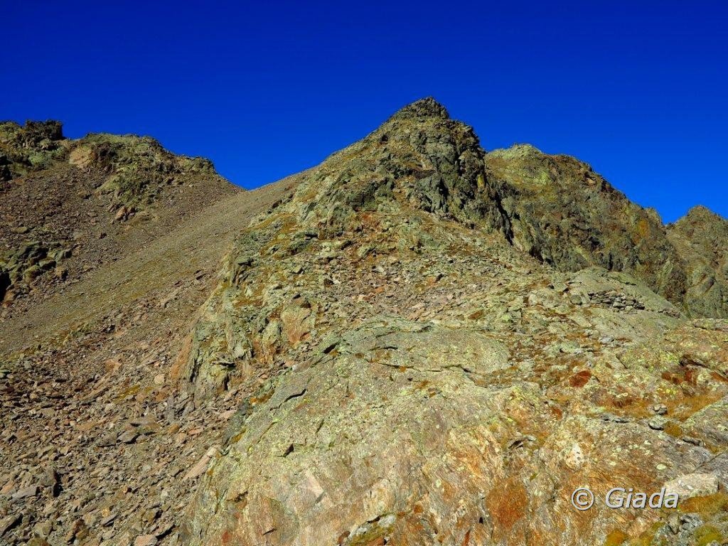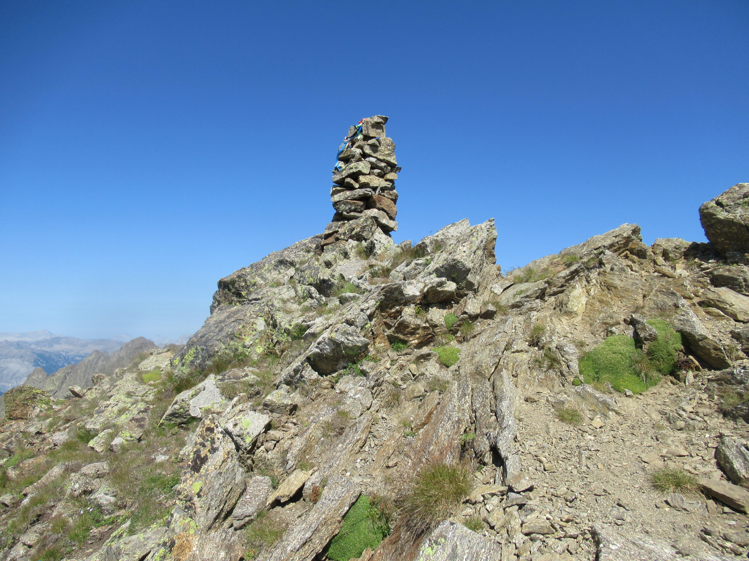 Persi pochi metri di dislivello scendendo verso il lago, si piega subito a destra iniziando una salita un po’ faticosa su detriti e pietre di piccole dimensioni. Va trascurato il bivio che subito si incontra per la Cima di Corborant continuando in ascesa lungo una specie di cengione, per poi affrontare il breve pendio che conduce al Passo d’Ischiator (piccolo ricovero diroccato). Da questo si piega subito sulla destra quasi in prossimità della cresta della Cima Sud, risalendo seguendo gli ometti tra alcune placche rocciose abbastanza gradinate alternate a tratti di sfasciumi, sino a raggiungere il grosso ometto in cima.