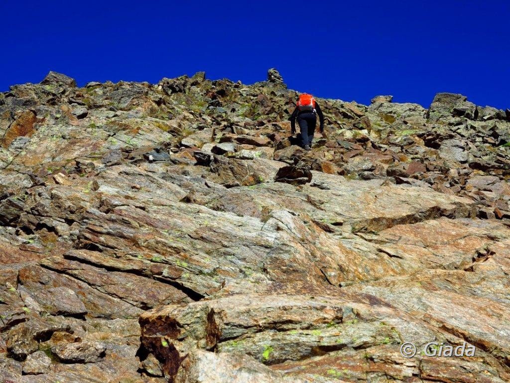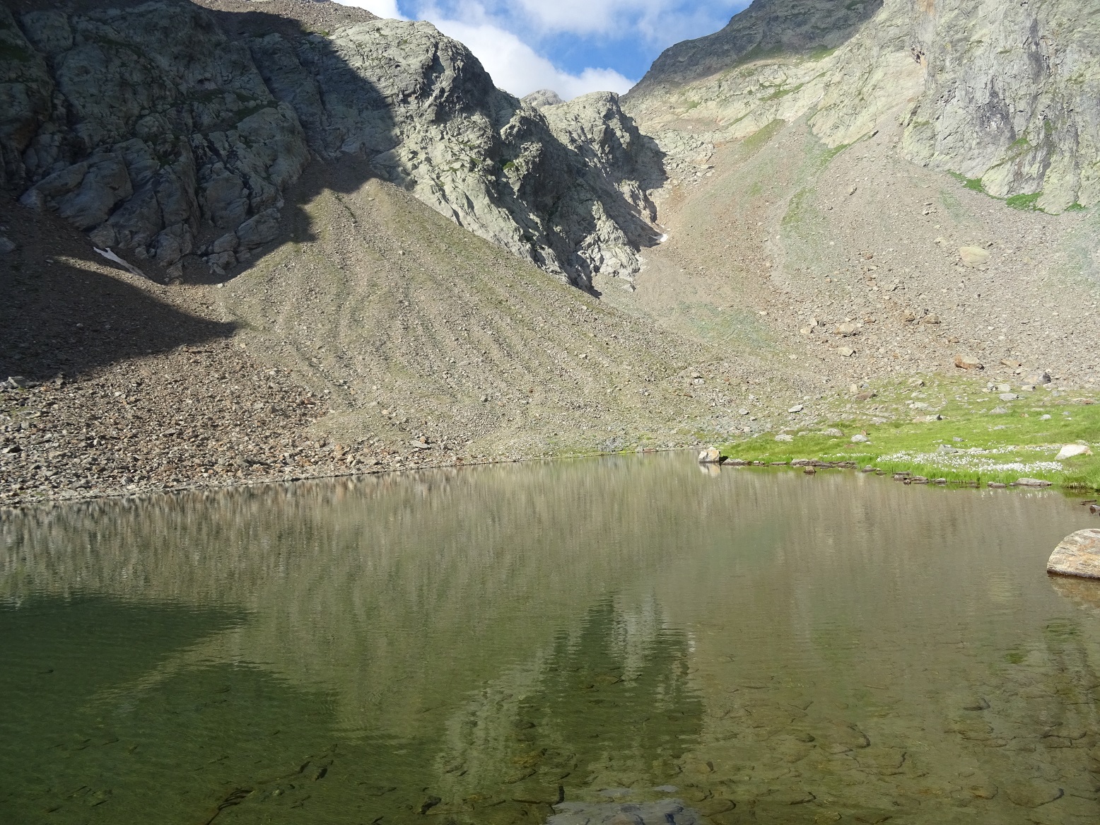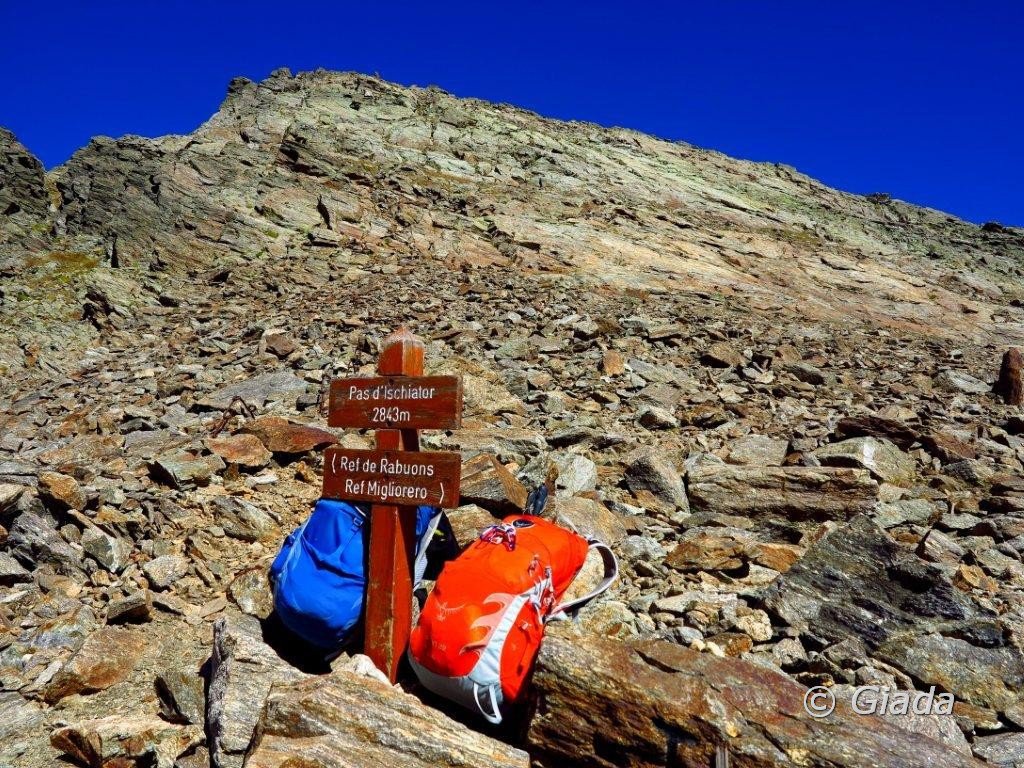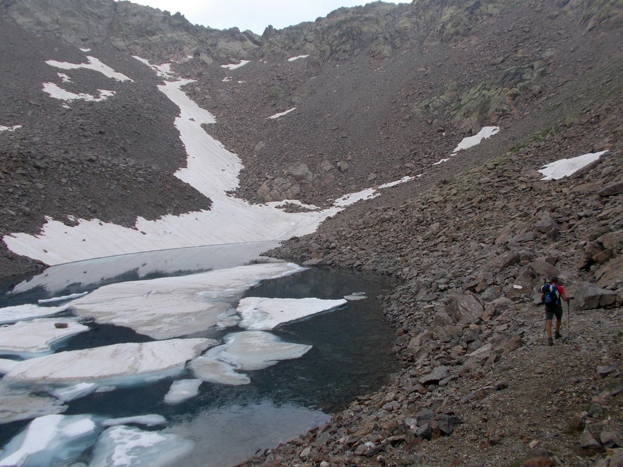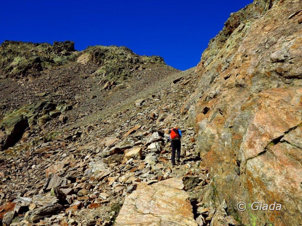 Da questo punto, non ci sono più paline e bolli (ad eccezione di qualche rarissima traccia sbiadita). proseguire costeggiando il lago sulla destra in direzione dell’evidente pietraia (nevai a inizio stagione), che si ha di fronte, e che termina con delle brevi fasce rocciose (direzione sud-ovest). Superato il lago, si reperisce una buona traccia (ex sentiero militare) sino a raggiungere la base di una breve placconata di rocce. La si supera sulla sinistra con un breve e facile passaggio di I+ all’interno di un canalino roccioso. Superato l’ostacolo si esce in una valletta di erba e rocce montonate, il sentiero torna evidente e piacevole, fino a raggiungere una sella che si affaccia sul sottostante Lago Superiore dell’Ischiator 2755 m.