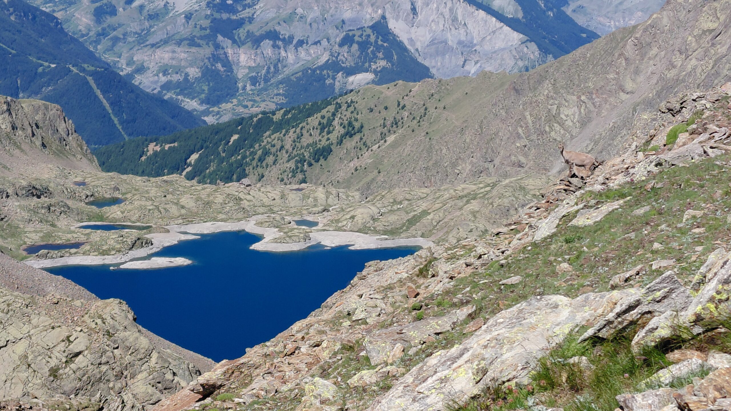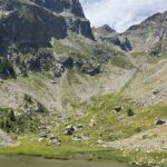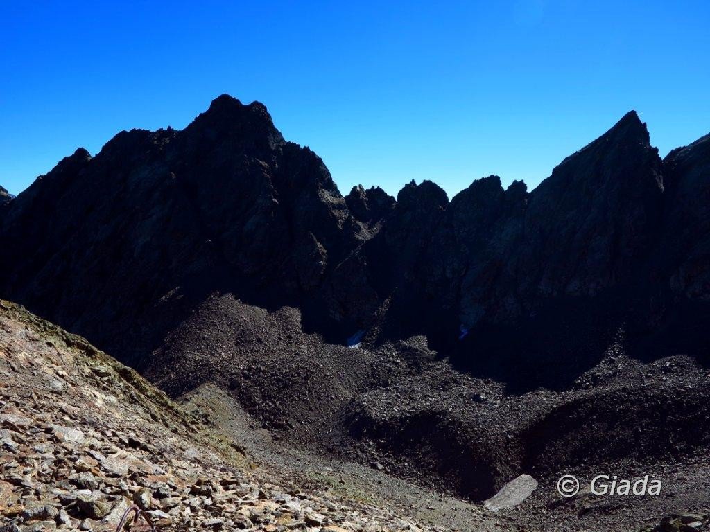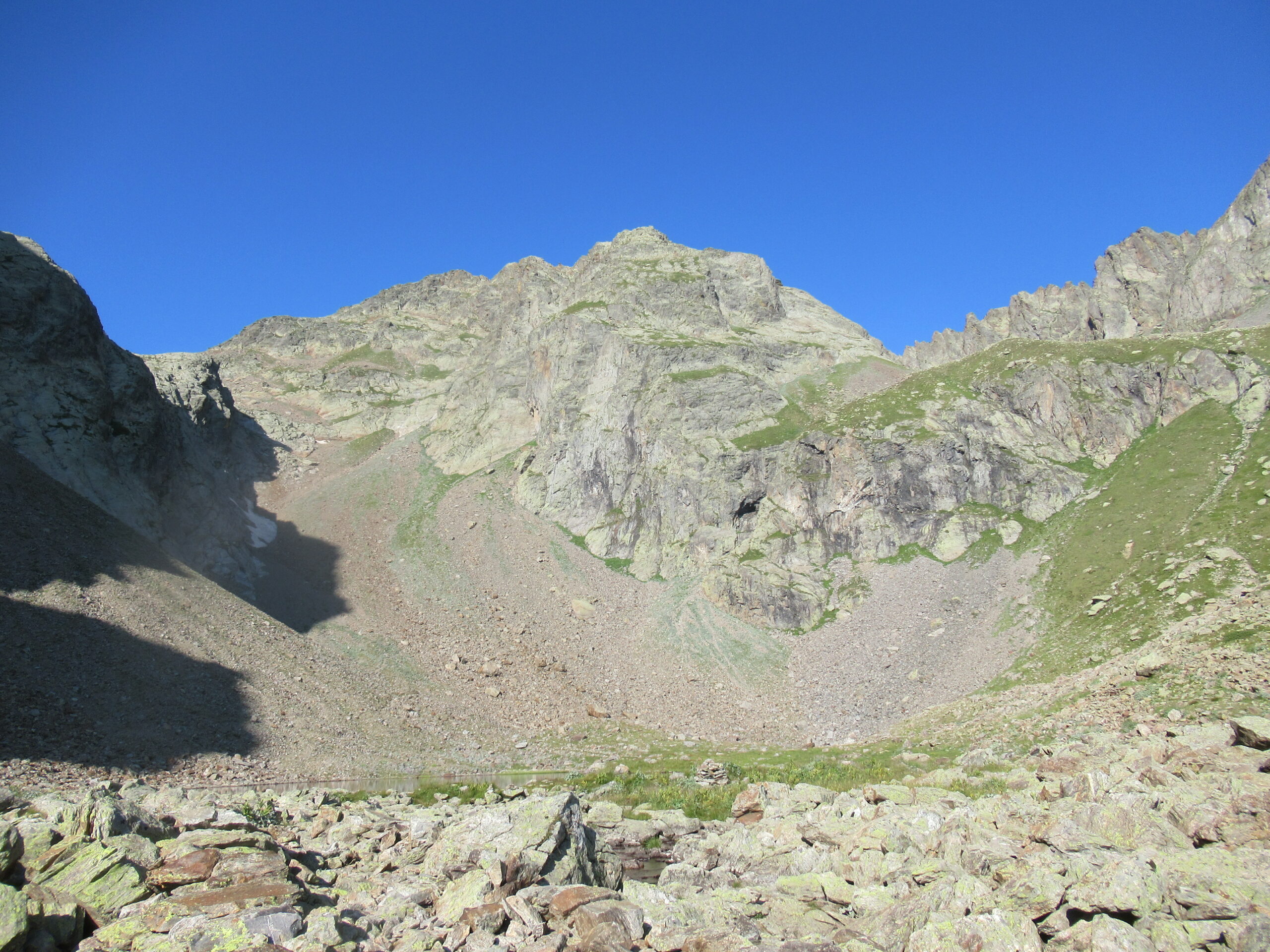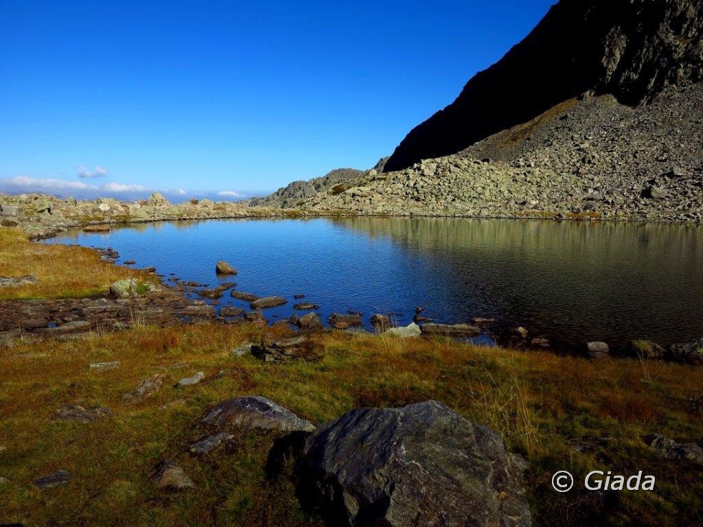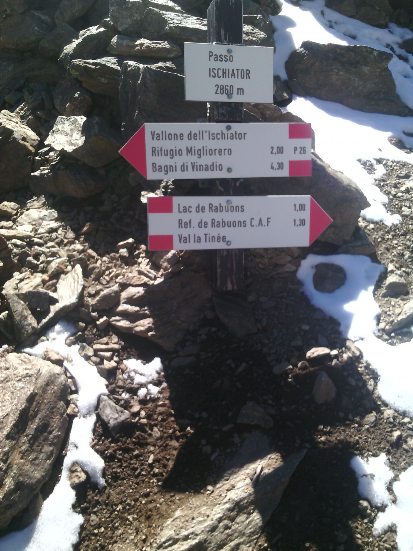 Da questo punto, non ci sono più paline e bolli (ad eccezione di qualche rarissima traccia sbiadita). proseguire costeggiando il lago sulla destra in direzione dell’evidente pietraia (nevai a inizio stagione), che si ha di fronte, e che termina con delle brevi fasce rocciose (direzione sud-ovest). Superato il lago, si reperisce una buona traccia (ex sentiero militare) sino a raggiungere la base di una breve placconata di rocce. La si supera sulla sinistra con un breve e facile passaggio di I+ all’interno di un canalino roccioso. Superato l’ostacolo si esce in una valletta di erba e rocce montonate, il sentiero torna evidente e piacevole, fino a raggiungere una sella che si affaccia sul sottostante Lago Superiore dell’Ischiator 2755 m.