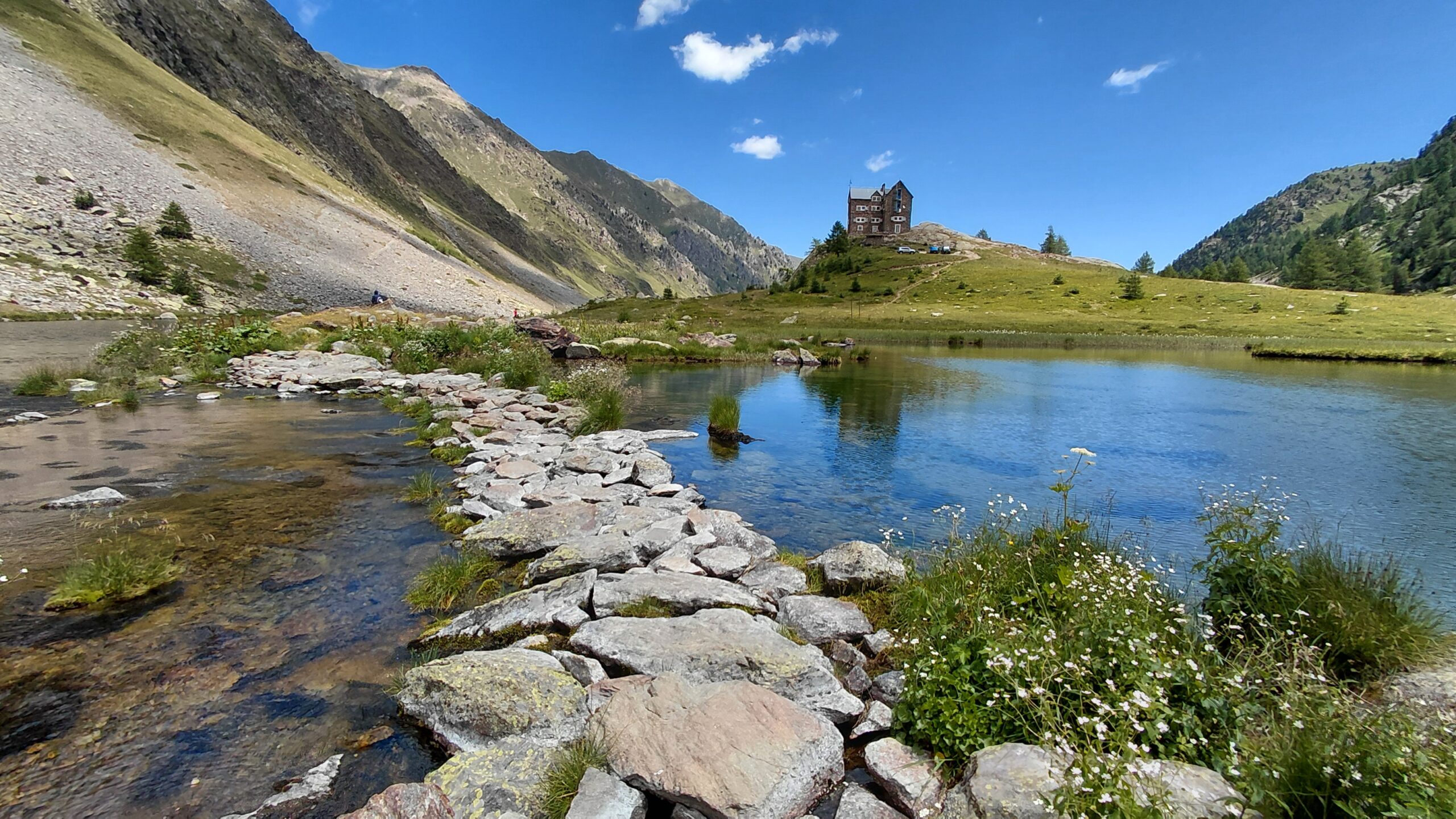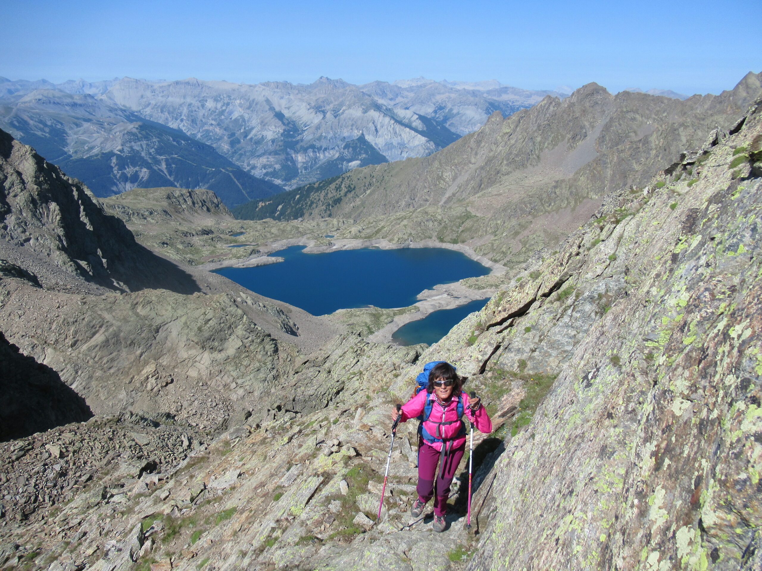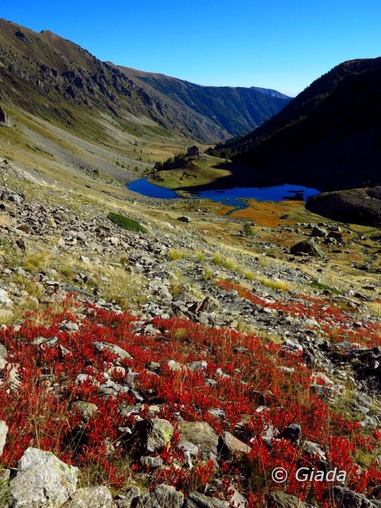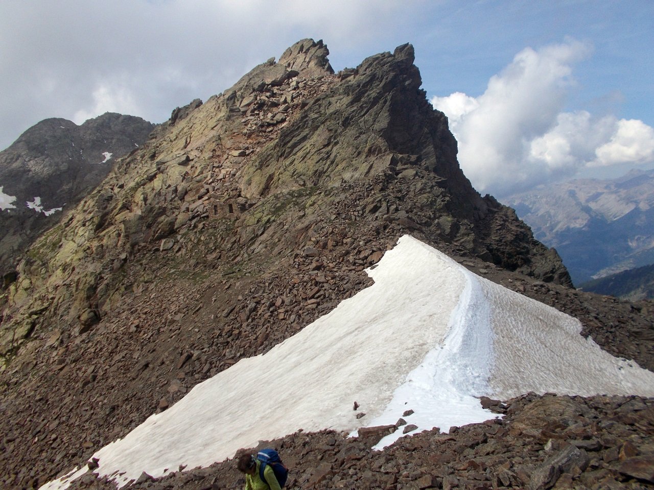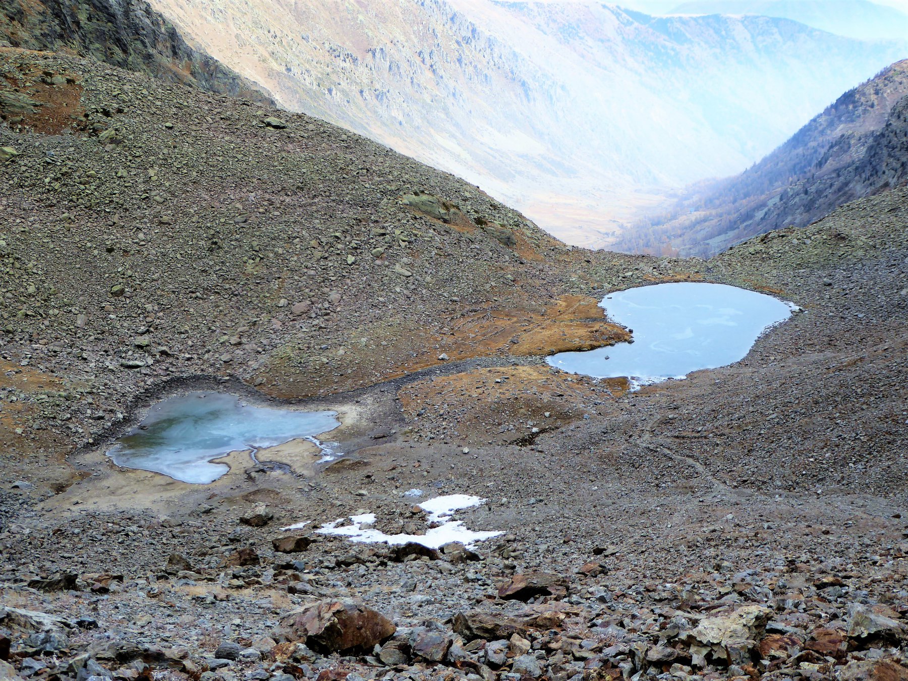 Da questo punto, non ci sono più paline e bolli (ad eccezione di qualche rarissima traccia sbiadita). proseguire costeggiando il lago sulla destra in direzione dell’evidente pietraia (nevai a inizio stagione), che si ha di fronte, e che termina con delle brevi fasce rocciose (direzione sud-ovest). Superato il lago, si reperisce una buona traccia (ex sentiero militare) sino a raggiungere la base di una breve placconata di rocce. La si supera sulla sinistra con un breve e facile passaggio di I+ all’interno di un canalino roccioso. Superato l’ostacolo si esce in una valletta di erba e rocce montonate, il sentiero torna evidente e piacevole, fino a raggiungere una sella che si affaccia sul sottostante Lago Superiore dell’Ischiator 2755 m.