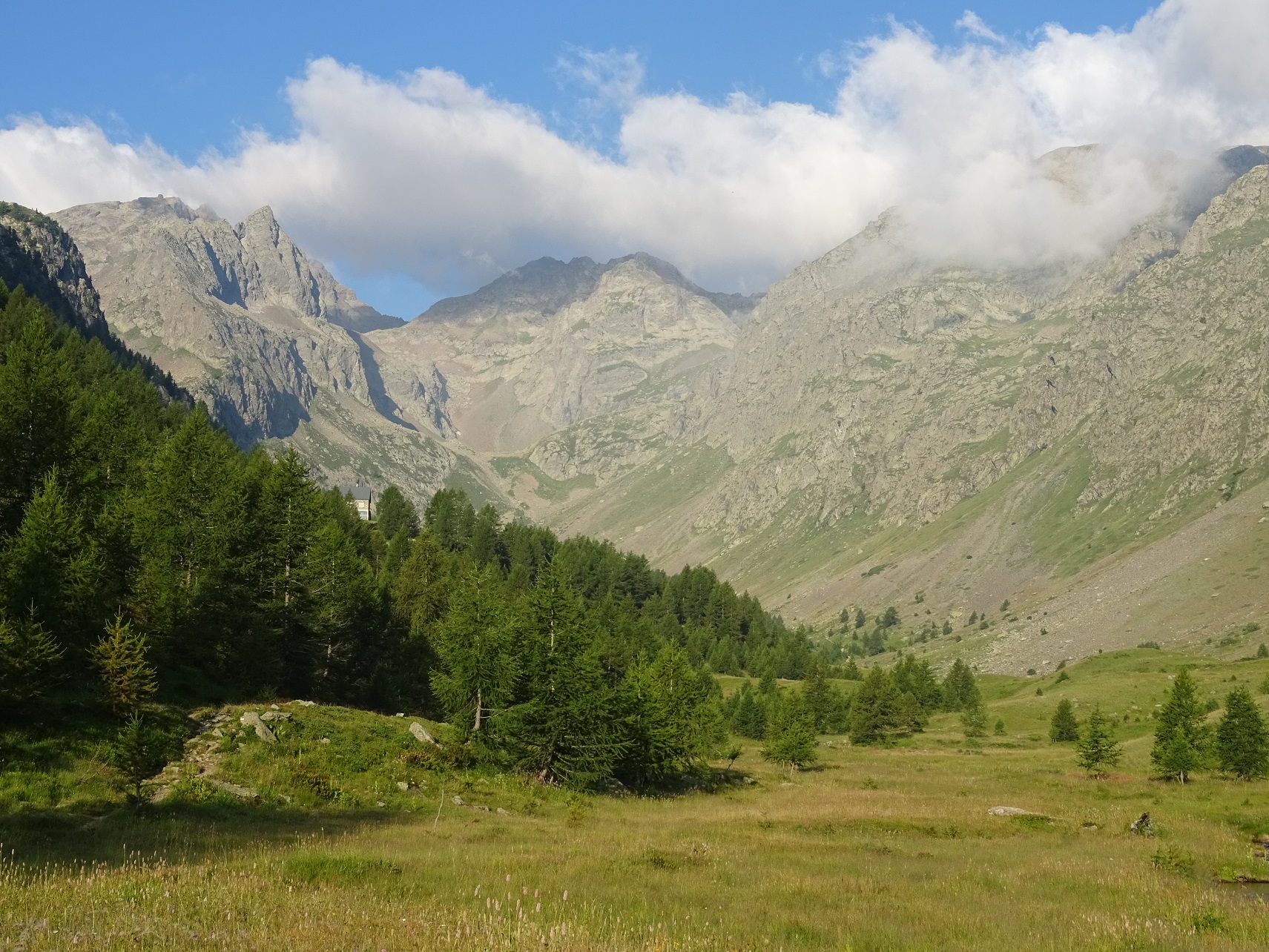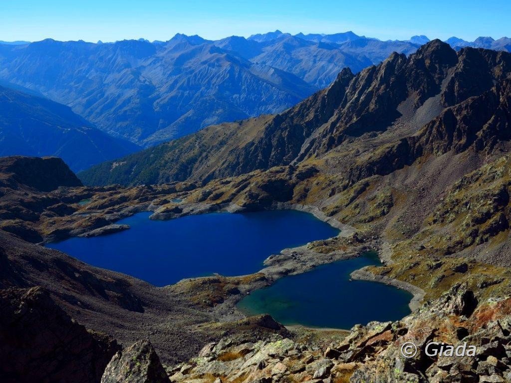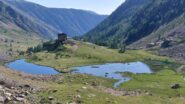 In prossimità del Rifugio a 2100 m sul “cuccuzzulo” boschivo, si perviene a un altro ponte lo si attraversa e continua nella conca del Lago Ischiator inferiore; lo si contorna alla sua destra, finché si incontra un cartello palina indicante il bivio per il passo di Laroussa (a sx), si trascura anche questo, e si procede sul sentiero, che si inerpica sulla destra, su un pendio erba. Si affrontano numerose serpentine per poi tagliare decisamente a mezza costa verso sinistra in direzione della spalla che difende il lago Ischiator di mezzo. Si incontra ancora un bivio per il il Becco Alto dell’Ischiator e Passo Laris sulla destra che va trascurato. Con breve traverso, si guadagna la selvaggia conca del Lago di Mezzo dell’Ischiator 2410 m.
