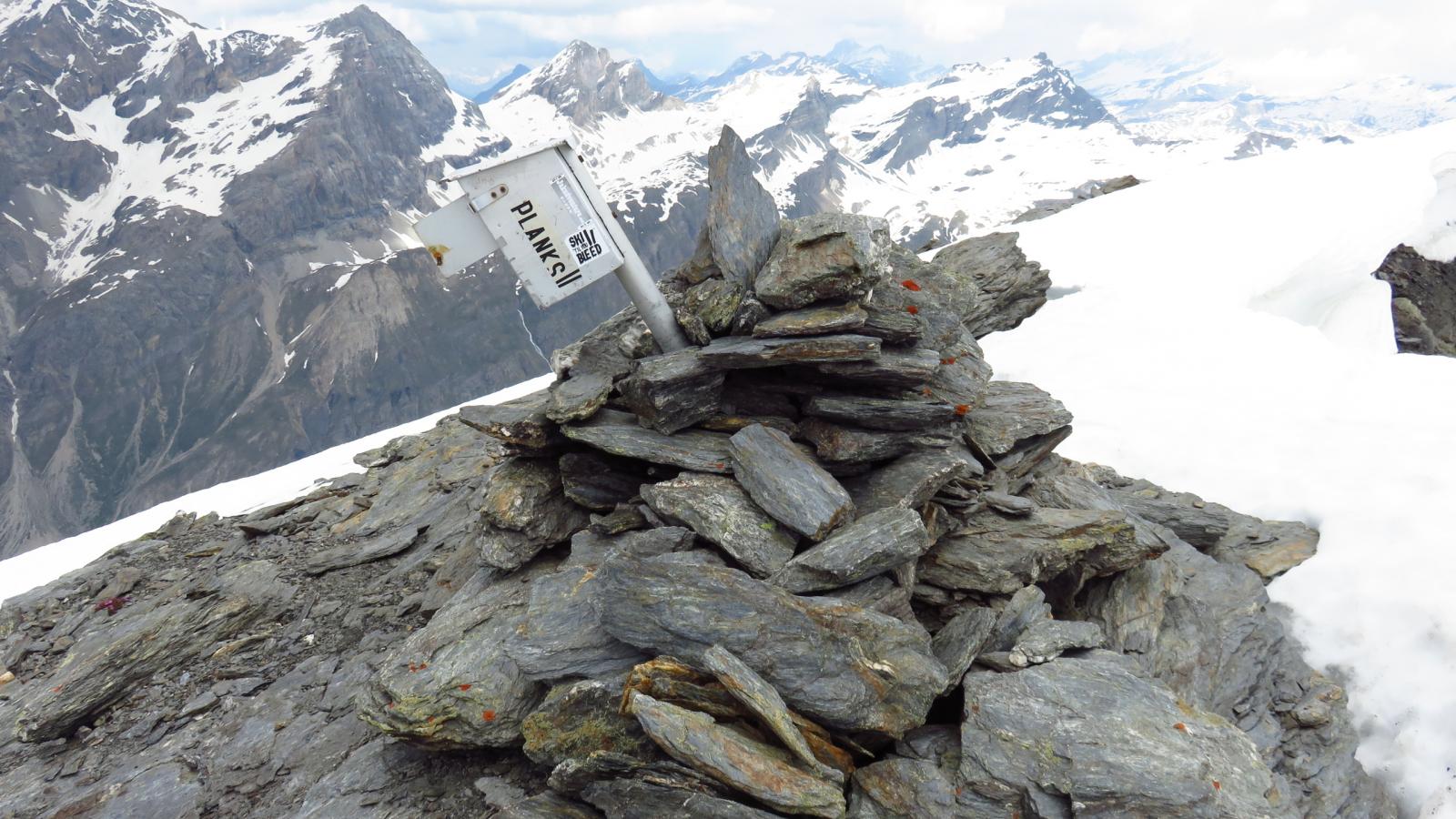 Da qui il percorso diventa più impegnativo. Si traversa su un pendio di pietrame e alcune roccette, fino ad arrivare nei pressi del filo di cresta, dove inizia un primo salto roccioso, seguendo alcuni ometti si traversa a sinistra aggirando il salto iniziale, si supera un gradino roccioso con facile arrampicata e poi si sale per roccette e canalini (restando qualche metro sotto il filo di cresta) raggiungendo un gradino roccioso verticale alto circa 2 metri, (il passaggio più impegnativo della salita, passaggio di II) superato il gradino si traversa a sinistra, dove un altro canalino riporta a destra verso il filo di cresta, superate alcune fasce rocciose con passi di I, si raggiunge ora il filo di cresta, si prosegue lungo il filo (ad inizio stagione questo tratto può essere completamente innevato) superando un grosso roccione a sinistra e poi direttamente con percorso evidente fino a raggiungere il grande ometto di pietre posto sulla cima.