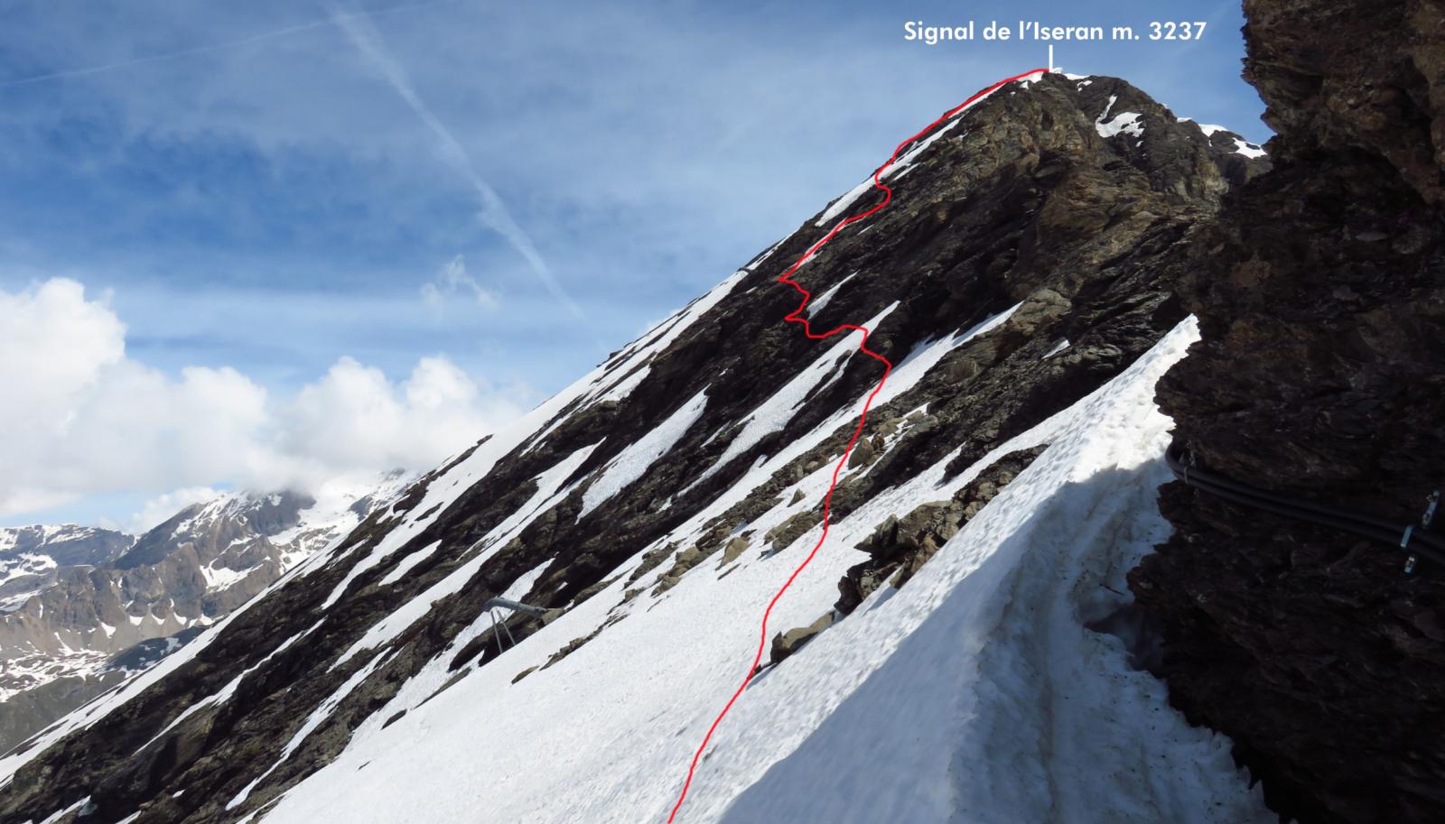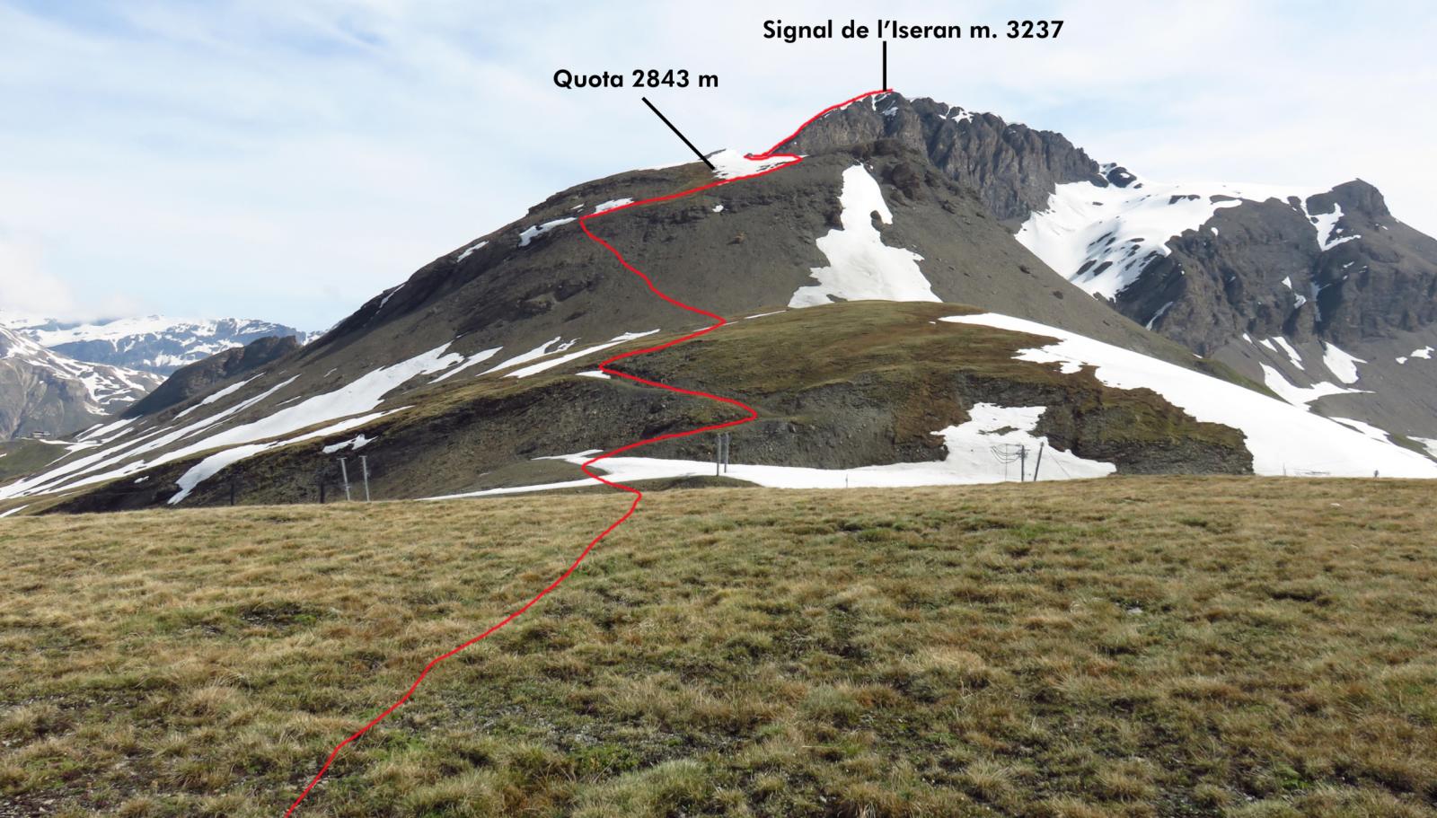 Arrivati alla base del ripido pendio detritico si vede una traccia che sale in diagonale verso sinistra, si segue il sentierino (percorso abbastanza faticoso) che raggiunge un dosso erboso e detritico 2843 m e qui si piega a destra per raggiungere l’ampio crestone Sud-Ovest del Signal de l’Iseran che porta ad una specie di colletto dove è collocato un bombolone di gas 3031 m.