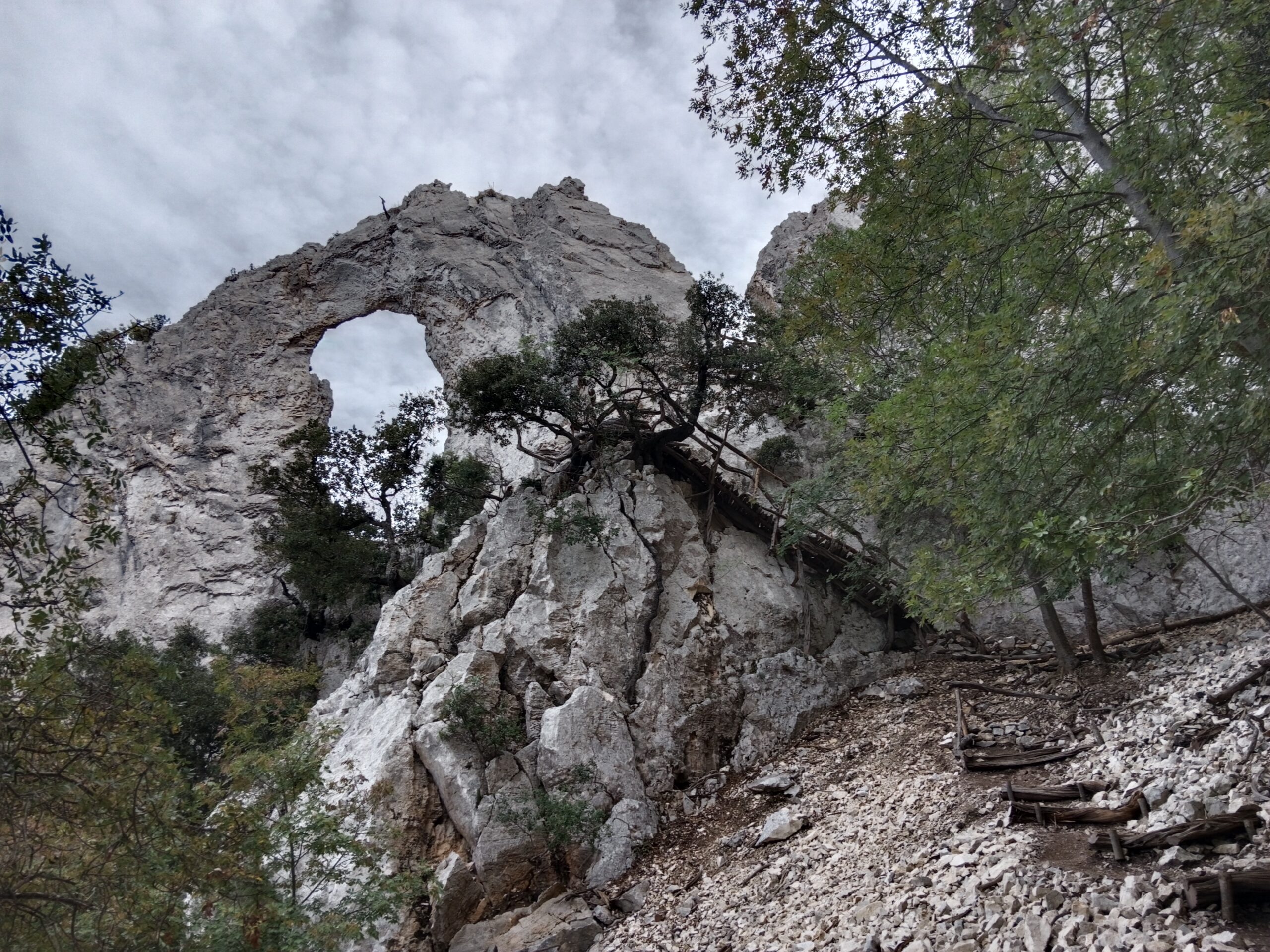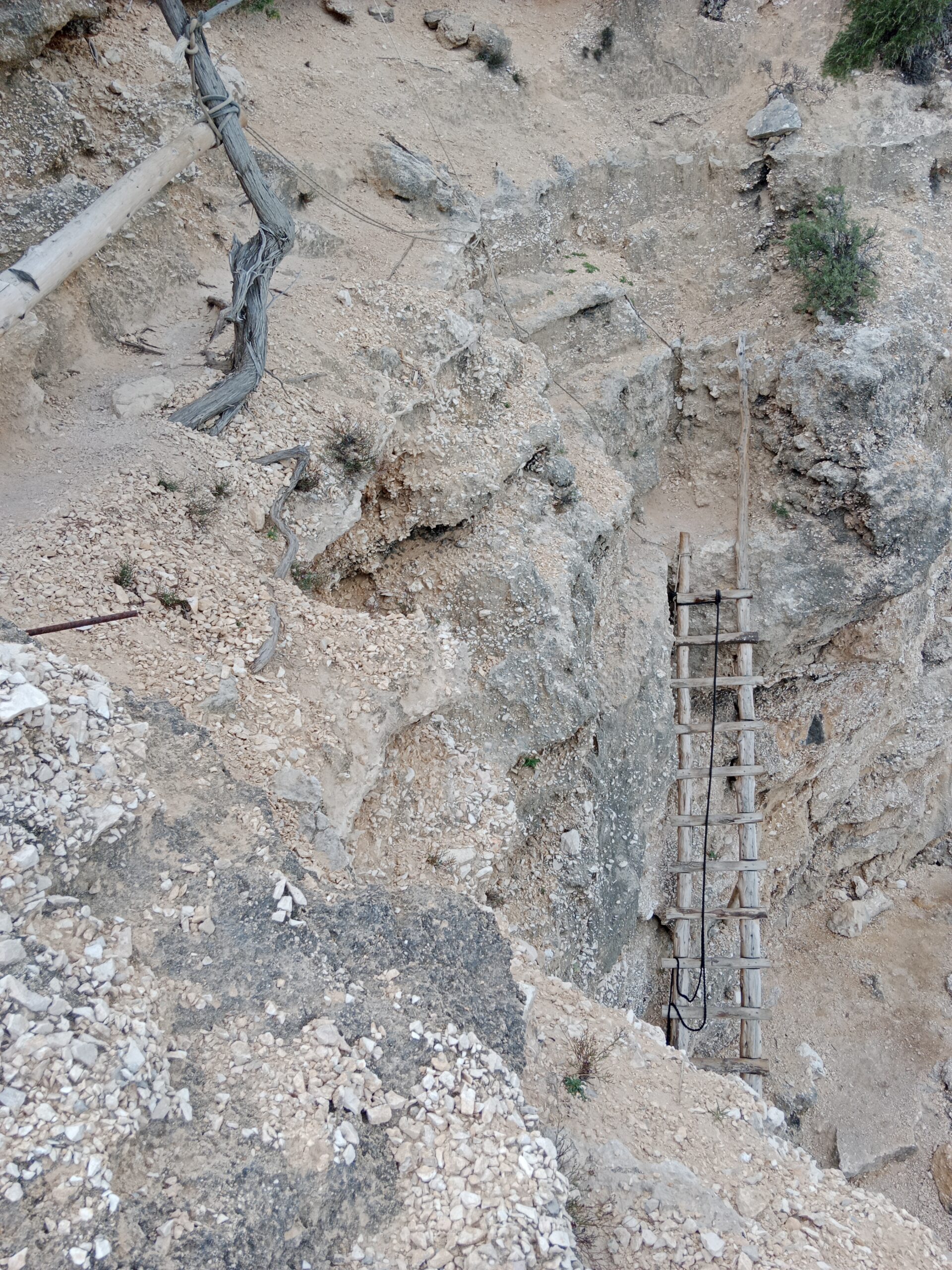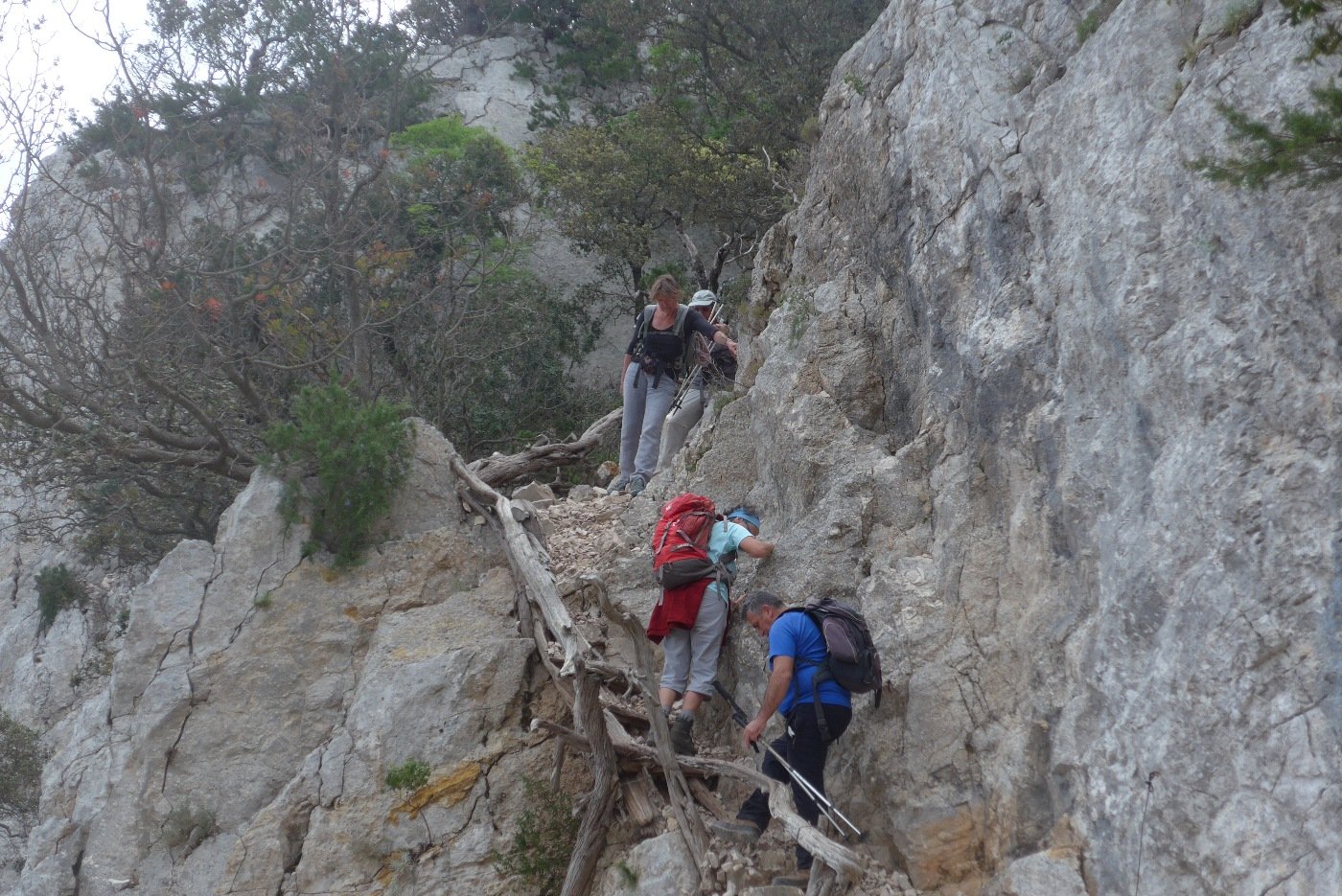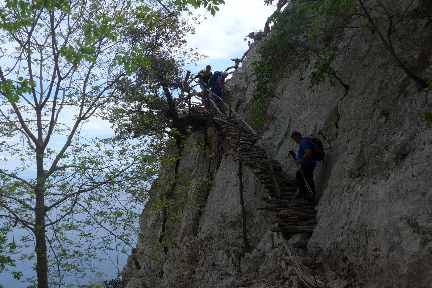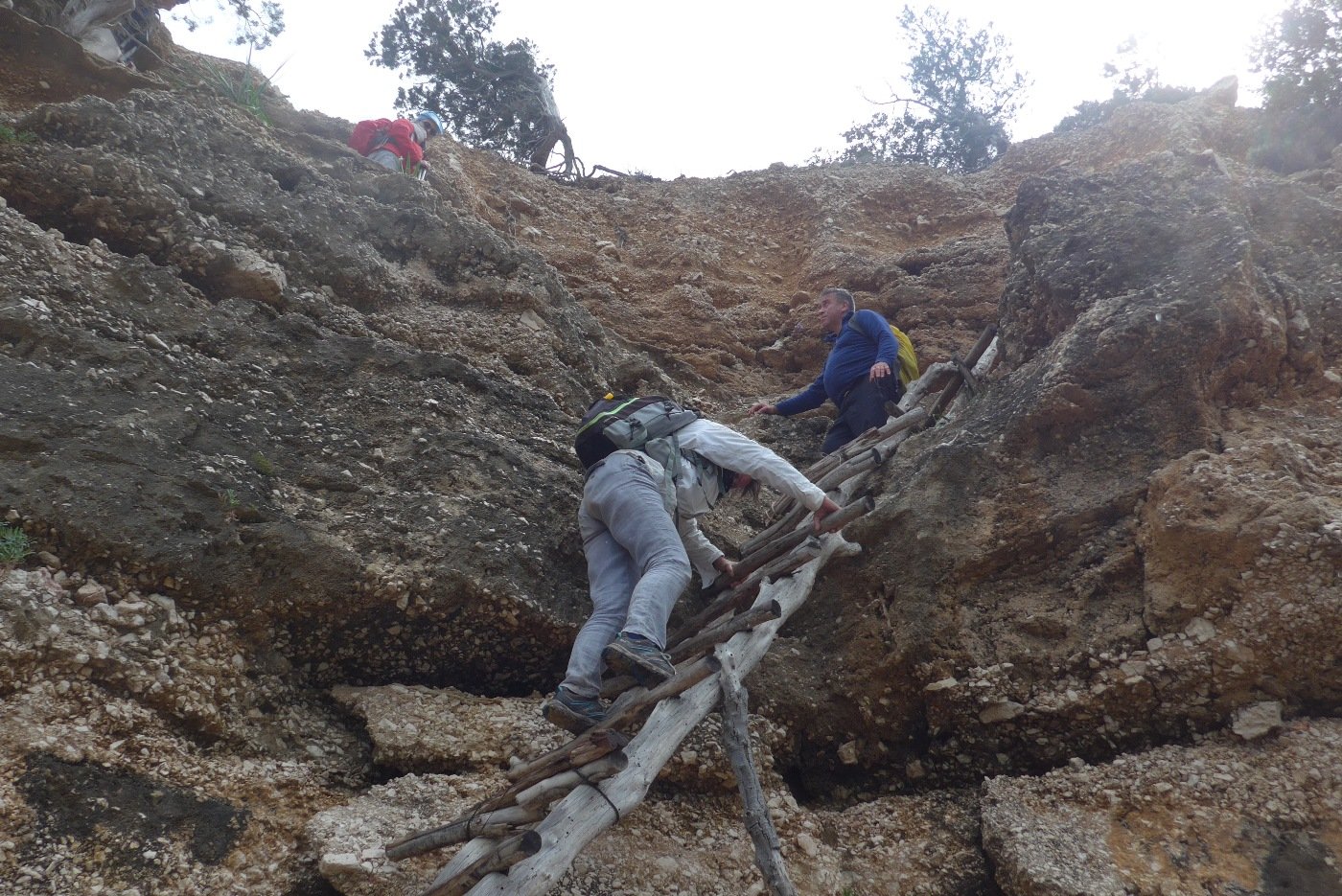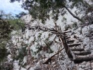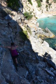Si comincia a scendere dolcemente, poi si entra nella parte più “tecnica” della gita. Il panorama diventa sempre più mozzafiato, con da una parte il mare e dall’altra pareti altissime e verticali di roccia. Occorre attenzione per superare le cosiddette Iscal ‘e Fustes, ovvero delle scalette in rami di ginepro attaccati alle rocce. Questo splendido lavoro permette di superare tre salti di roccia altrimenti impensabili senza corde. La parte più difficile sta nel passare sulle ripidissime pietraie nei tratti di sentiero tra una scala e l’altra. Presenti funi e tronchi nei punti più esposti. Finita la pietraia il sentiero rimane ripido anche nella prima parte del bosco. La picchiata diventa un comodo sentiero che scende verso il mare che fa capolino tra le foglie. La traccia è evidente ed arriva a una grotta, pare abitata sin dal neolitico. Tenere il sentiero verso sinistra e in breve si è alle scale in legno, di cui la seconda alta 6-7 metri (fare attenzione!) che deposita sugli scogli e da lì in un attimo in spiaggia.