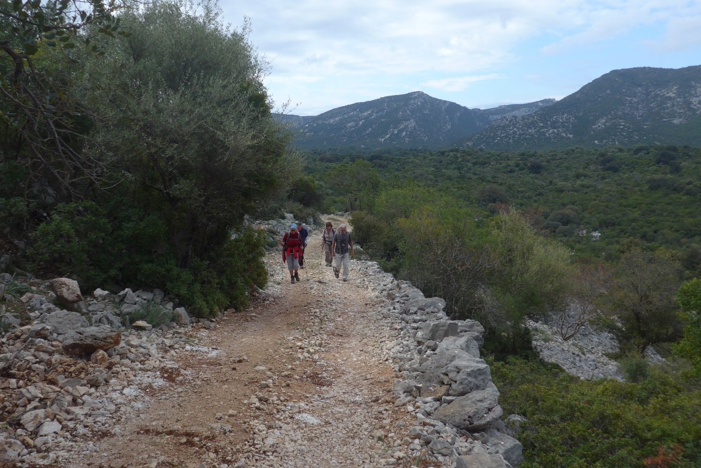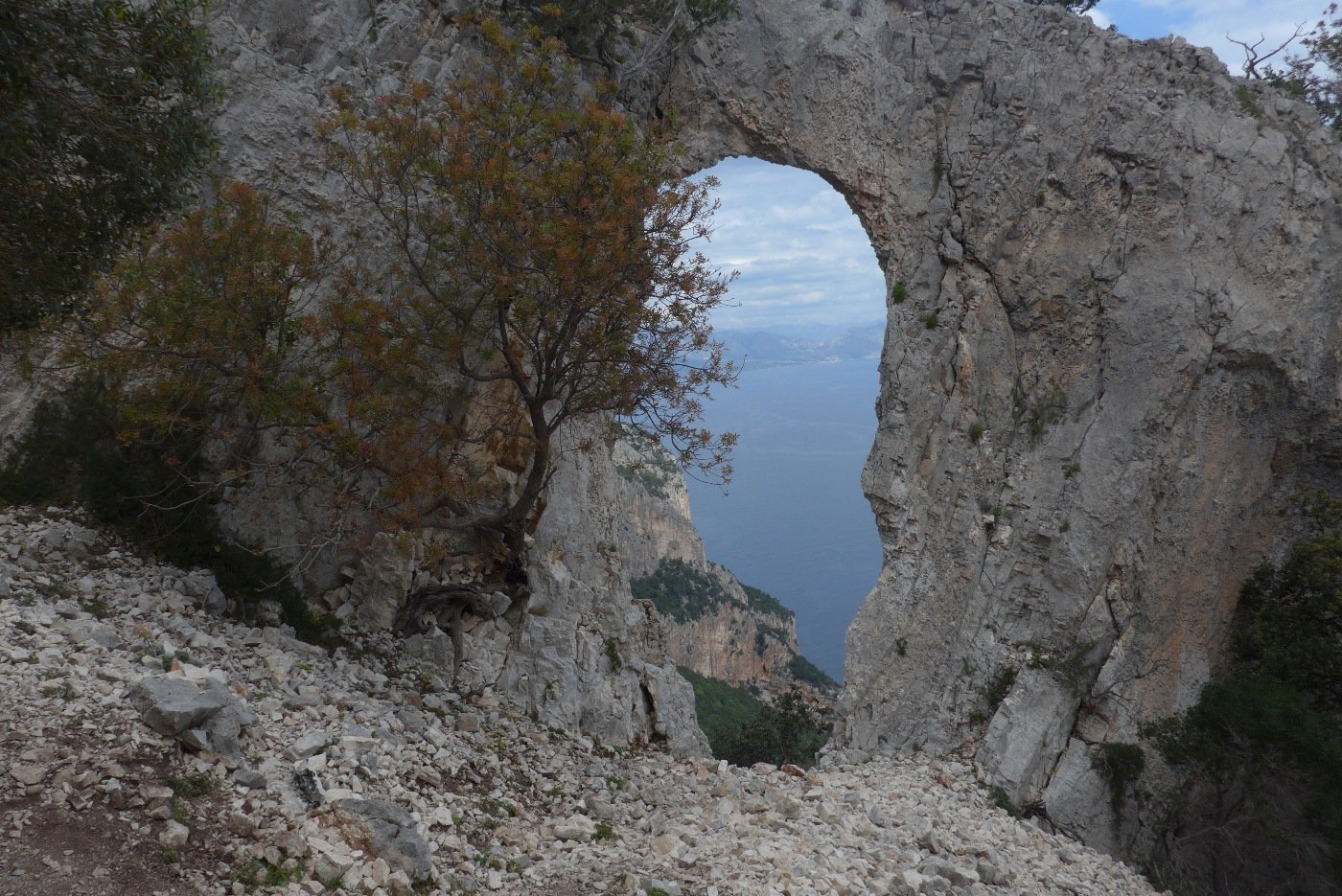 Da Golgo seguire la sterrata verso nord a destra. Seguire la strada in direzione N/NE in leggera salita fino ad un ampio spazio sterrato di nome Piredda. Prendere il non evidentissimo sentiero sulla destra (ometto) per 5 minuti. Il sentiero-strada dei pastori prosegue dritto, per noi occorre prendere a destra: ometto, pietra bianca su muretto e segni evidenti di passaggio sulle roccette. Questo bivio è caratterizzato dalla presenza sulla sinistra di un enorme leccio, quota 415 m. Saliamo su roccia e terriccio, seguendo i segni rossi spesso sbiaditi, fino ad un pozzo di raccolta dell’acqua piovana. Teniamo il pozzo sulla destra e saliamo, adesso ripidamente fino ai Cuiles de S’Arcu ‘e su Tasaru. Questi sono antichi ovili in legno. Passiamo tra le due costruzioni e andiamo a sinistra, quota 540m. In breve si tocca la massima elevazione della gita e si apre il panorama verso il golfo di Orosei.