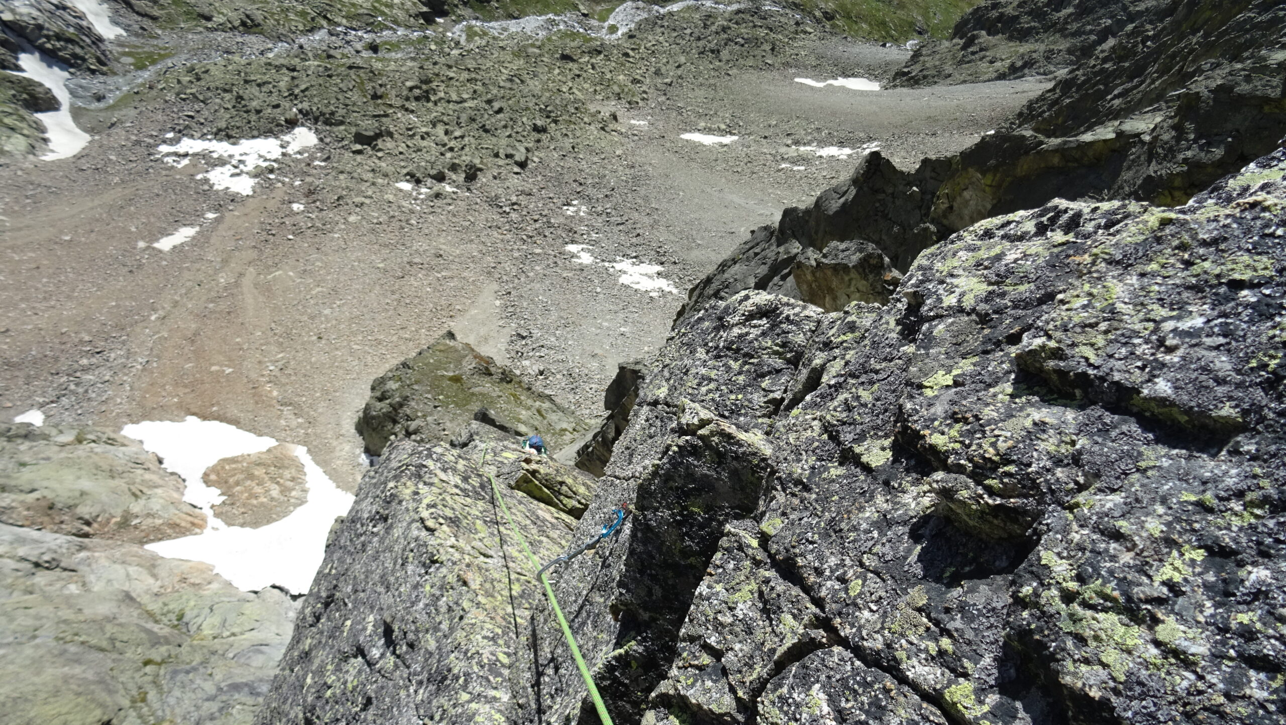 Attrezzatura in loco: ho ribattuto (quasi) tutti i chiodi trovati, nella parte alta sono tutti da buoni a ottimi (quelli dell’artificiale di L10 li ho testati a dovere), mentre nella parte bassa è meglio non caderci sopra (soprattutto su L7, i primi flettono e ruotano). Materiale usato: singola da 60m, friend #0.3-2 BD, 8 rinvii (di cui 2 allunghini), martello utile. Avevamo dietro i nut ma non li abbiamo mai usati. Cordoni per le soste utili solo per S11, le altre sono già collegate. Roccia (lo splendido gneiss della serie di Arolla) generalmente ottima, un po’ più dubbia solo su L9 e L12 (più qualcosina nella parte bassa), ma avercene di roccia così…