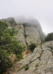 Si prosegue sulle rocce a dx del camino fino a quando la qualità della roccia comincia a peggiorare e il camino-canale si stringe; conviene allora spostarsi all’interno, dove si vince una bella strozzatura, prima di uscire nuovamente verso dx, per guadagnare un secondo panoramico pulpito (II e III; varie possibilità per protezioni veloci e una clessidra con vecchio cordino sul pulpito). Di qui si può proseguire fino alla sommità del camino per raggiungere una pianta di leccio che lo chiude definitivamente (sosta un po’ angusta da attrezzare su albero, ma con vista sul compagno); oppure si può aggirare da subito il margine del canale verso dx, per prendere una più comoda cengia posta alla radice dell’aereo pilastro che fa da angolo alla parete (sosta su spit con comodo mancorrente di metallo, ma senza contatto visivo con il compagno).