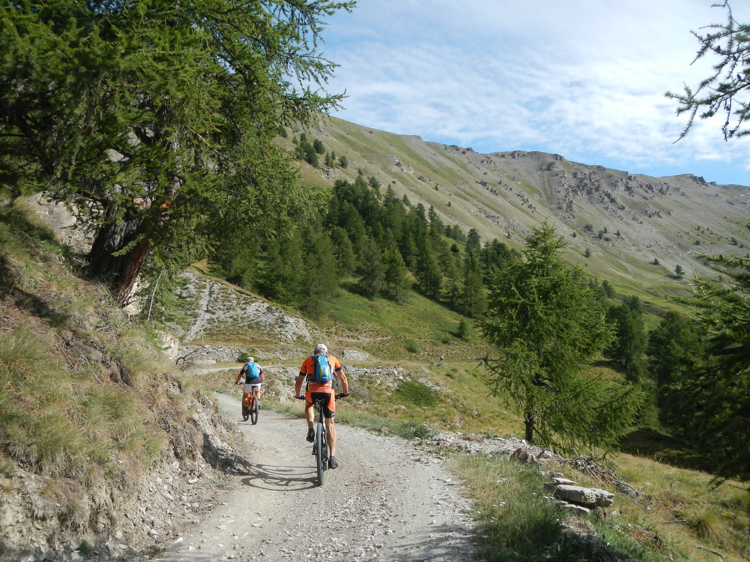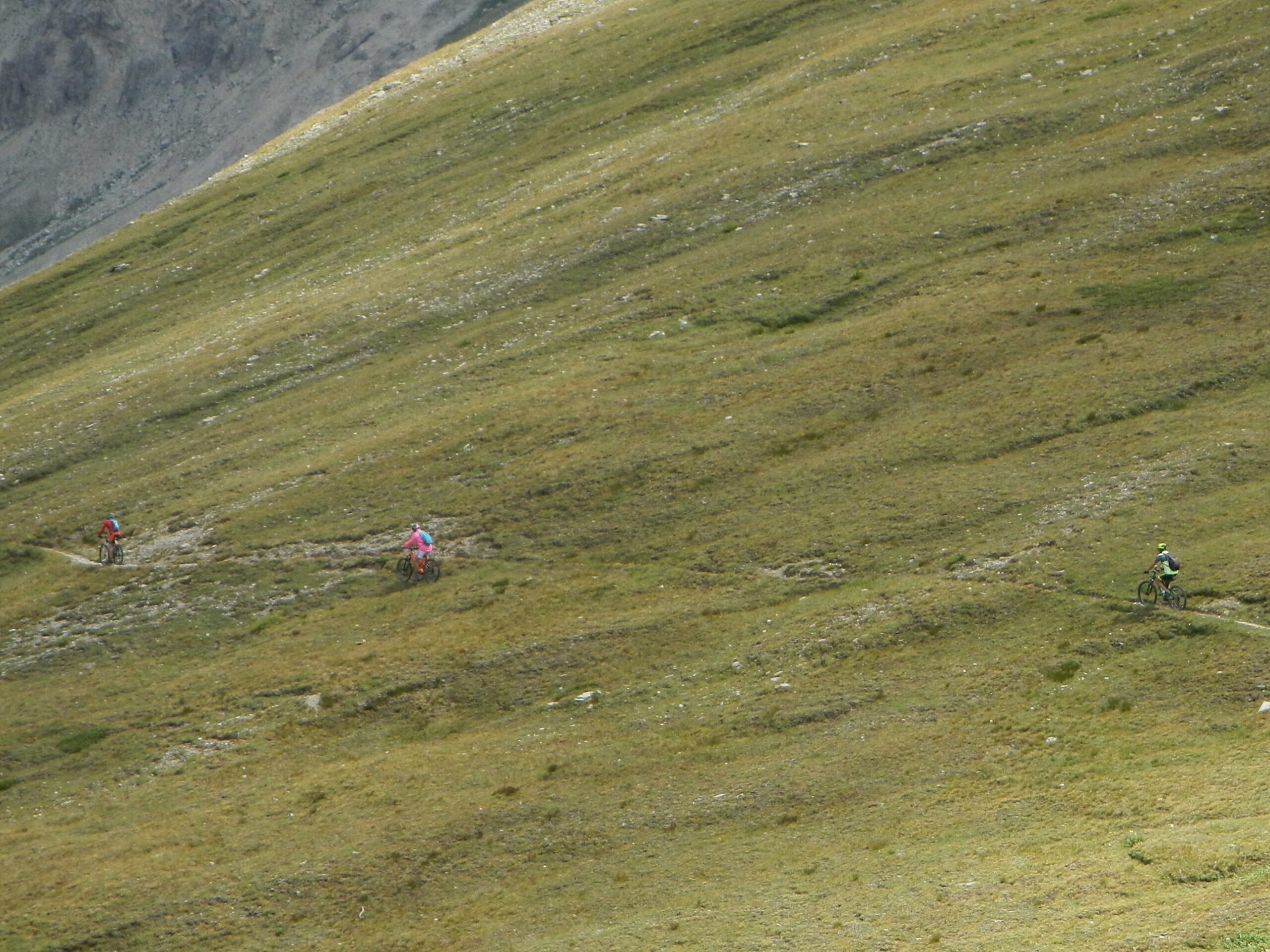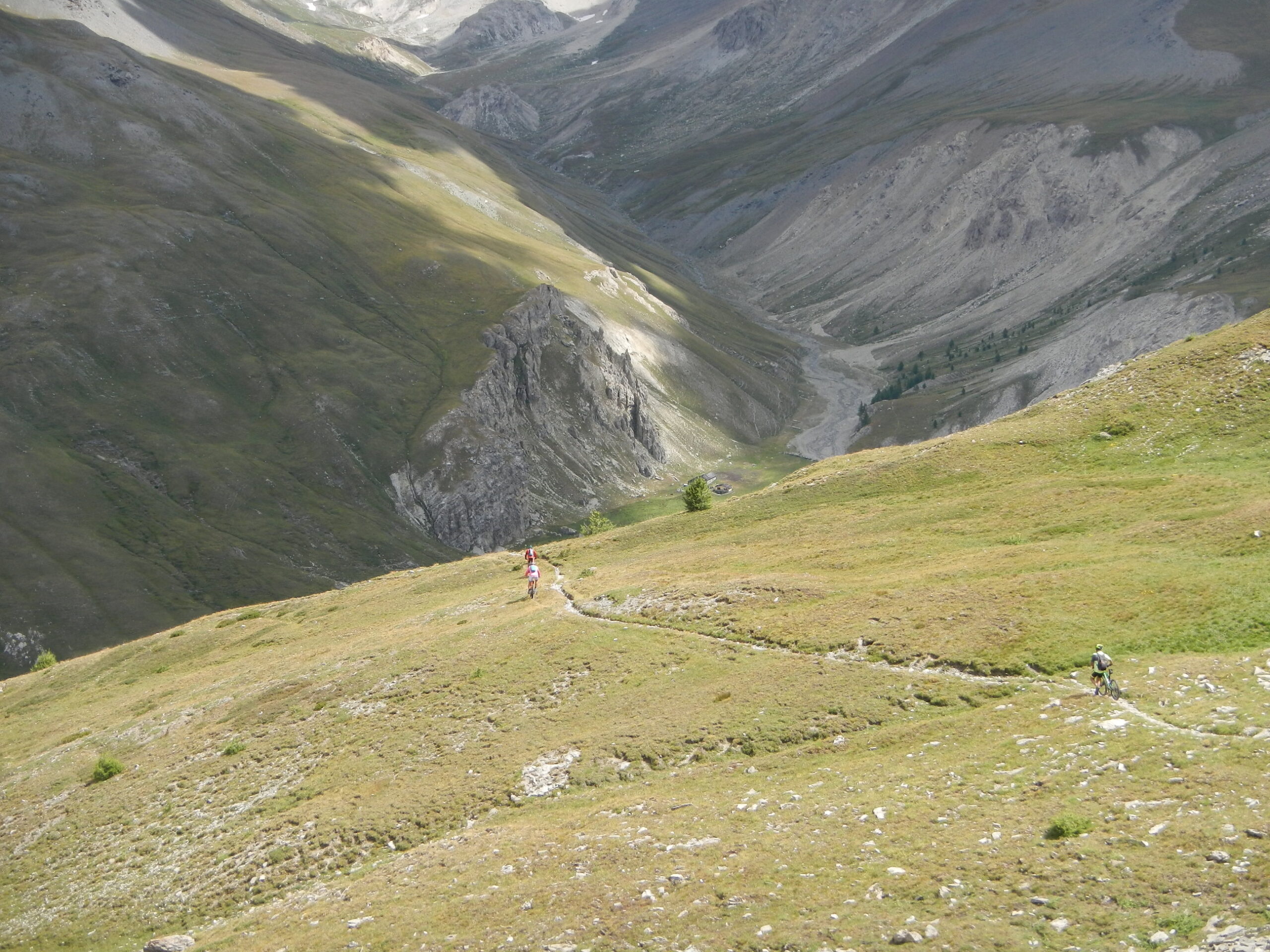 La discesa sulla Valfredda, iniziata dal Colletto dello Jafferau, presenta un bel tratto iniziale ma poi il sentiero ripido, impegnativo e scavato dalle piogge, richiede l’accompagnamento della mtb per lunghi tratti.