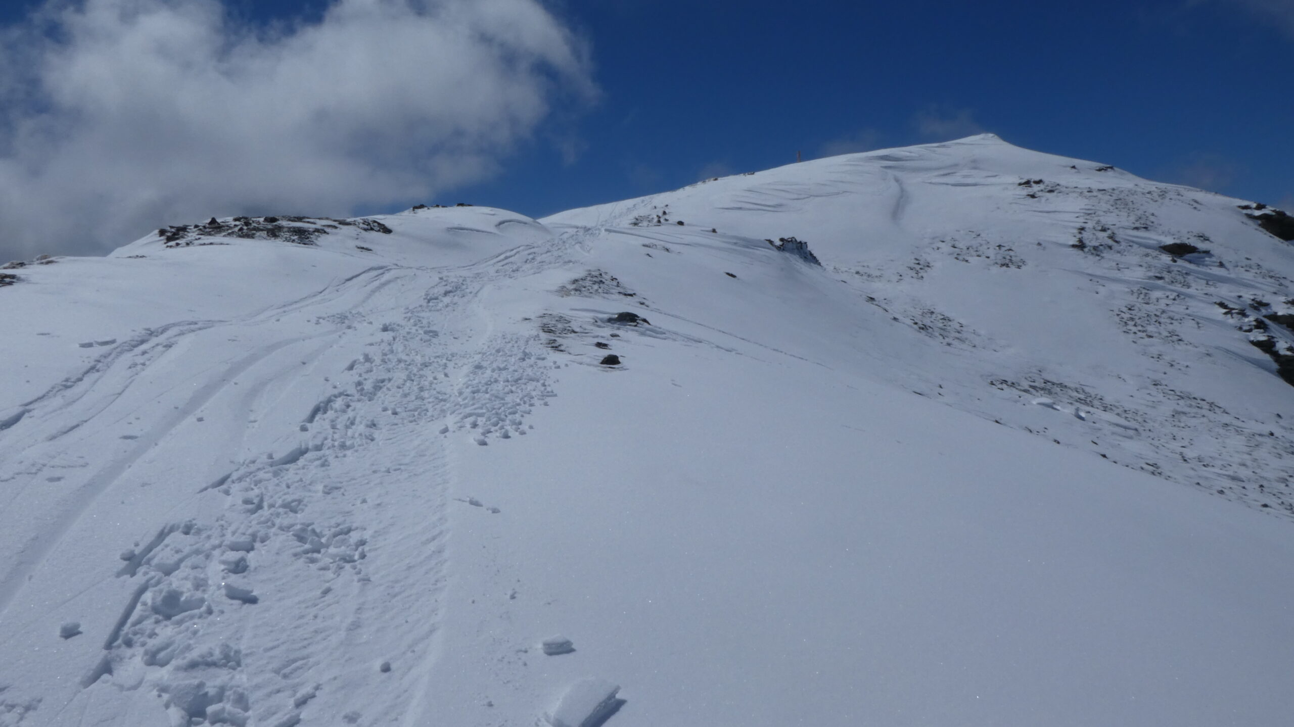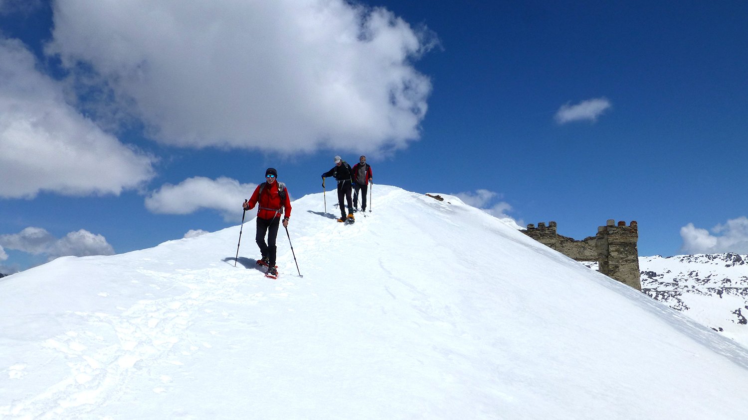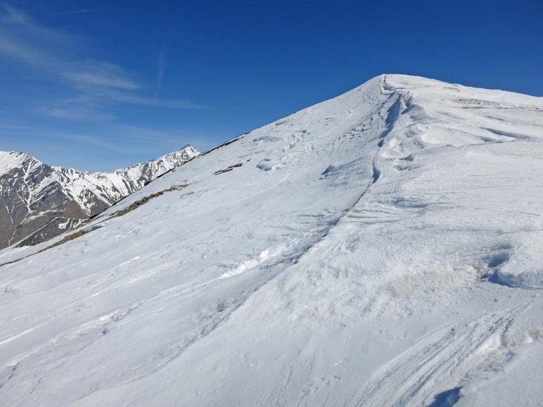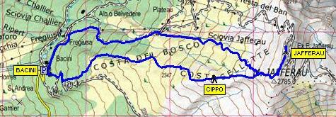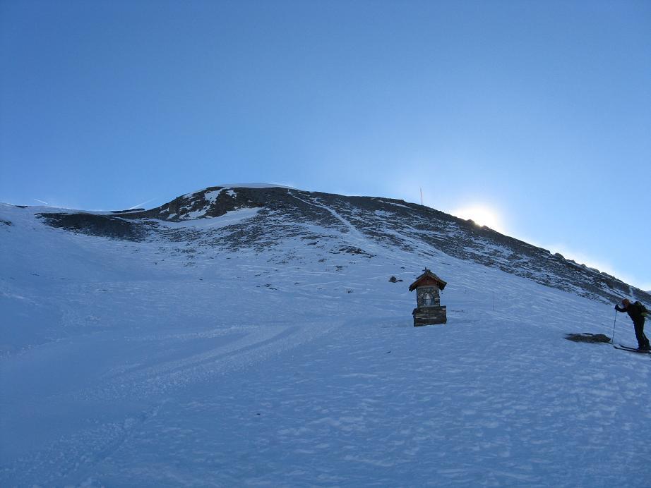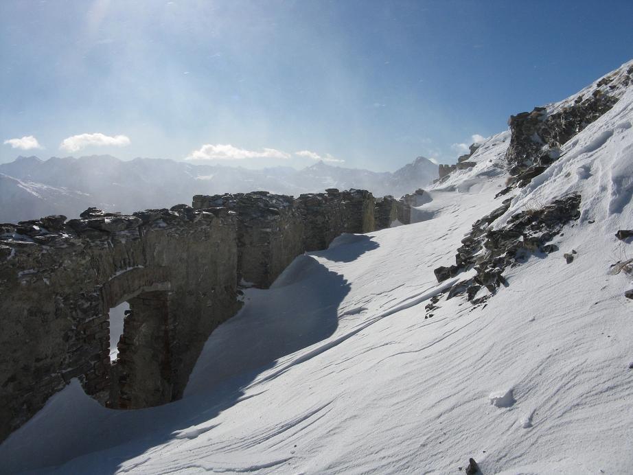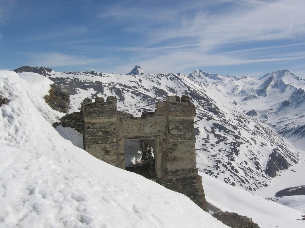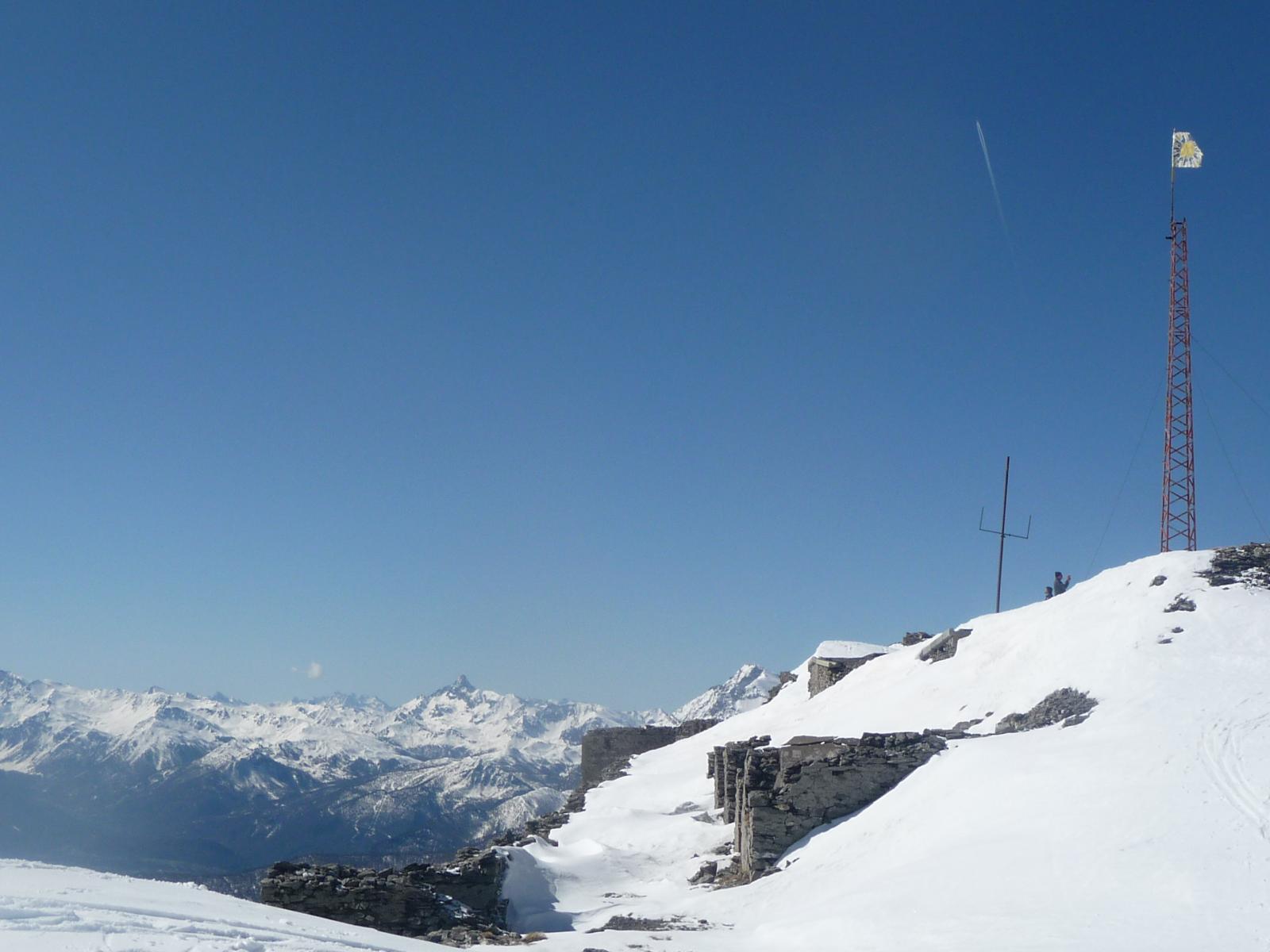 Salire a destra, prima dell’hotel – residence, raggiungere e seguire una pista che inizialmente volge a destra. Continuare per ripidi pendii a fianco delle piste, avendo come riferimento a sinistra lo skilift dello Jafferau. Superato l’arrivo dello skilift, raggiungere la cima per lingue di neve, roccette e detriti. Sulla vetta, oltre gli imponenti resti del forte, c’è un alto traliccio metallico