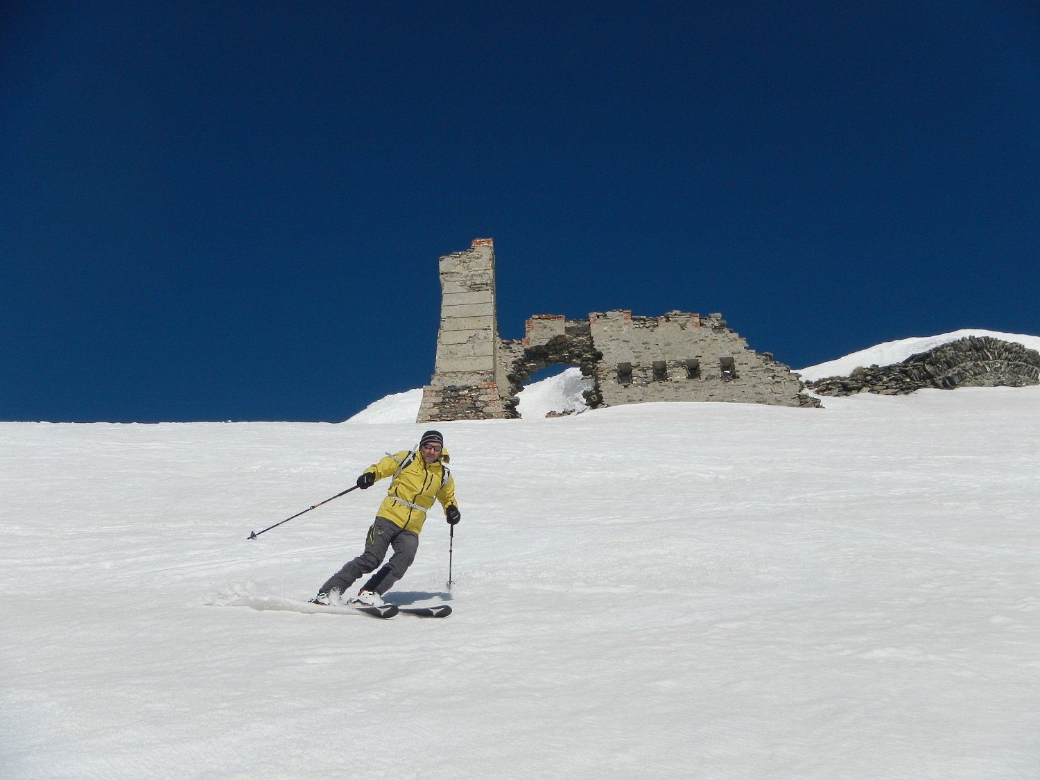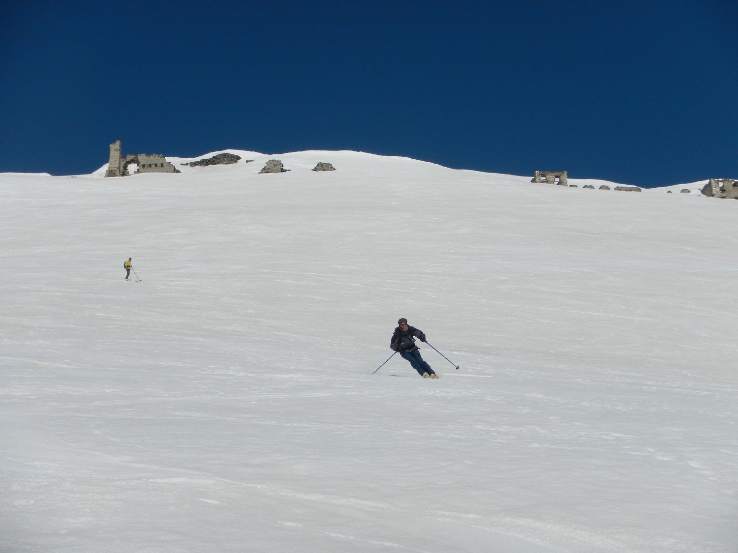 Arrivati in cima siamo scesi sul versante est, su bella neve primaverile e in direzione della Valfredda, fino a poco sotto i ruderi delle casermette militari a quota 2550 m. circa.