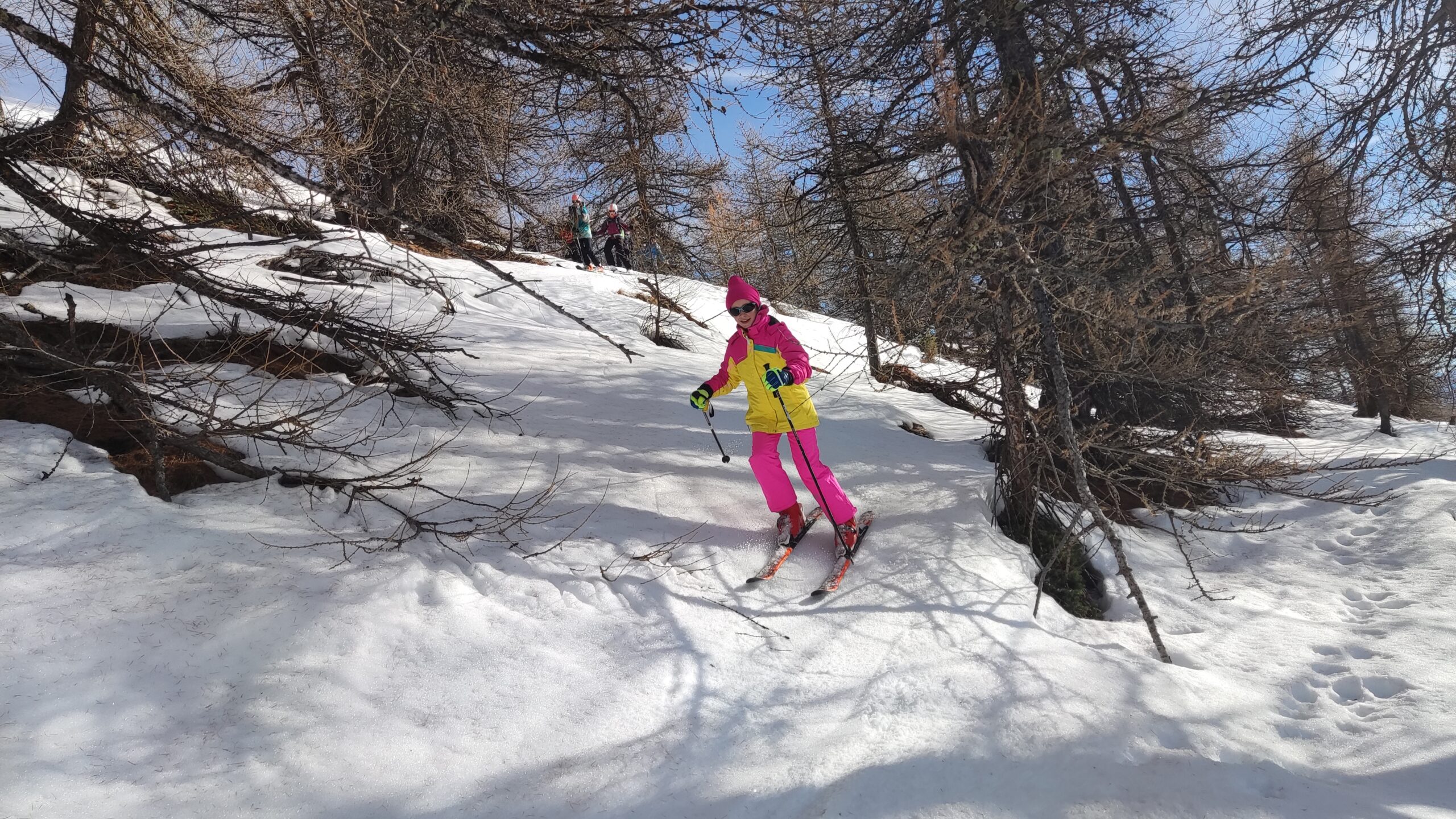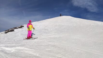 Gita “invito allo scialpinismo” della Giovane Montagna sezione d Torino, pensata per i più giovani. Partiti dal piazzale dei bacini e saliti a destra delle piste seguendo varie tracce che le evitano fino in punta, dove si sale sfruttando la solita lingua di neve compattata dal vento a destra degli impianti. Discesa iniziata alle tredici e trenta, primi duecento metri su croste da vento portanti, poi tratto sulla ex belvedere e appena possibile, pena cinque metri orizzontali pelati, giù per il versante sud-ovest su stupenda trasformata fino alla fontana sulla strada del foens. qualche centinaio di metri di stradina e poi bosco fino ai bacini su rigelata dura.