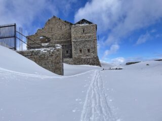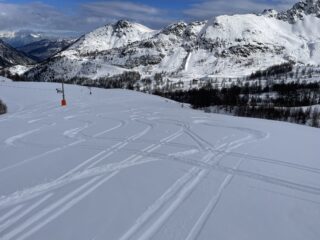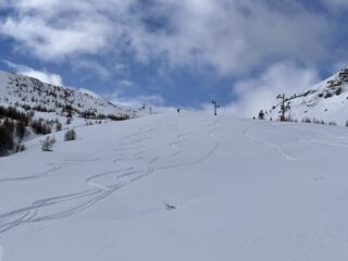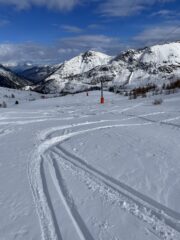 Fatto dopo il Sommet des Anges. Tolti gli sci solo per dieci metri in discesa sulla stradina dalla cima. Poi dal colle veramente ottima sciata sulla neve fresca di ieri.