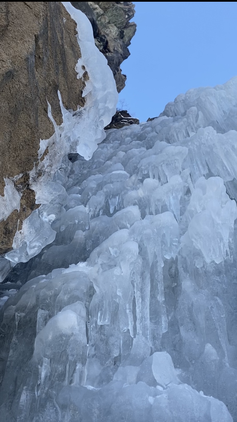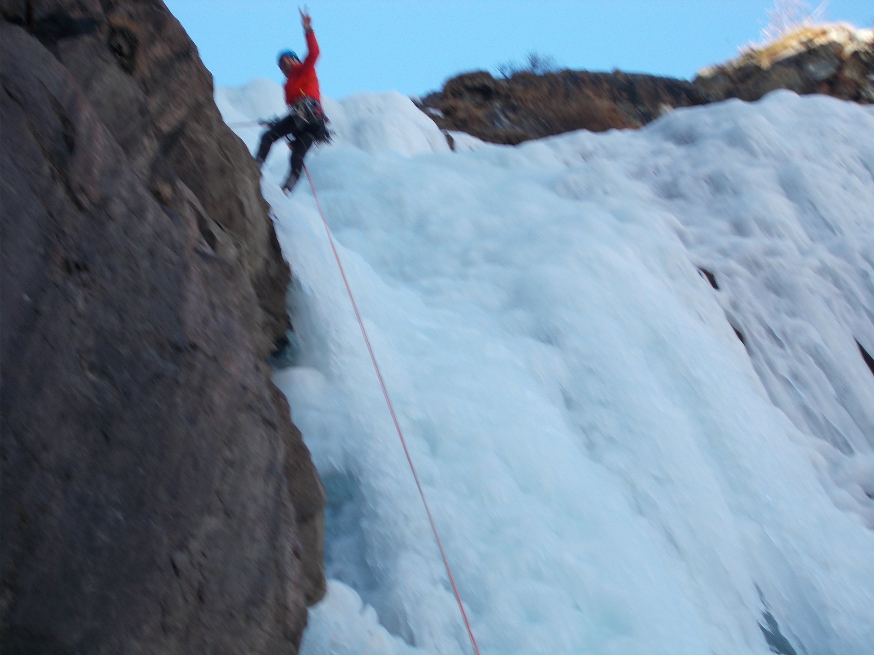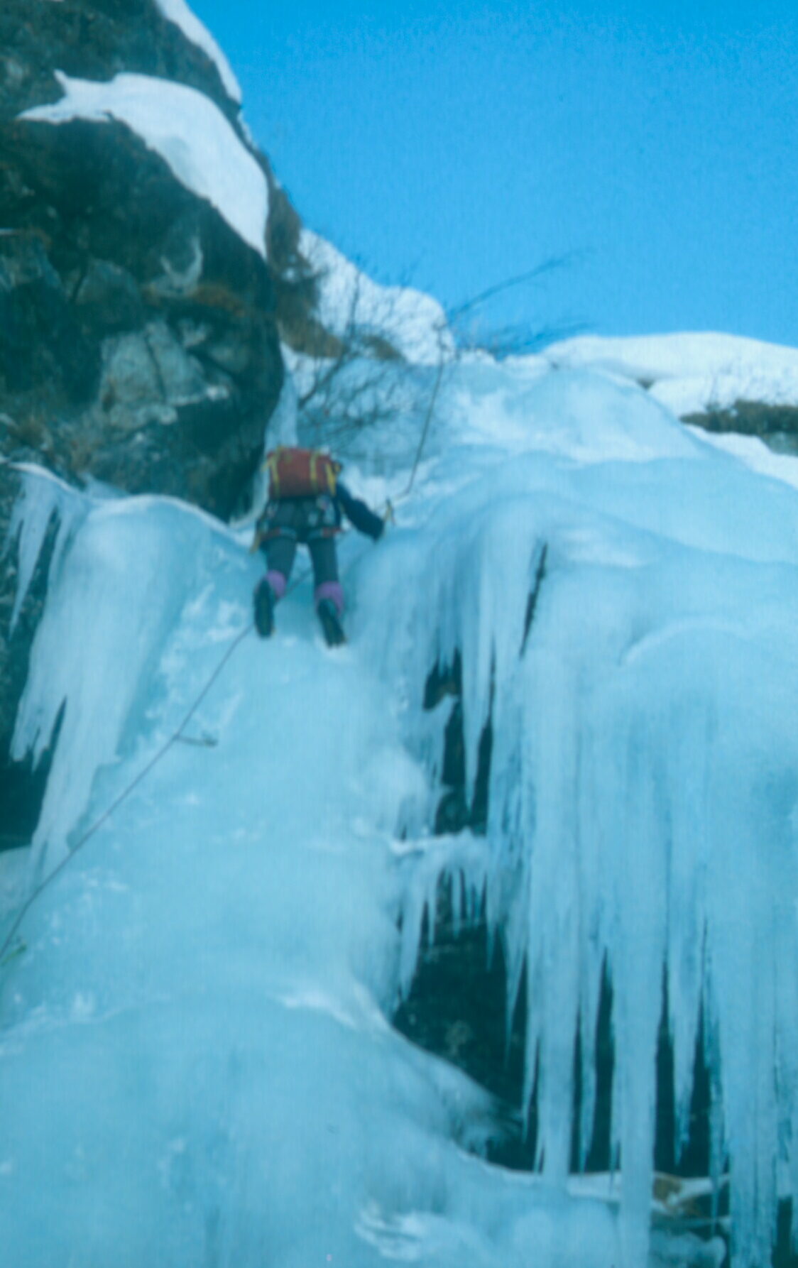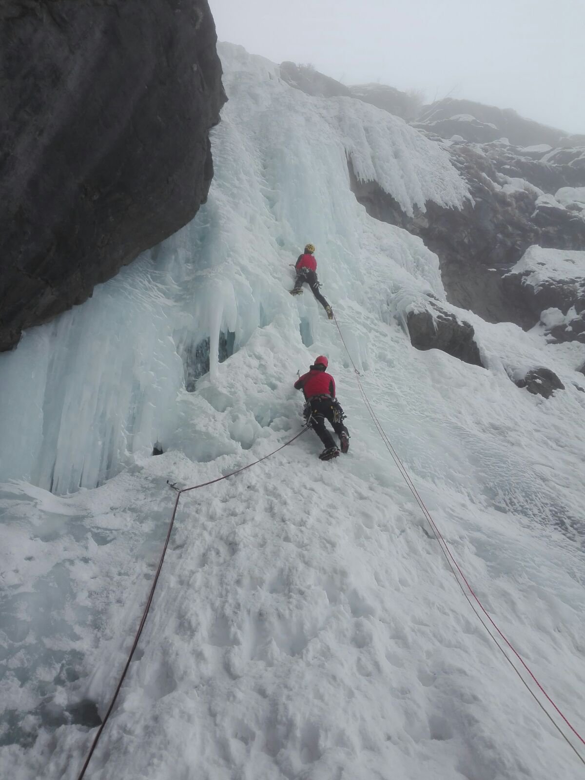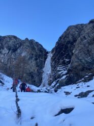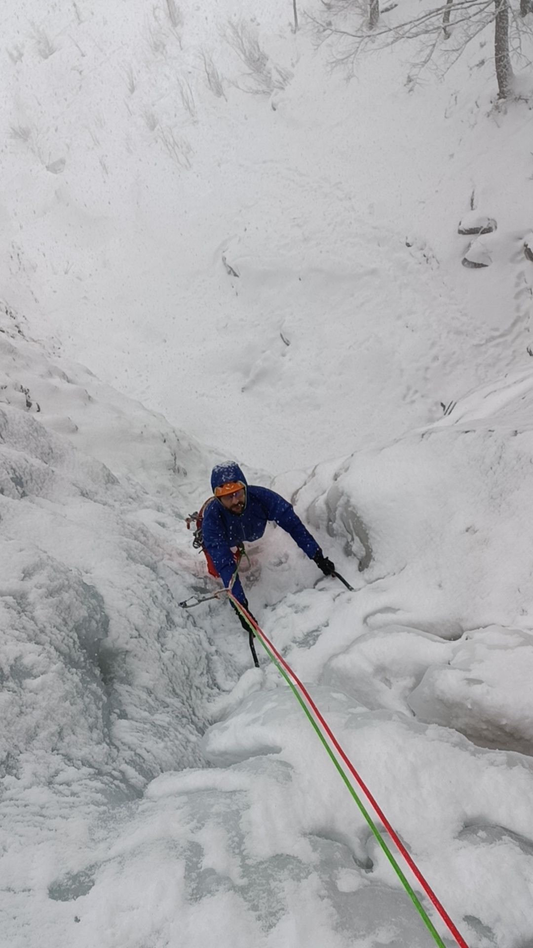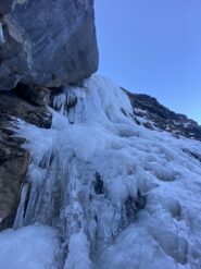 - L2: piccolo salto a 90° poi si esce sul pendio di neve fino alla sosta a fix a dx.