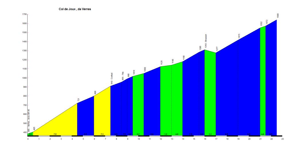 Da Verres, si sale lungo la ss.26 in direzione Aosta per 13 km, prima in piano poi in moderata pendenza, raggiungendo Saint Vincent. Raggiunto il centro del paese si segue in salita una strada che si stacca a destra (indicazioni Sommarese, Col de Joux e altri) superando in breve le terme. Si segue sempre la strada principale, con buona pendenza, che guadagna quota con qualche tornante e lunghi rettilinei. Si tralascia il bivio per Sommarese, Emarese e Col Tzecore, proseguendo dritti su pendenze ora meno impegnative. Superate alcune belle frazioni si giunge al Col de Joux. Da qui ci si tuffa in discesa sulla Val d’Ayas, raggiungendo in 6 km Brusson. Da qui si scende lungo la strada della vallata, con un tratto in falsopiano e poi con discesa più decisa, fino a tornare a Verres.