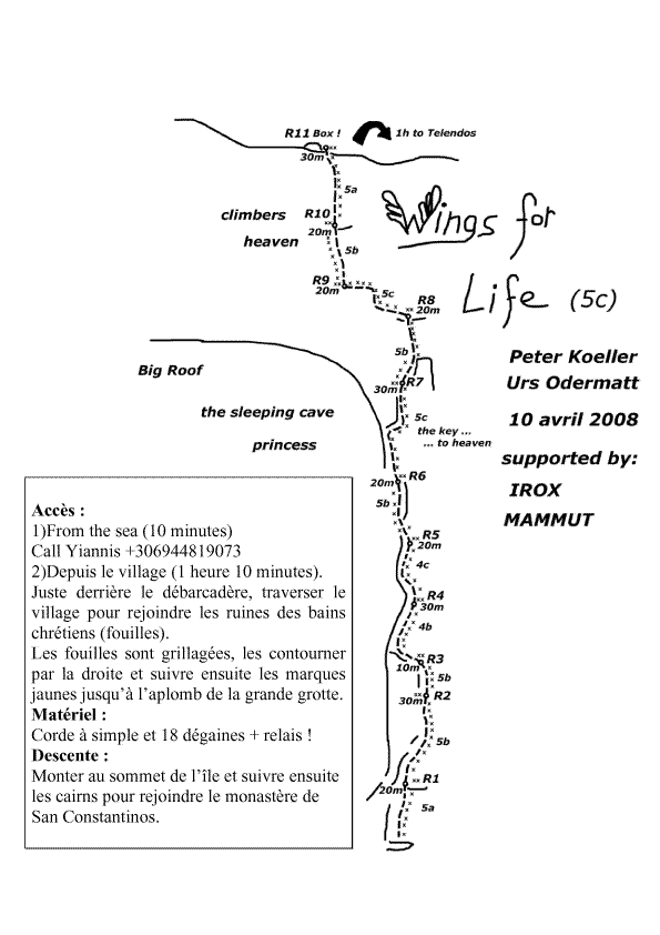 Per arrivare all'attacco ci sono due possibilità: in 10-20 minuti dal mare, per farsi portare in battello chiamare Yannis +306944819073; dal porto di Telendos in 1 ora e 15 minuti a piedi. La via si sviluppa sul pilastro a destra (guardando) della grande caverna con innumerevoli stalattiti detta the sleeping cave princess. Per sentiero seguire i bolli gialli e gli ometti che segnano il sentiero che fa il periplo dell'isola. Dopo circa un'ora dal porto, dopo avere attraversato una zona di grandi blocchi di pietra, partono sulla destra dei bolli rossi che portano alla base della parete. Qui bisogna salire a destra e raggiungere la base della grande caverna. Sulla destra parte la via, contrassegnata col disegno di una Wing (ala).