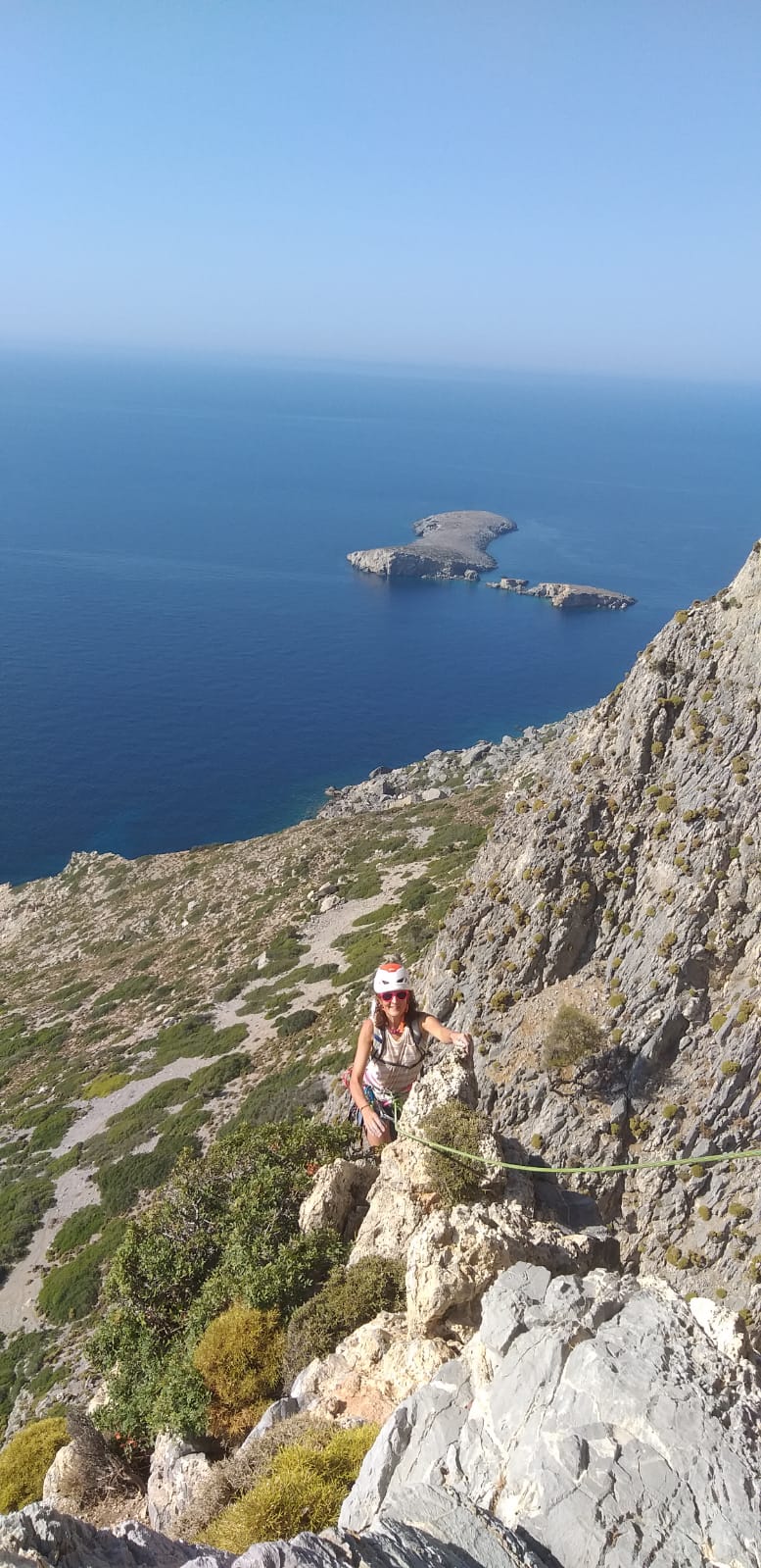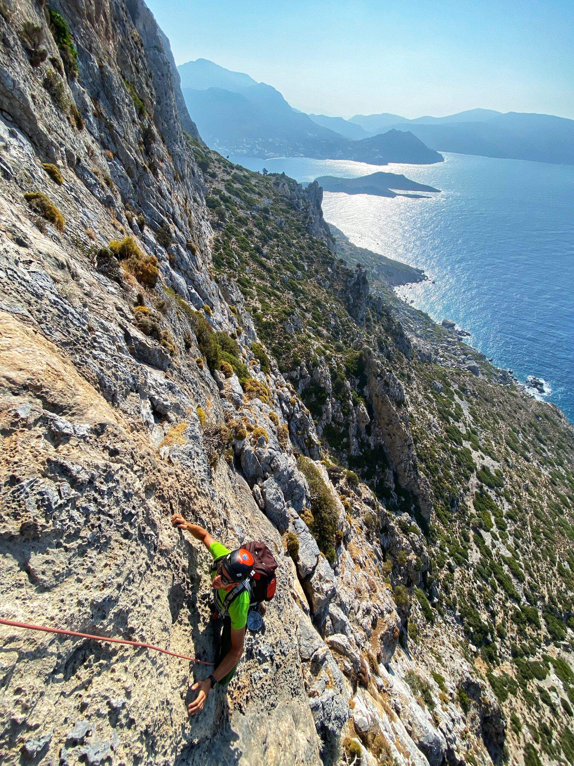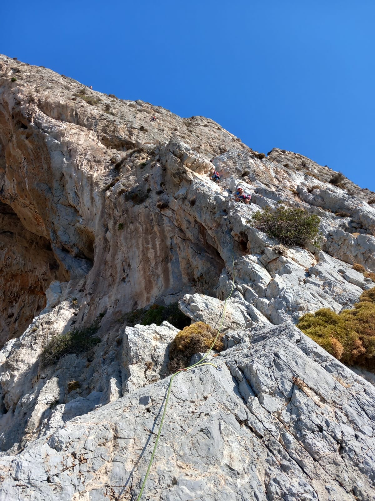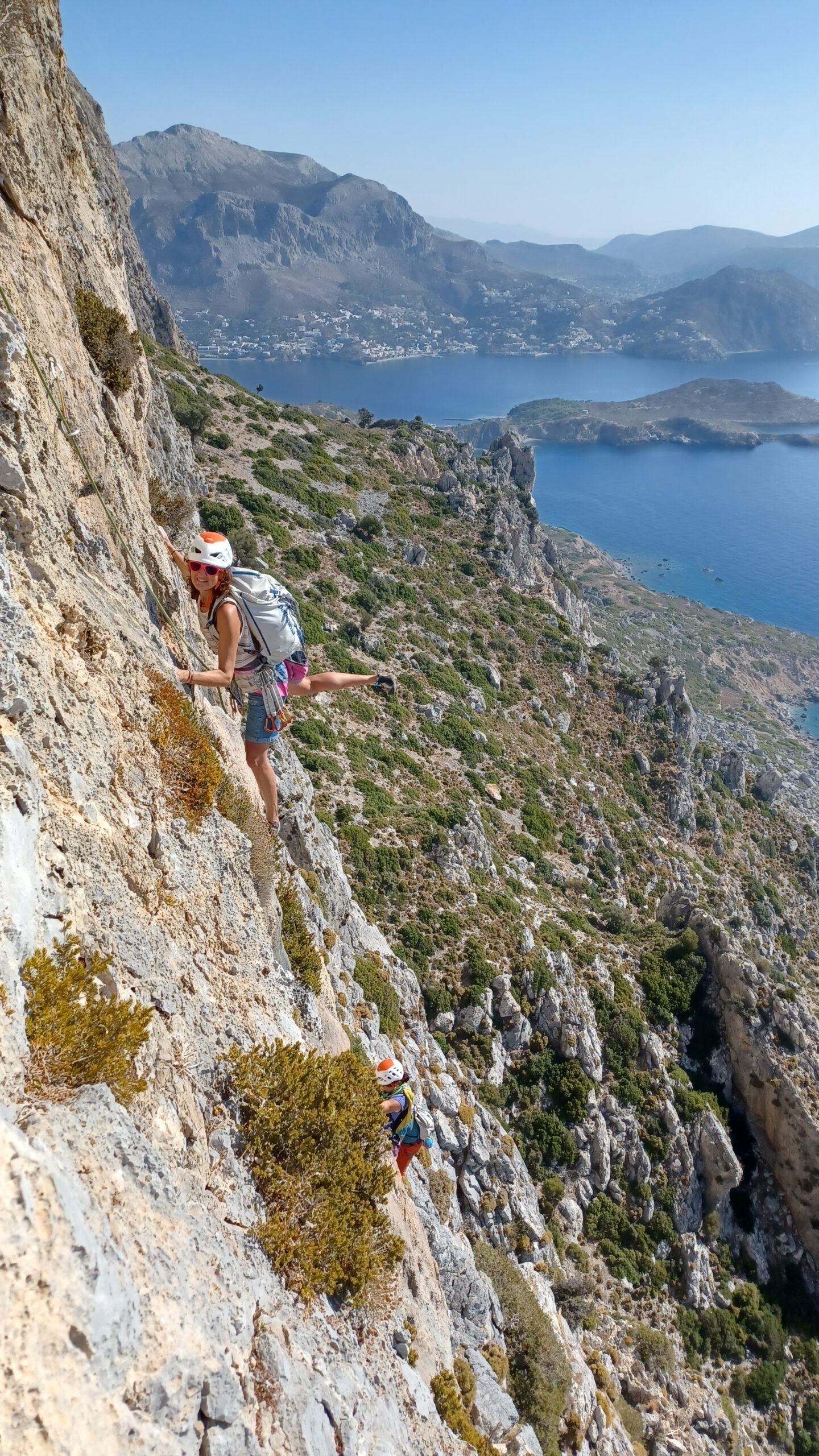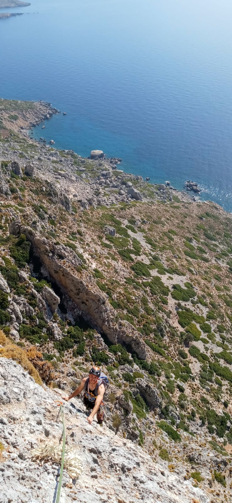 Usciti dall’ultimo tiro (libro di via) si è sulla dorsale che porta alla cima dell’isola di Telendos. Si prosegue verso N verso l’evidente grande sella cercando l’ometto che indica dove scendere. Per facile pendio si scende sempre verso N fino a incrociare il sentiero che, verso destra, porta al monastero di S.Costantino (visibile). Si prosegue poi sino a ritornare al porto di Telendos. 1 ora e mezza almeno la discesa.