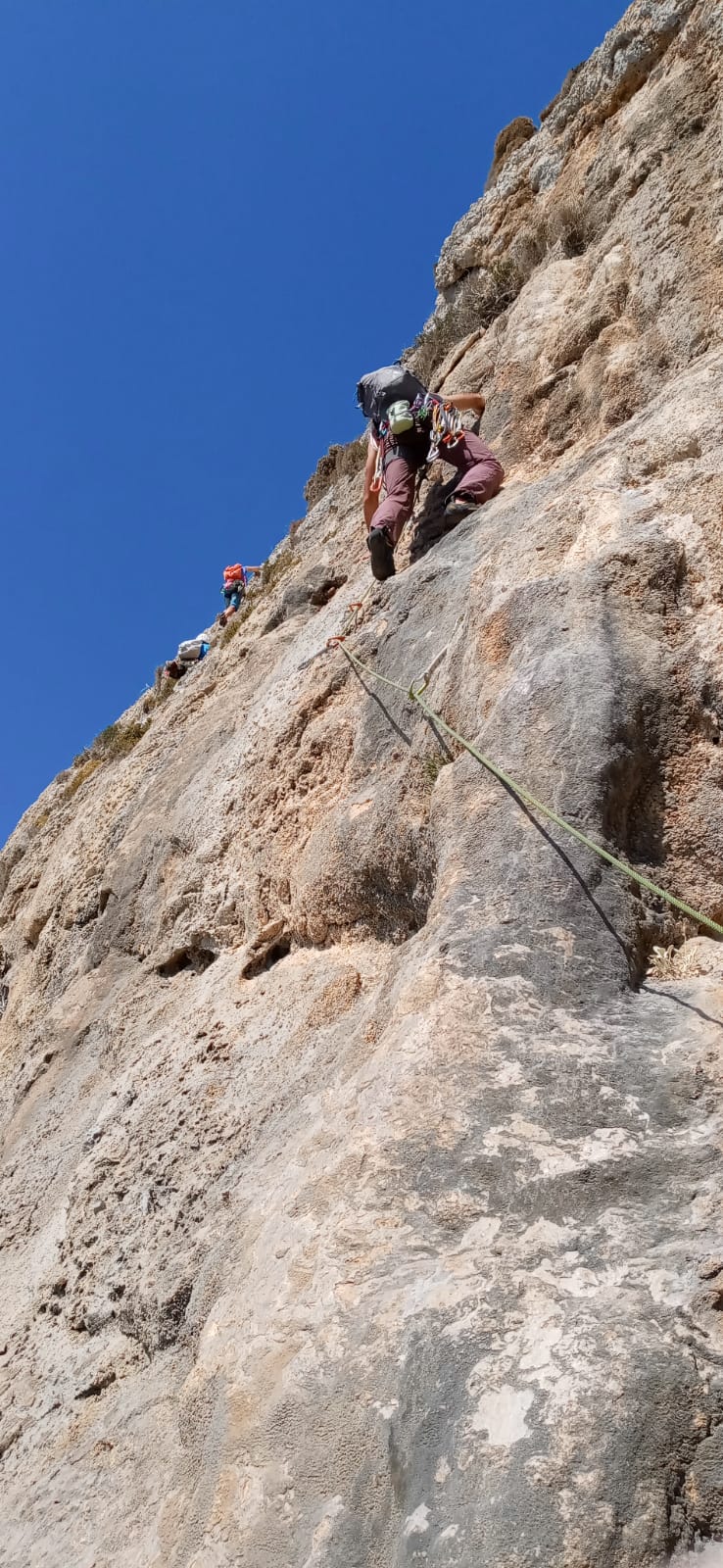 La via è perfettamente attrezzata con fix sia alle soste (2 fix con due anelli da collegare) sia sui tiri, dove i fix permettono una protezione eccellente.