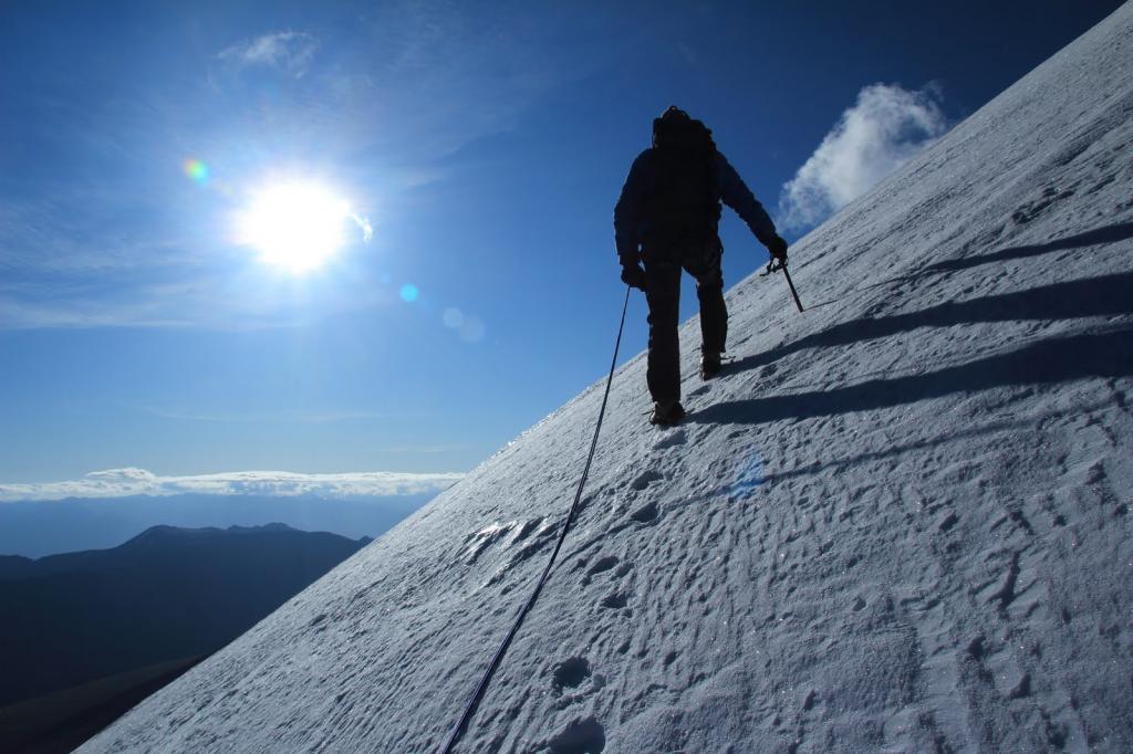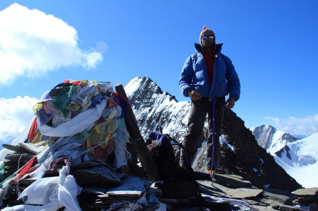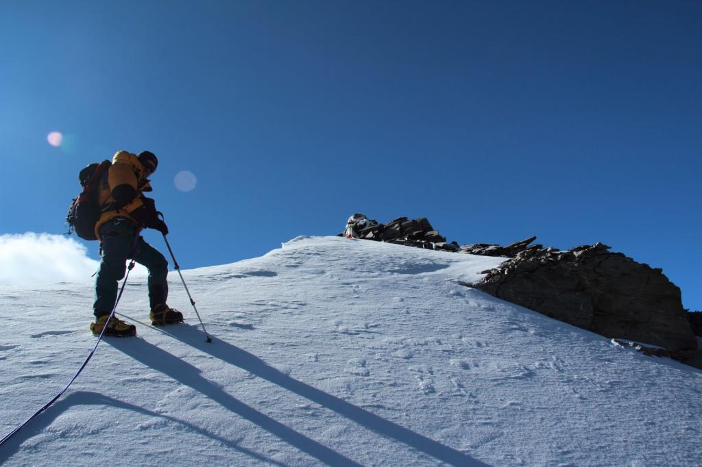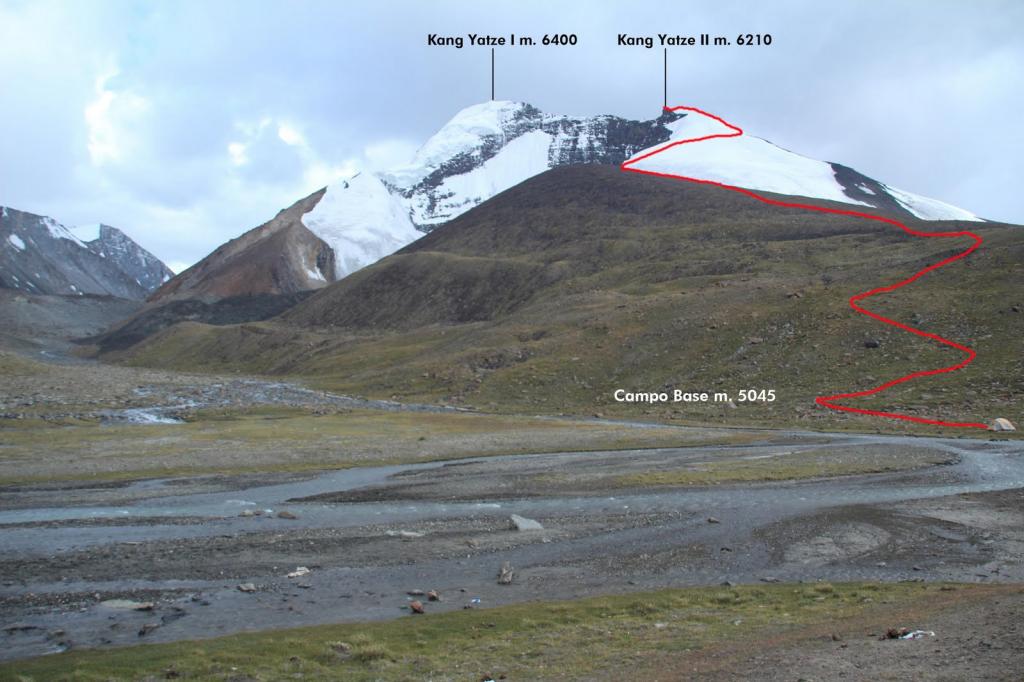 Dal campo si sale la dorsale NE per comoda traccia di sentiero fino a toccare il ghiacciaio (circa 5500 m). Si sale il primo pendio con un traverso verso dx fino a raggiungere la dorsale finale che si segue fino alla cima. Pendenze massime 40°.