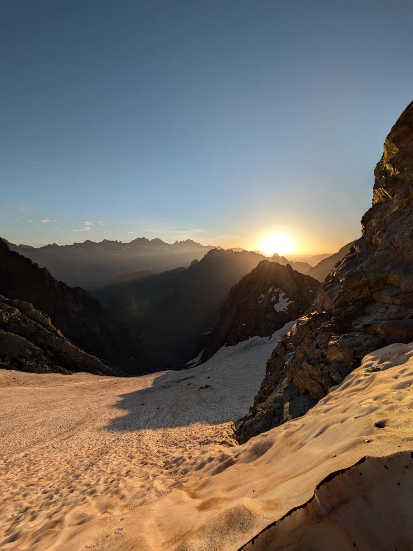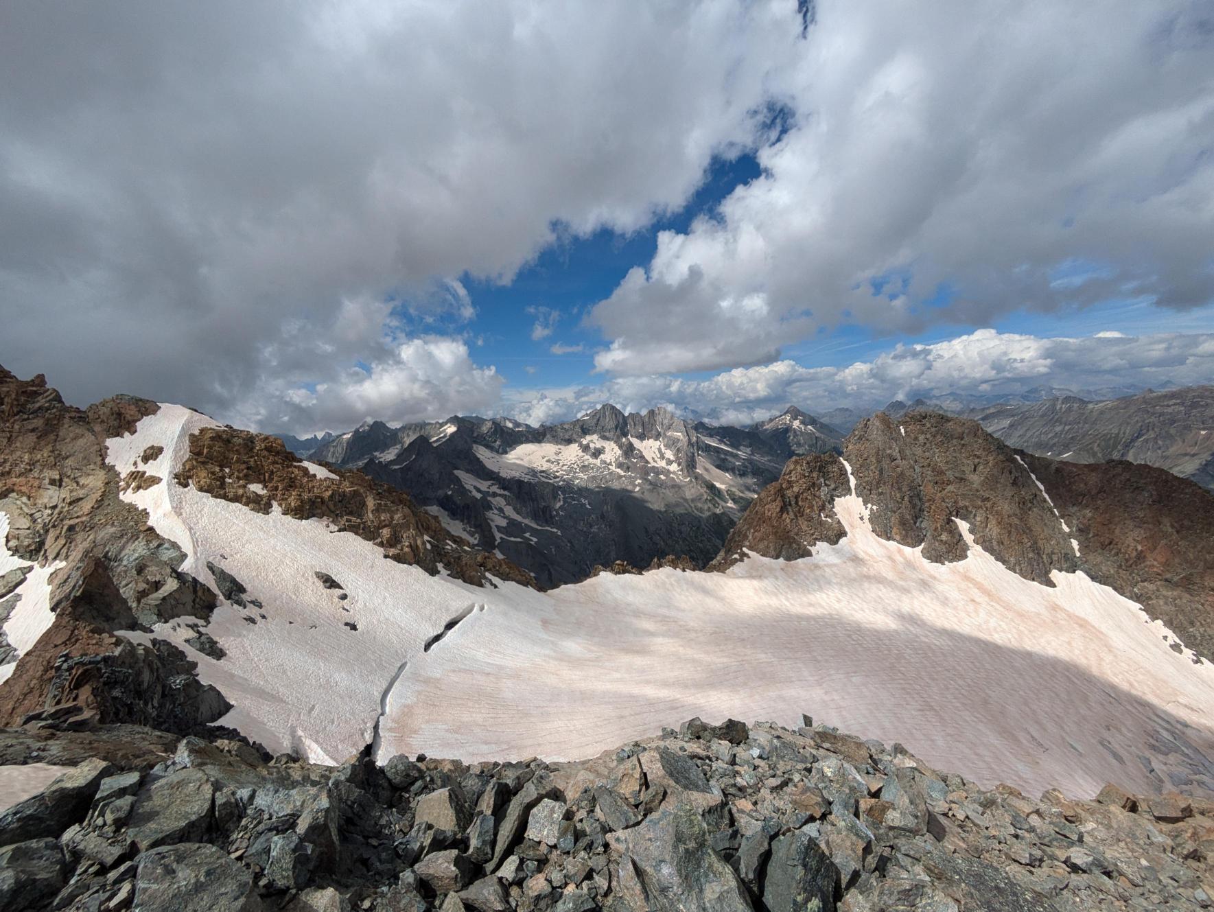 scendere per la cresta N-NE fino a raggiungere il bacino superiore del ghiacciaio della Vergine; riprendere la traccia che sale all’Oggioni fino a tornare al colletto appena sopra il bivacco Taveggia