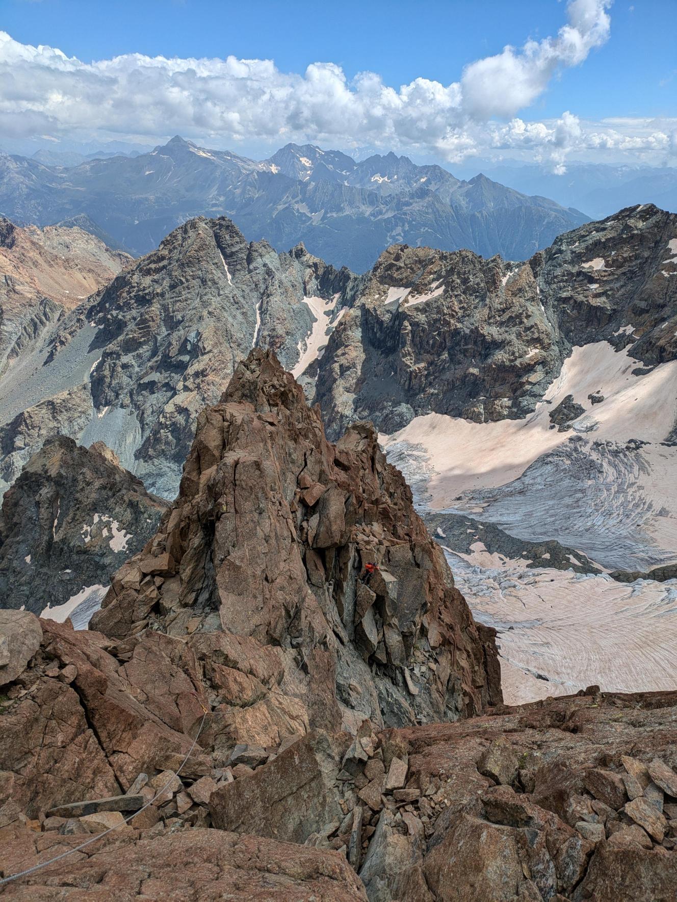 Salire facilmente la placca per due lunghezze proseguendo nei pressi del filo sul versante sud fino a dei gendarmi.