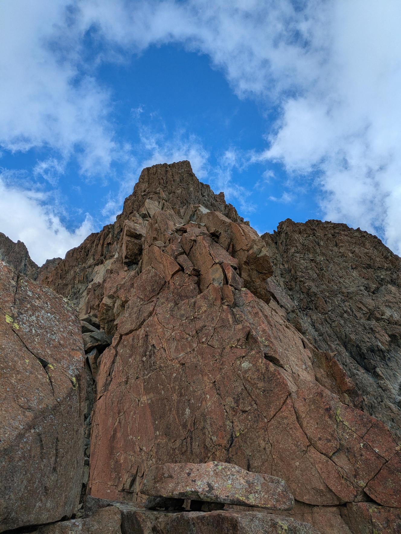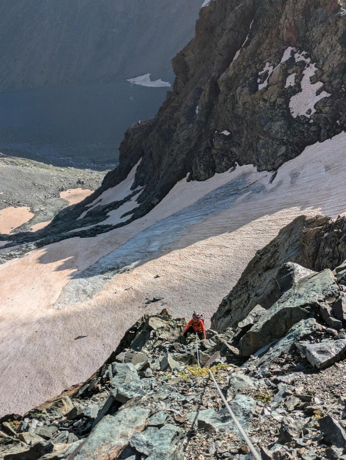 Dall’intaglio risalire una bella placca per circa 40 metri (IV) fino ad un salto verticale che si supera direttamente (2 chiodi; IV) toccando il filo di cresta alla base di una placca adagiata.