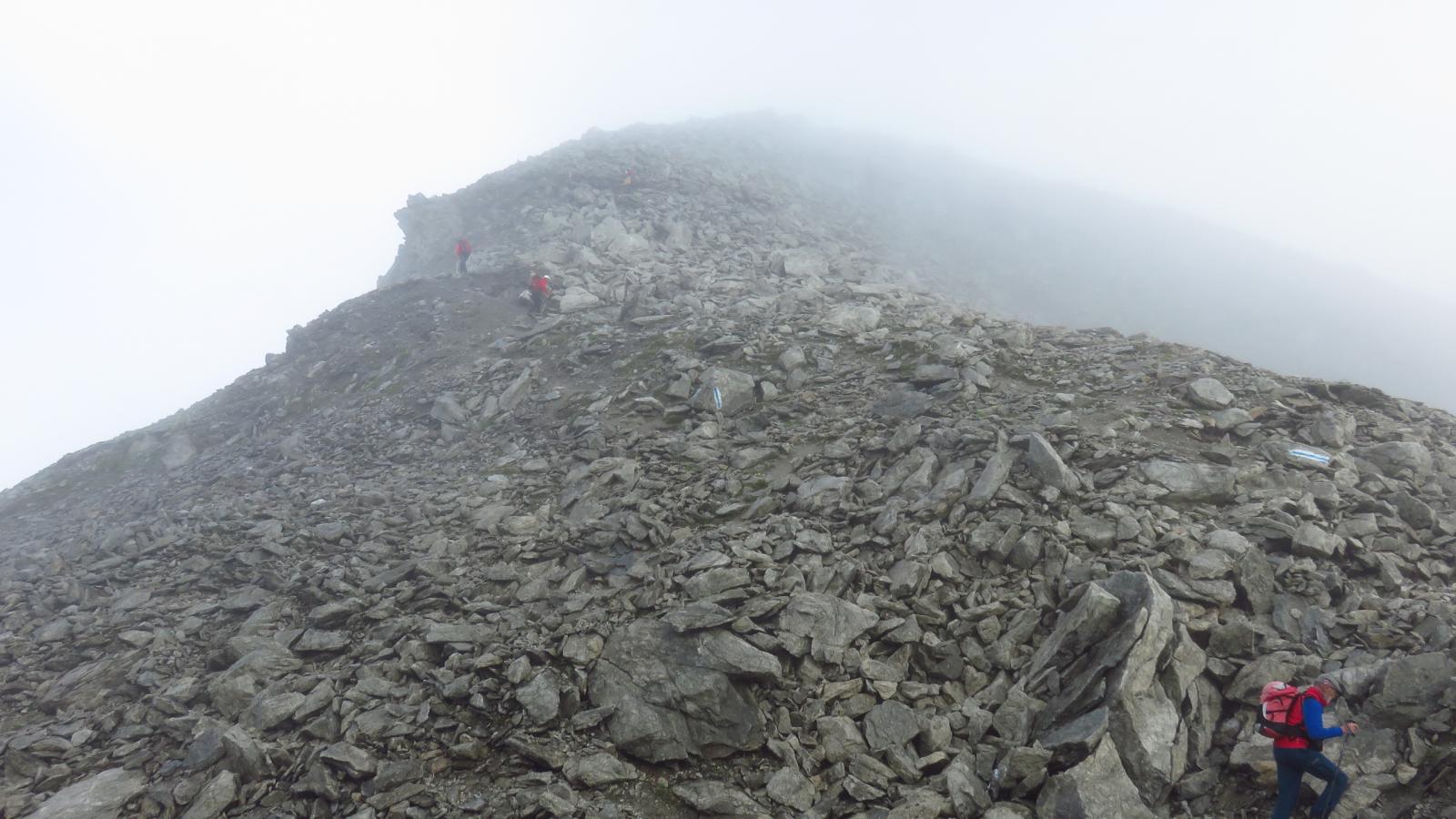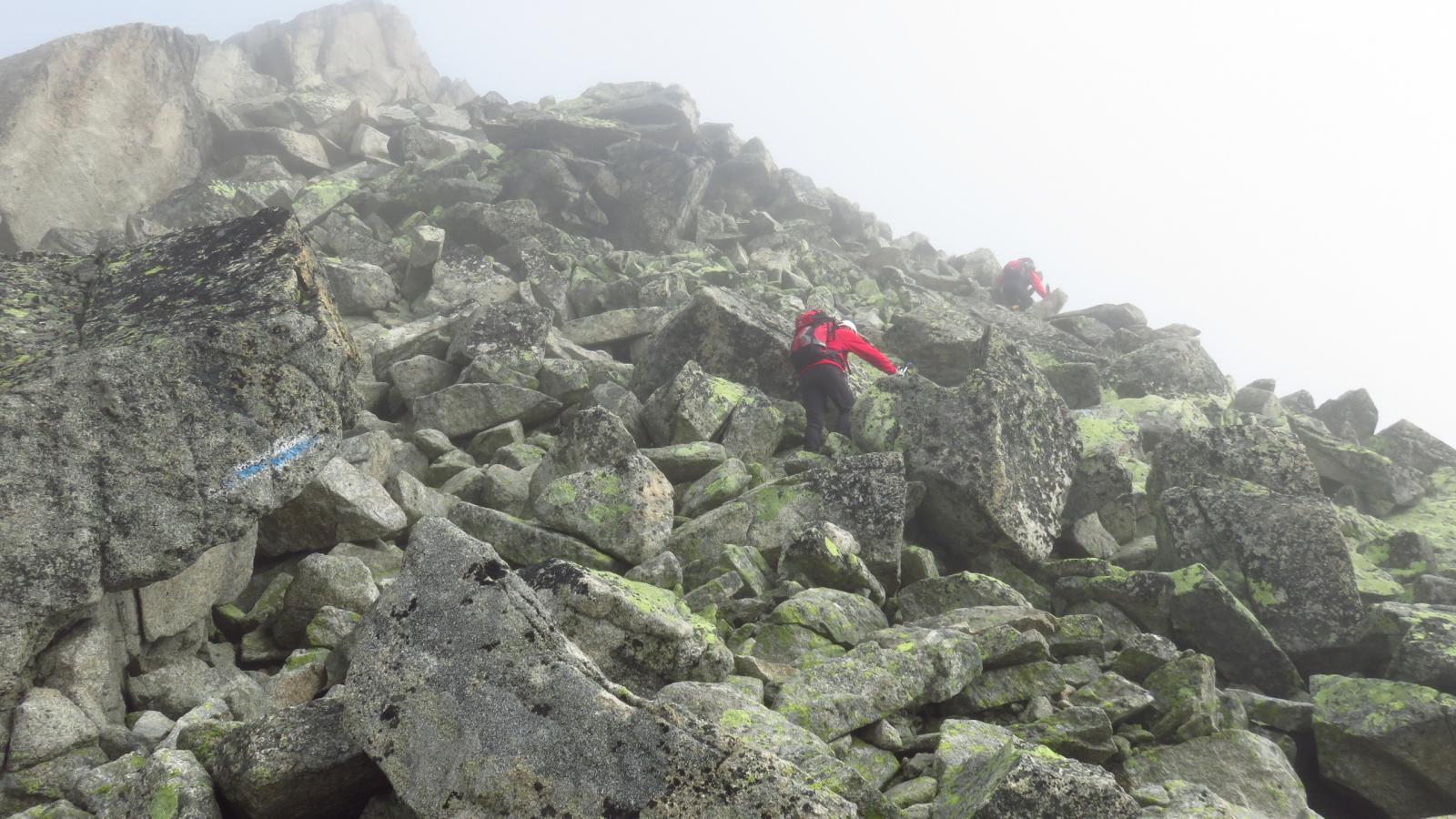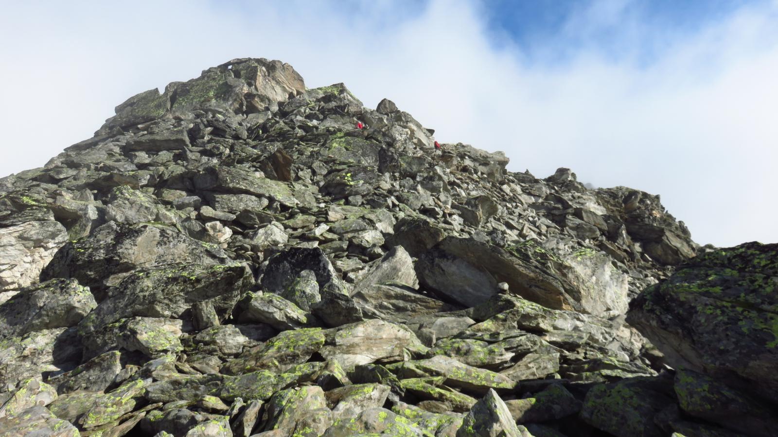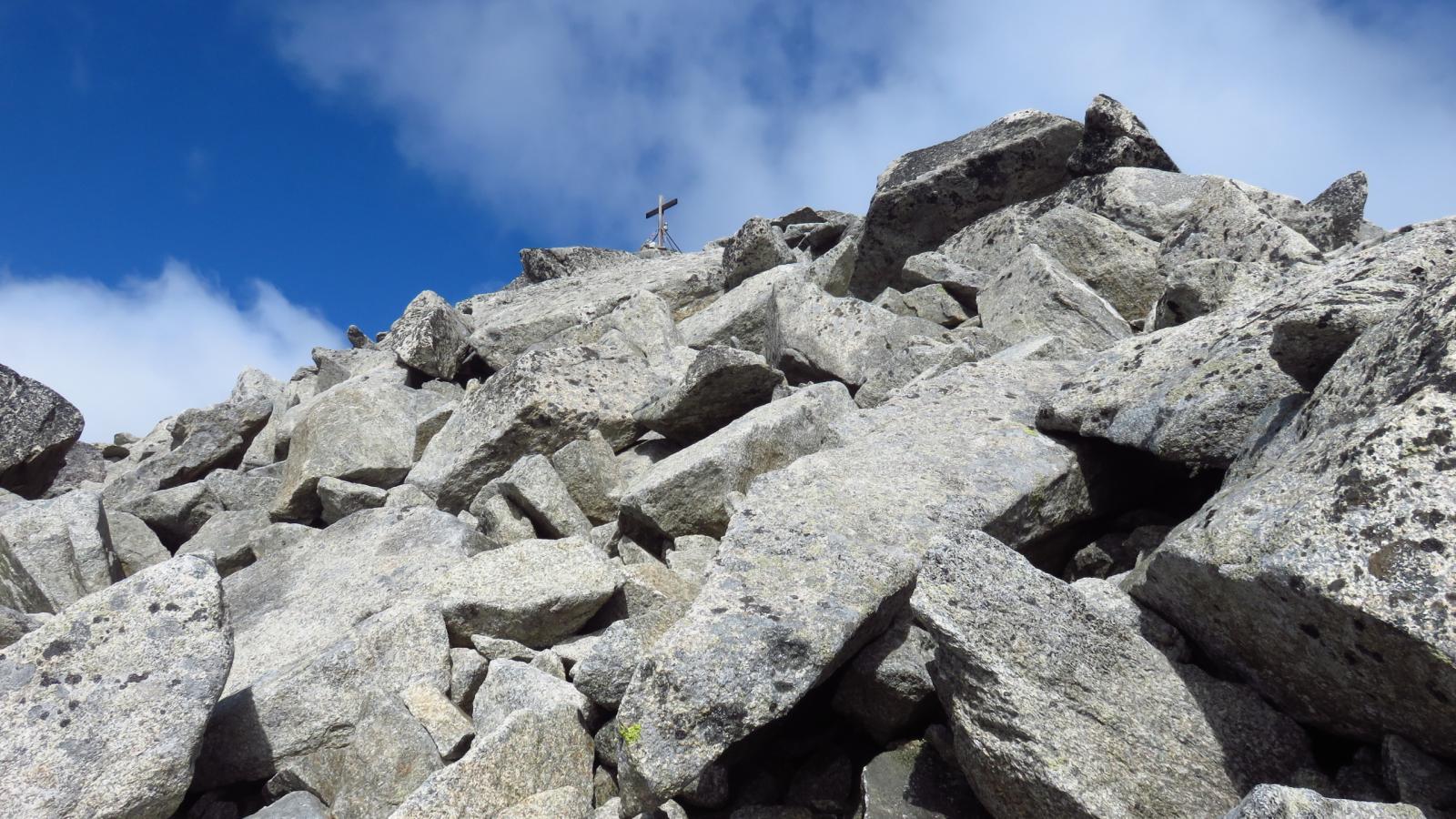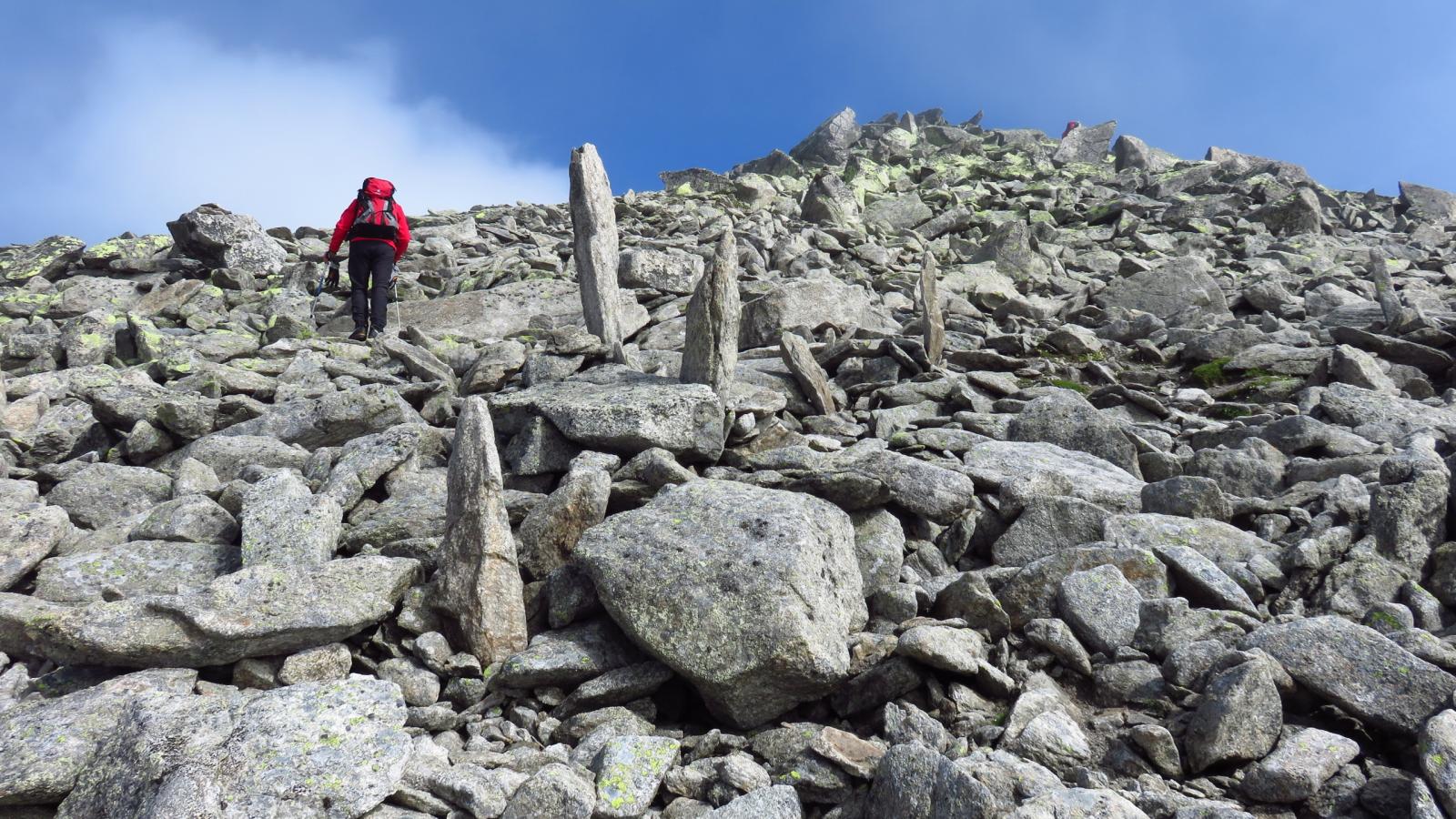 Si scende brevemente su sentiero ad un colletto, dove ha inizio una ripida e vasta pietraia, che però si percorre abbastanza agevolmente. Aiutandosi con le mani in alcuni brevi e facili passi si raggiunge un dosso costituito da grandi pietroni e blocchi rocciosi, da dove il sentierino risale il tratto finale della cresta, con la vetta ben visibile davanti a noi. Superati alcuni gradini rocciosi e pietroni si raggiunge infine la cima, dove si trovano una croce di legno con il quaderno di vetta e due ometti di pietre.
