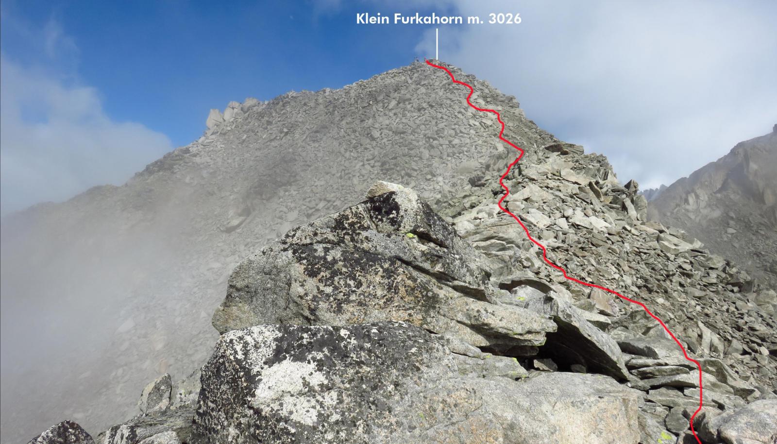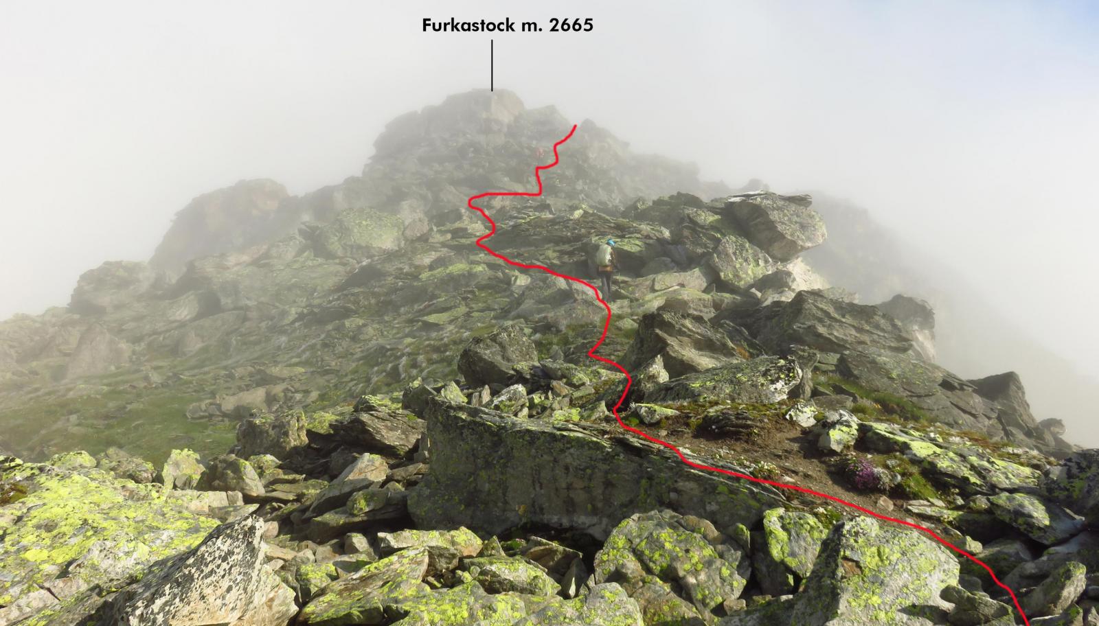 Si sale lungo il sentiero che sale il pendio erboso in diagonale verso destra sopra la costruzione abbandonata, con alcune serpentine da destra a sinistra si guadagna rapidamente quota, trascurato un primo bivio verso destra, si piega a destra e su terreno ripido (china erbosa e detritica) che nella parte alta è percorso da una traccia di sentiero non sempre molto visibile, raggiungendo infine la larga dorsale SE che in breve porta alla cima del Furkastock 2665 m dove si trova una vecchio impianto di risalita.