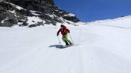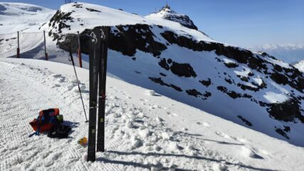 Siamo saliti partendo dal Cretaz . La neve è ancora presente da quota 2100 , poi un tratto a piedi e neve continua sopra i 2200 . Con qualche deviazione si riesce a non togliere gli sci ( strada di servizio pulita ) ma ancora per poco . Da 2600/2700 la neve sulle piste è ancora più che sufficiente e di buona qualità .