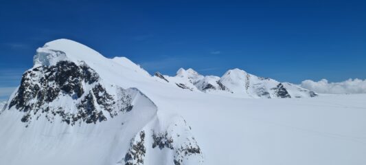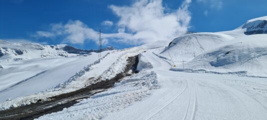 Partenza alle 9 dal parcheggio impianti. La neve inizia da subito, abbondante. Piste gattate alla perfezione. Come ogni anno stanno sbancando (metto foto). Giornata senza vento, la neve in discesa era un pò molle, ma sempre ben sciabile. Anto ha salito il Breithorn, traccia perfetta, tutto chiuso ma neve brutta, crostosa.