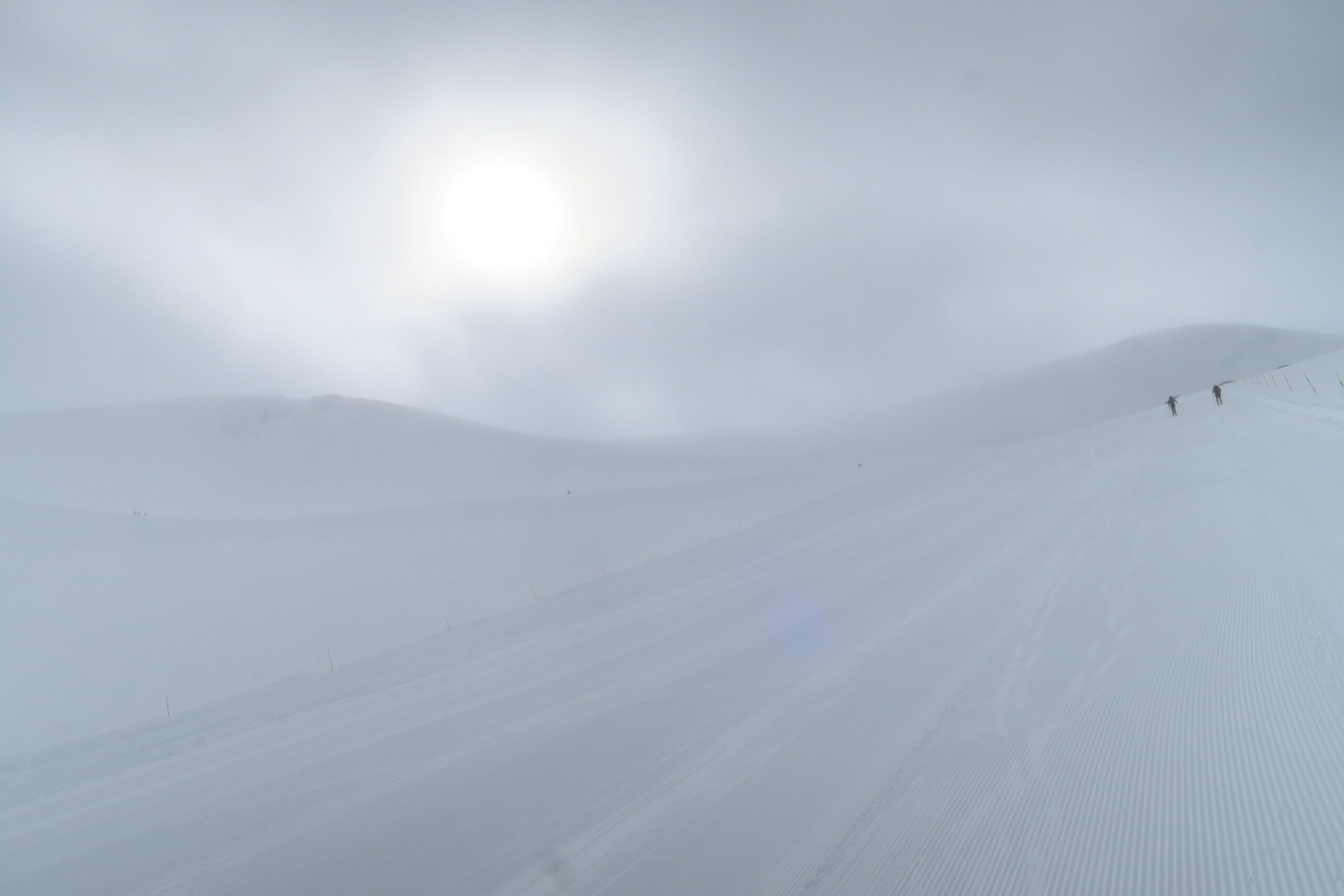 Ripartiti con le nuvole, piste ancora chiuse lato svizzero, lavori di battitura in corso.
