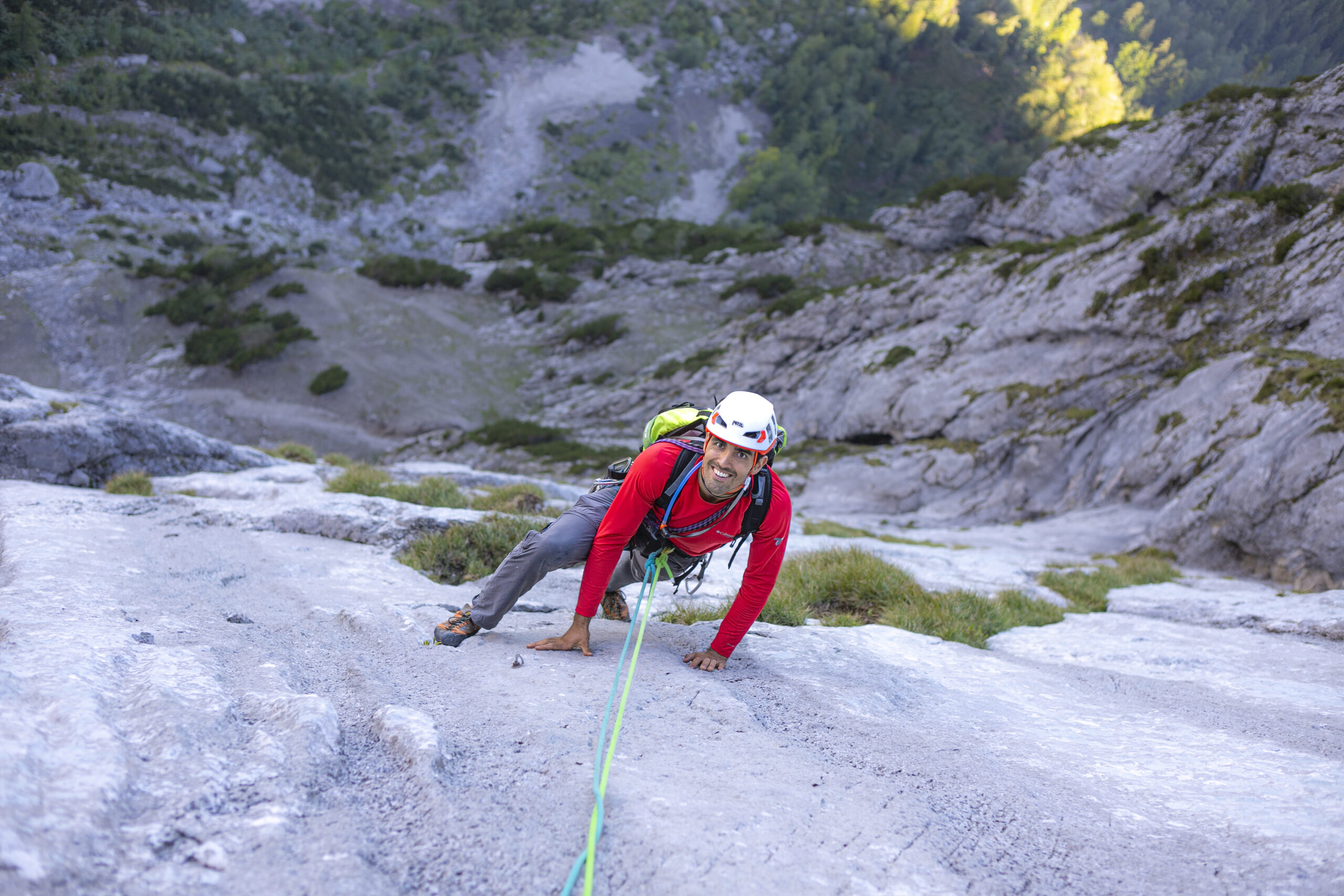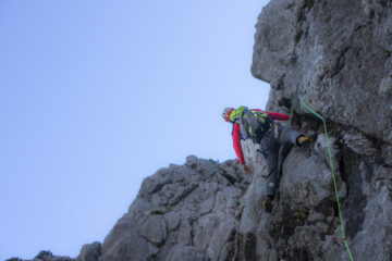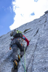Via molto bella! L’apoteosi delle rigole. Abbiamo impiegato 9 ore per percorrerla tutta, non abbiamo mai usato i friend e neppure i nut. Sconsiglio di portarsi delle protezioni veloci, bastano rinvii e fettucce. La via è abbastanza protetta nei passaggi più tecnici, ma è meglio non cadere, richiede una buona dose di ingaggio. Nella parte bassa la roccia non è sempre solida, bisogna fare attenzione, soprattutto con delle cordate sotto. L’avvicinamento dall’auto non è così breve, dopo aver raggiunto il rifugio, comincia il sentiero che va preso tutto a destra, traccia che comincia subito nel bosco, sentiero terroso, fate attenzione a non sbagliare, non dovete proseguire per lo sterrato. Abbiamo dormito in tenda a poca distanza dalla parete, in prossimità dell’omino che segnala il bivio per la traccia che conduce alla parete. Il punto è ideale per bivaccare perchè è a poca distanza dalla fonte d’acqua, dove si possono ricaricare le borracce prima della salita. (non vi era abbastanza spazio per posizionare la tenda, per cui ci siamo ricavati una piazzola scavando tra i sassi). Siamo partiti alle 7 dalla tenda, dopo un lungo traverso abbiamo raggiunto l’attacco alle 7,30, la via è l’ultima a sinistra guardando la parete, si riconosce da un grosso omino alla base, si risale un canale e si ci ritrova davanti a una sosta con vecchi cordoni allego foto. Siamo arrivati in vetta alle 16,30. La via rimane tutta la mattina all’ombra. Le prime lunghezze le abbiamo trovate bagnate, non è stato facile superare alcuni passaggi di placca poco protetti con le scarpette bagnate, forse è stato più difficile superare i V al mattino che i tiri di VII- del pomeriggio. La discesa è super segnalata con bollini rossi, ben attrezzata con cavo d’acciaio. alle 20 eravamo giù al rifugio dopo aver smontato la tenda ci siamo diretti al rifugio dove ci hanno riservato una calorosa accoglienza, la rifugista è molto gentile, ci ha fatto fare una super colazione con il bis! Con il fortissimo Fabio, che qui è di casa ora mai, in alterno.