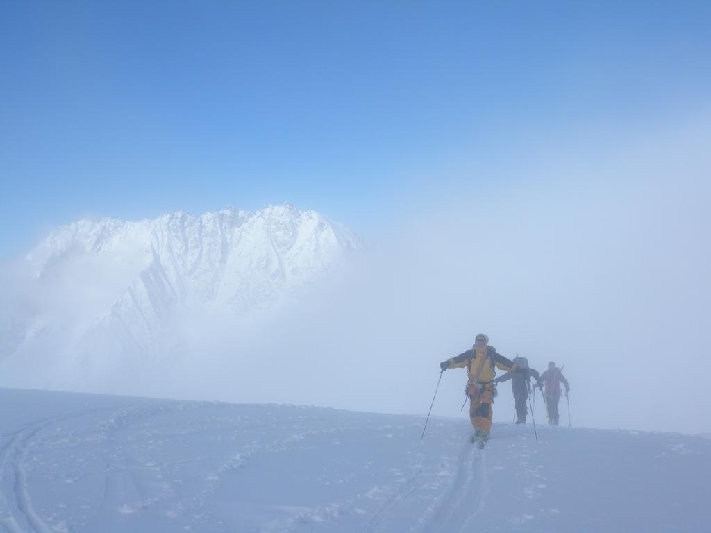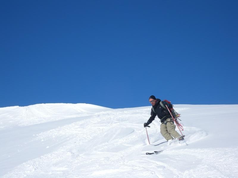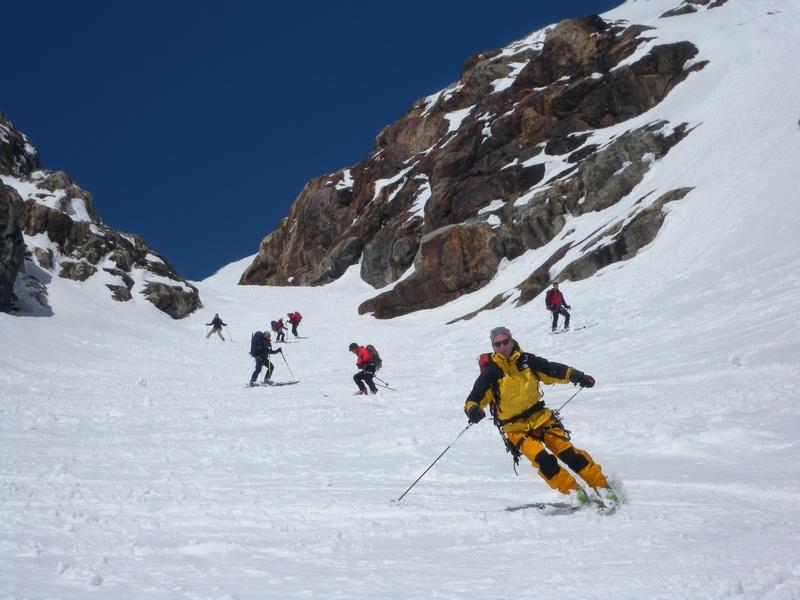 avvicinamento molto lungo al rif. Nacamuli; prima 3,5 km per arrivare alla diga, poi altri 4 per arrivare in fondo al lago e poi si inizia a salire verso il rifugio, ancora con notevole sviluppo.stamattina partiti col brutto tempo e visibilità quasi nulla dai 2900 m in su; saliti completamente in strumentale, col gps, fino a circa 3400 m quando finalmente la nebbia si è dissolta e si è aperto un panorama mozzafiato. Discesi sul gh del M Brulè, bellissimo il primo ripido pendio. dalla quota 2901 si scende sul fondo del vallone e non sulla sx come riportano certe carte. poi a circa 2400 m, invece di portarsi a dx in leggera ascesa come riportano carte e relazioni, ci siamo tenuti a sx in corrispondenza del sentiero n°9 e per pendii ripidi ed esposti si raggiunge il fondovalle circa 1,5 km a monte di Prarayer. Impercorribile e pericoloso per valanghe il fondo valle da quota 2400 in giù ( ci sono tracce ma non sono da seguire )