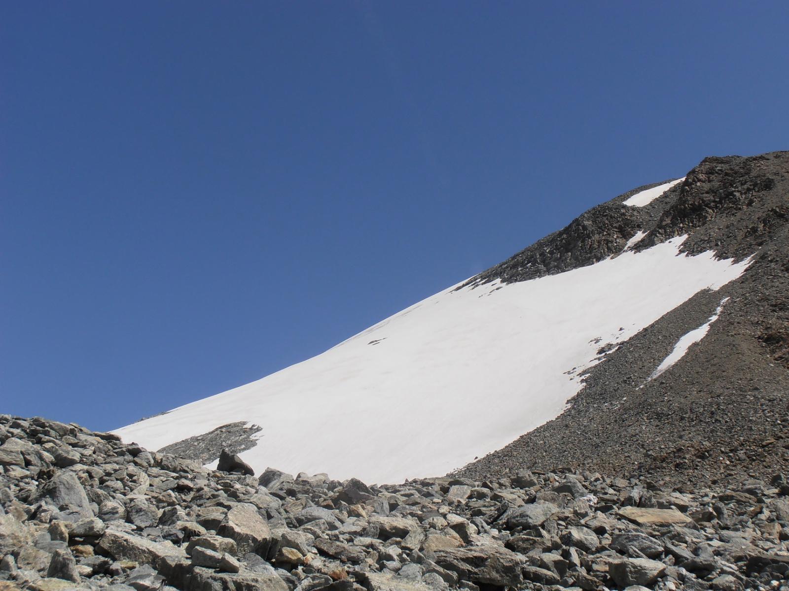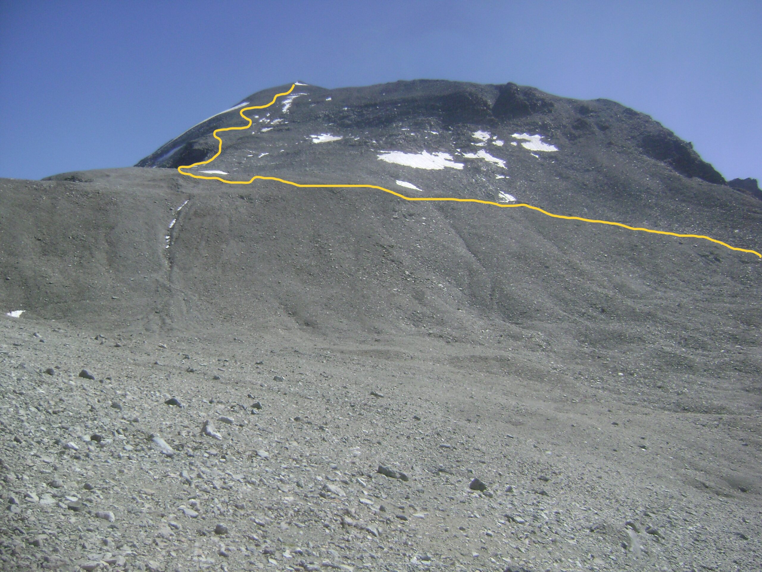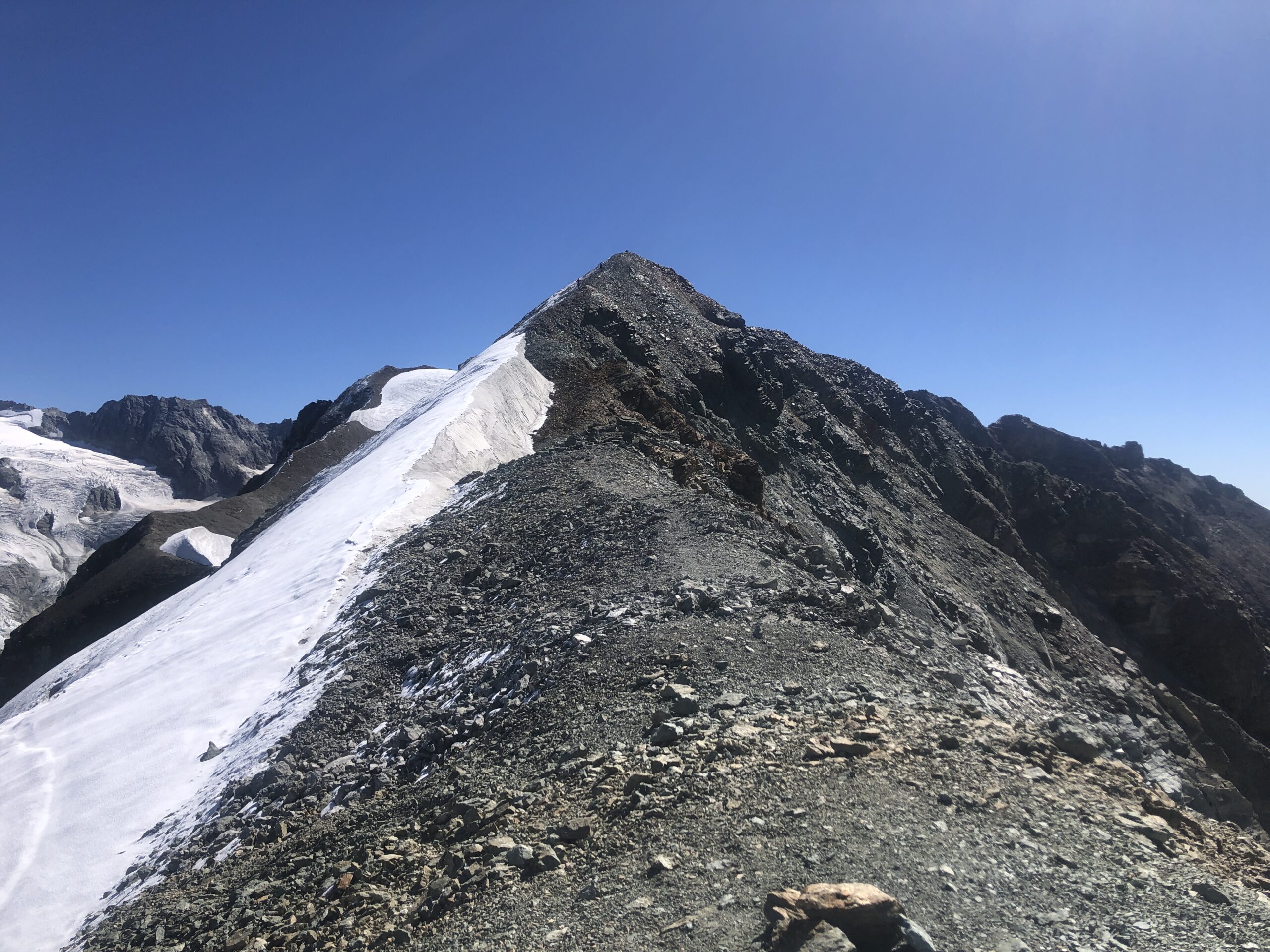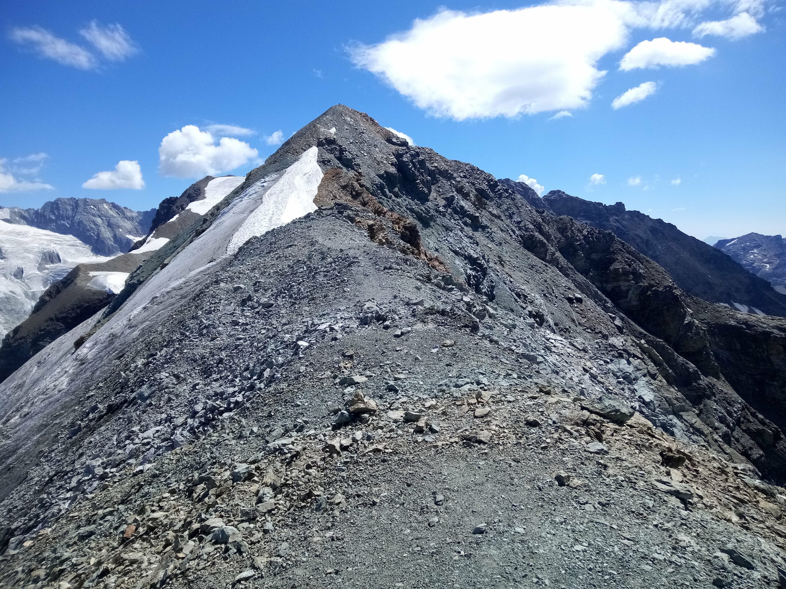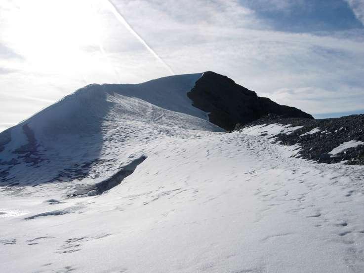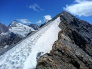 Si sale ora senza percorso obbligato il ripido pendio di neve a inizio stagione o di detriti un po’ faticosi a fine estate, raggiungendo la spianata della dorsale ovest dove si possono incontrare glacio-nevai residui. Si sale ancora fino ad un dosso che si può considerare l’anticima dove ha origine il breve tratto di cresta conclusivo; qui la cresta diventa più stretta (non esposta ma un po’ aggettante per il salto sul lato italiano e lo scivolo sul versante svizzero), comunque il percorso è in scarsa pendenza e non si incontrano ostacoli fino a raggiungere l’ometto della cima 3496 m.