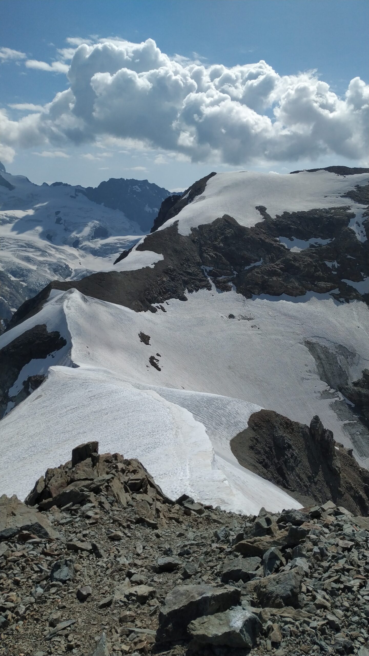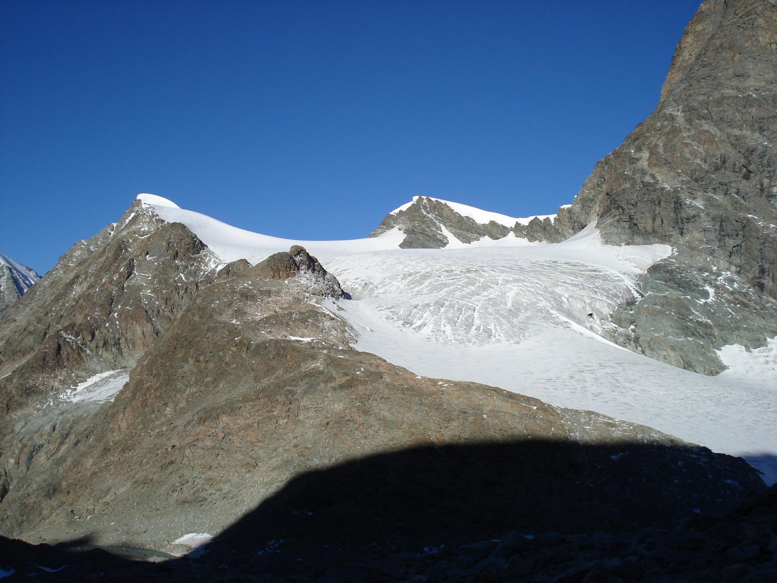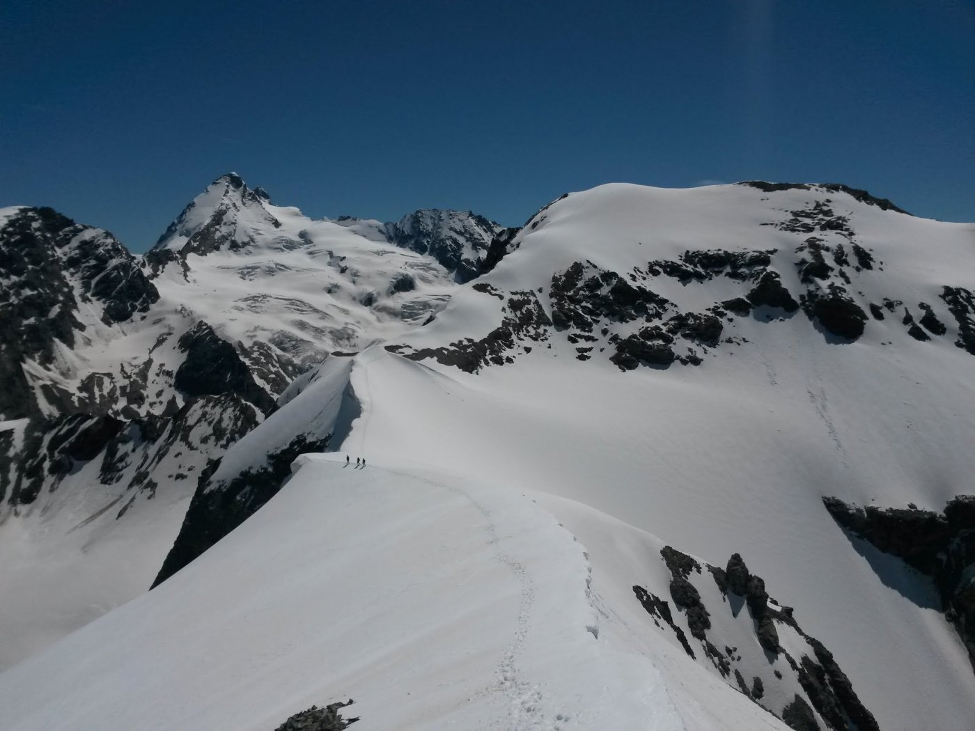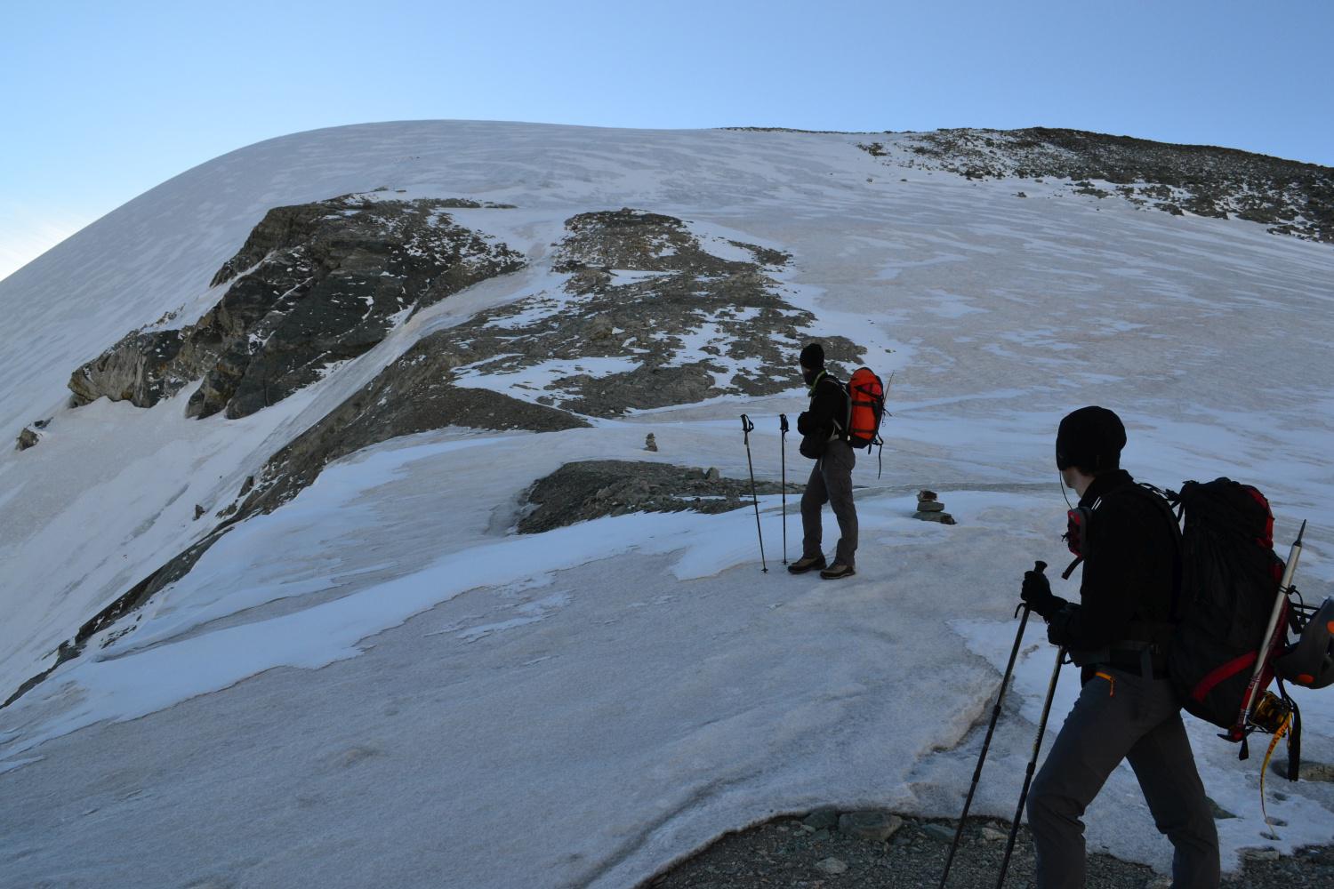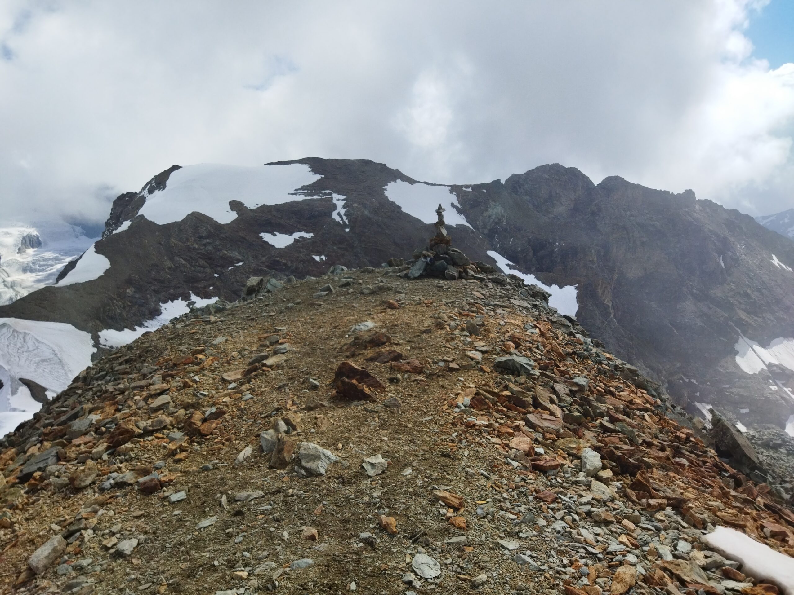 Si sale ora senza percorso obbligato il ripido pendio di neve a inizio stagione o di detriti un po’ faticosi a fine estate, raggiungendo la spianata della dorsale ovest dove si possono incontrare glacio-nevai residui. Si sale ancora fino ad un dosso che si può considerare l’anticima dove ha origine il breve tratto di cresta conclusivo; qui la cresta diventa più stretta (non esposta ma un po’ aggettante per il salto sul lato italiano e lo scivolo sul versante svizzero), comunque il percorso è in scarsa pendenza e non si incontrano ostacoli fino a raggiungere l’ometto della cima 3496 m.